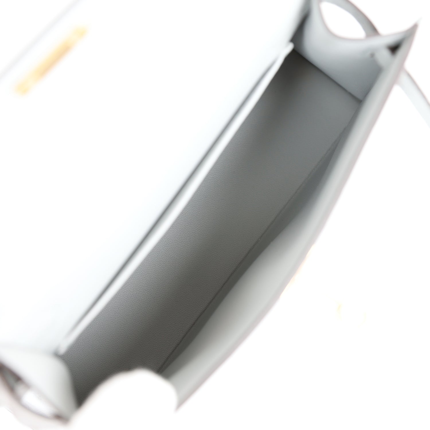 The interior is lined with bleu glacier leather and has one open pocket on the back wall.