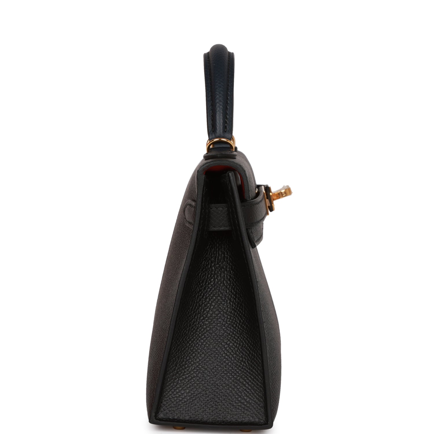 This Casaque Kelly, in the Sellier style, is in Bleu Indigo and Black epsom leather with gold hardware and has tonal stitching, two front straps with front toggle closure, single rolled handle and removable shoulder strap.