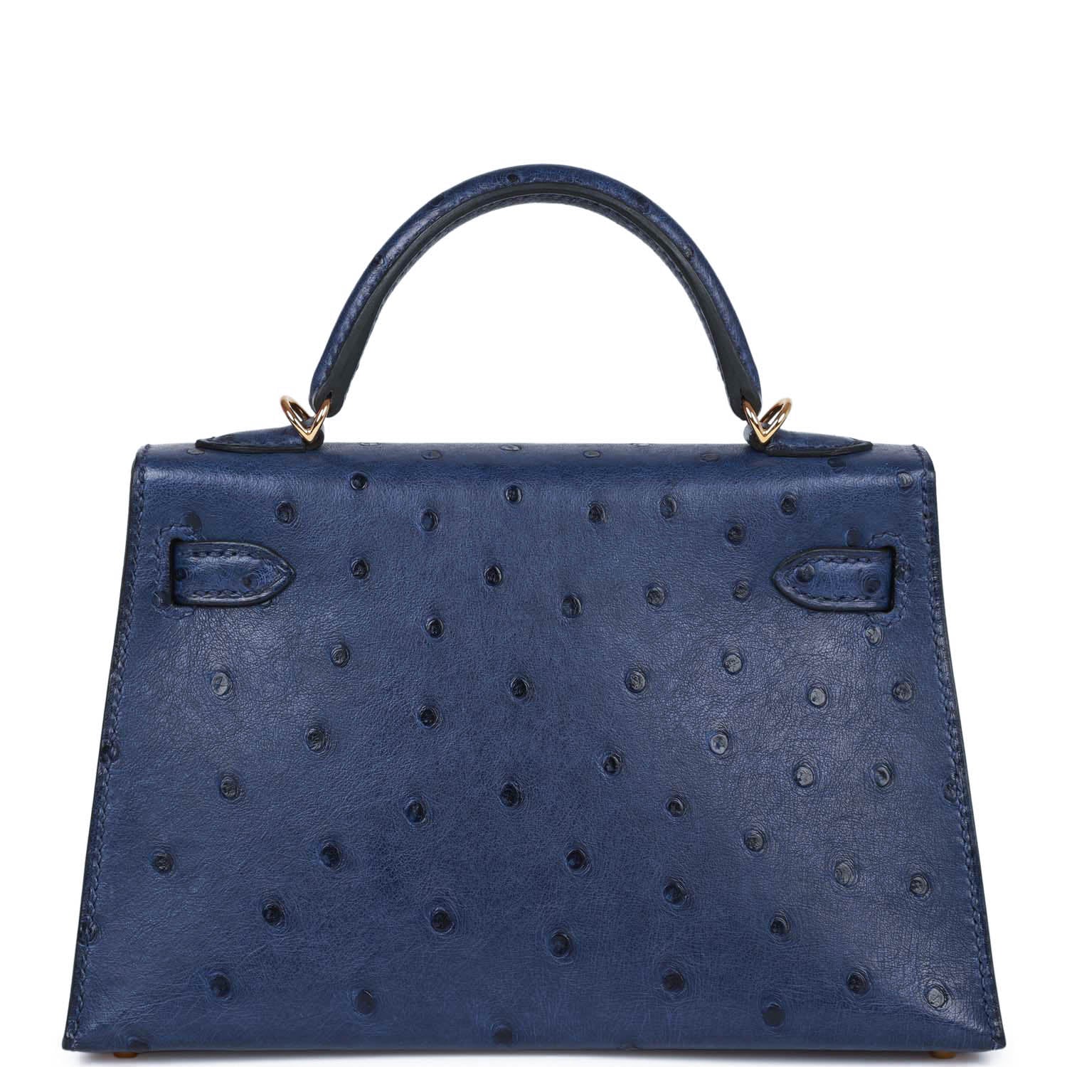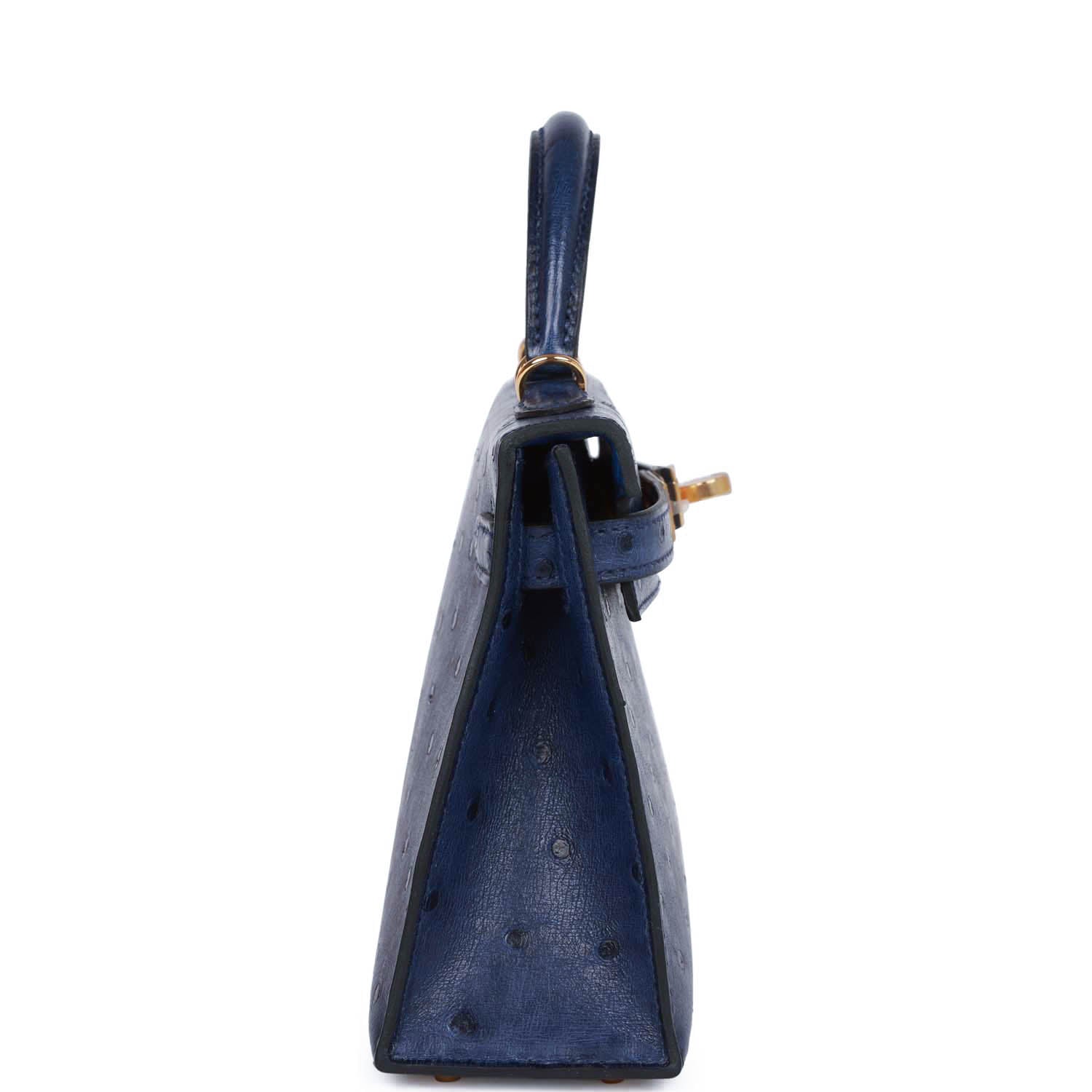 This tiny Kelly, in the Sellier style, is in Bleu Saphir ostrich leather with gold hardware and has tonal stitching, two front straps with front toggle closure, single rolled handle and removable shoulder strap.