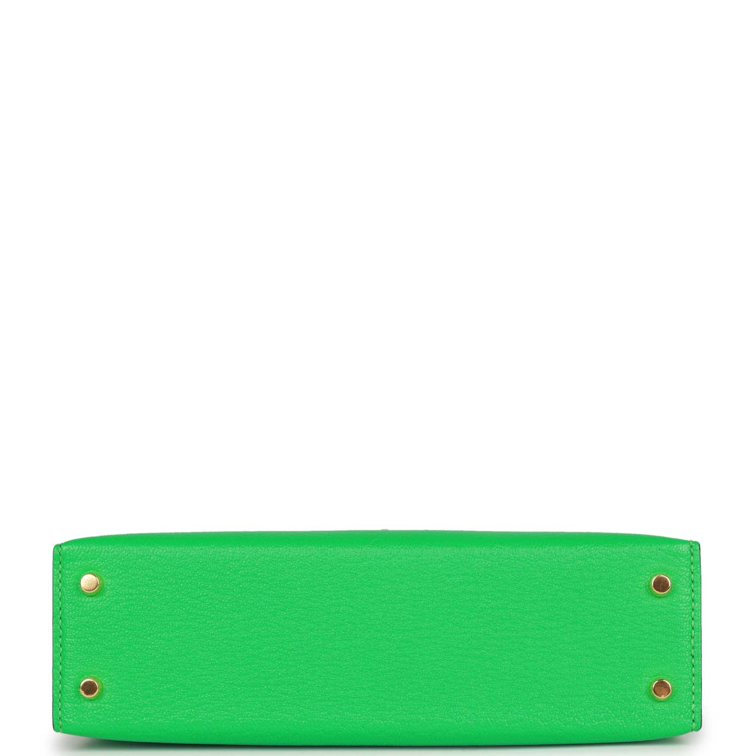 This tiny Kelly is in Vert Comics chevre leather with gold hardware, has tonal stitching, two front straps with front toggle closure, single rolled handle and removable shoulder strap.