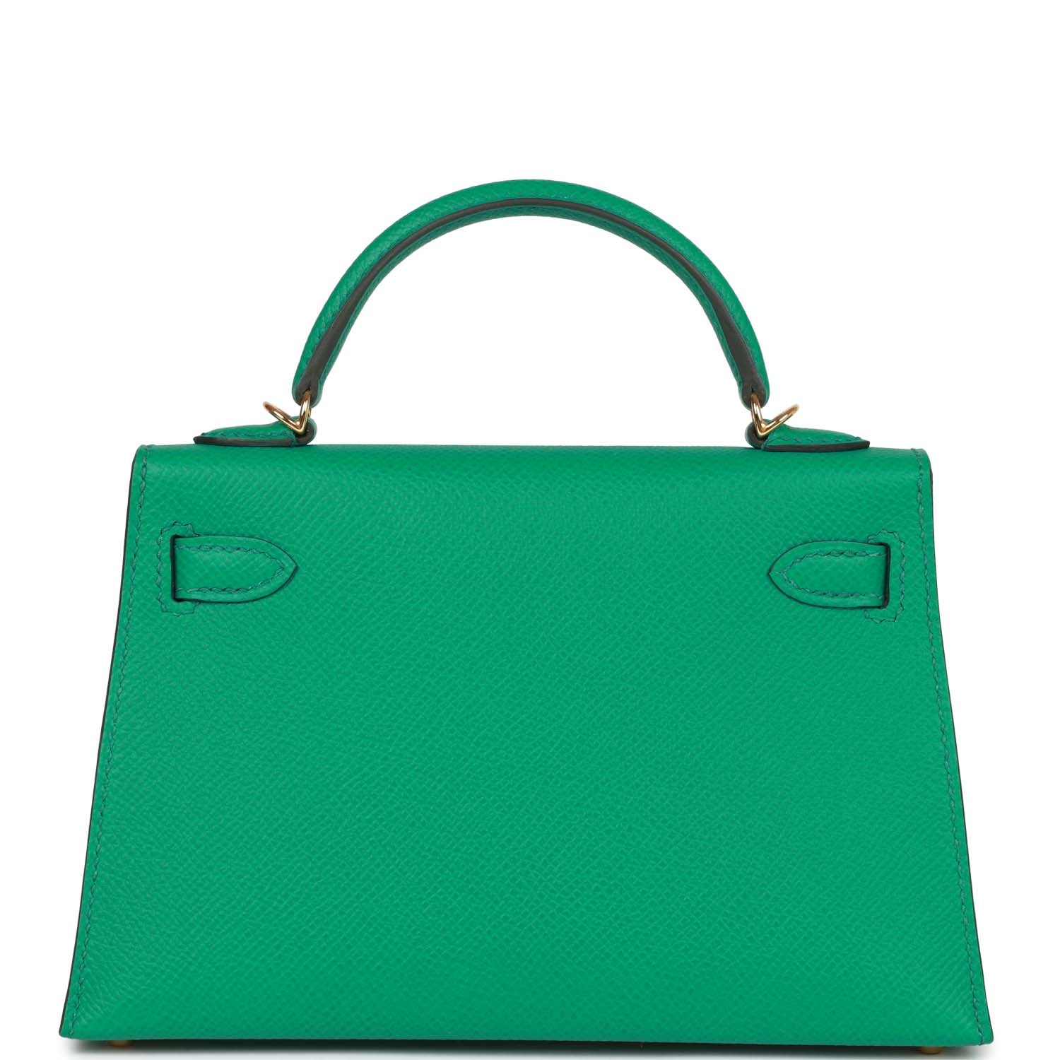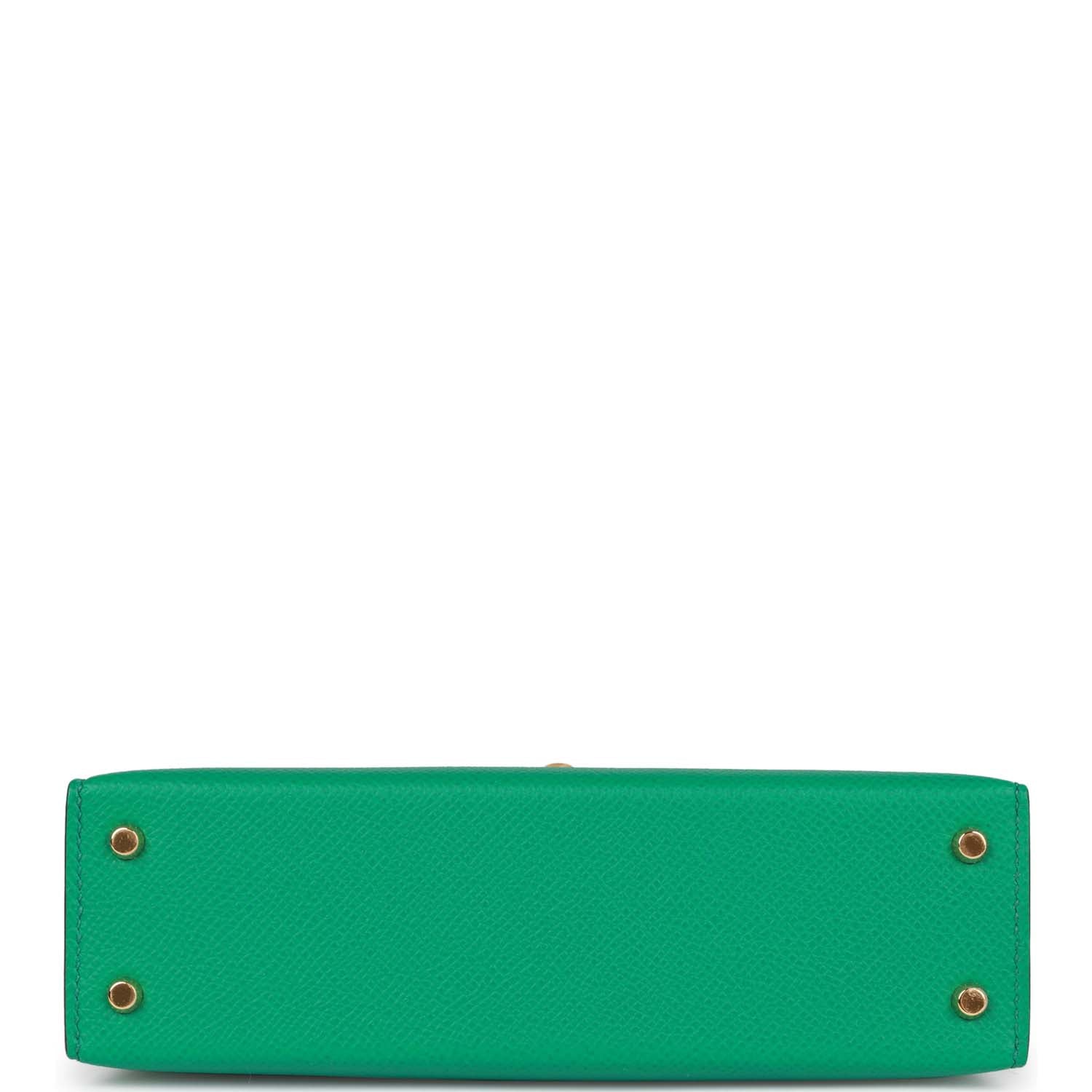 This Hermes Kelly 20, in the Sellier style, is in Vert Jade epsom leather with gold hardware, tonal stitching, front flap with two straps, front toggle closure, clochette with lock and two keys, and single rolled handles.