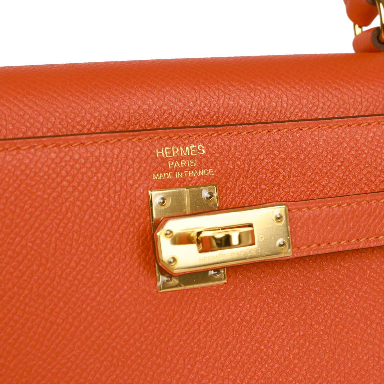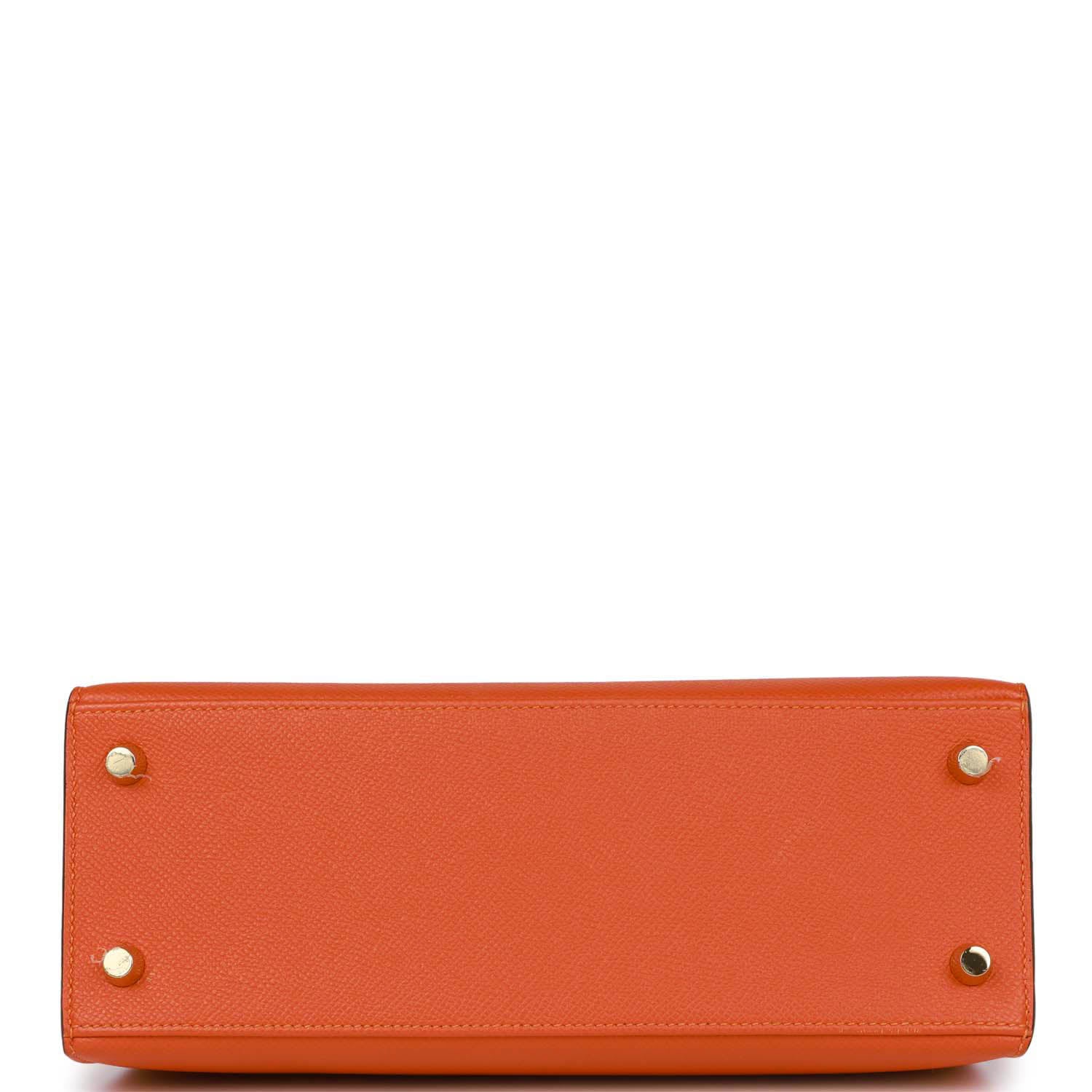 This Kelly, in the Sellier style, is in Feu epsom leather with gold hardware and has tonal stitching, two straps with front toggle closure, clochette with lock and two keys, single rolled handle and removable shoulder strap.