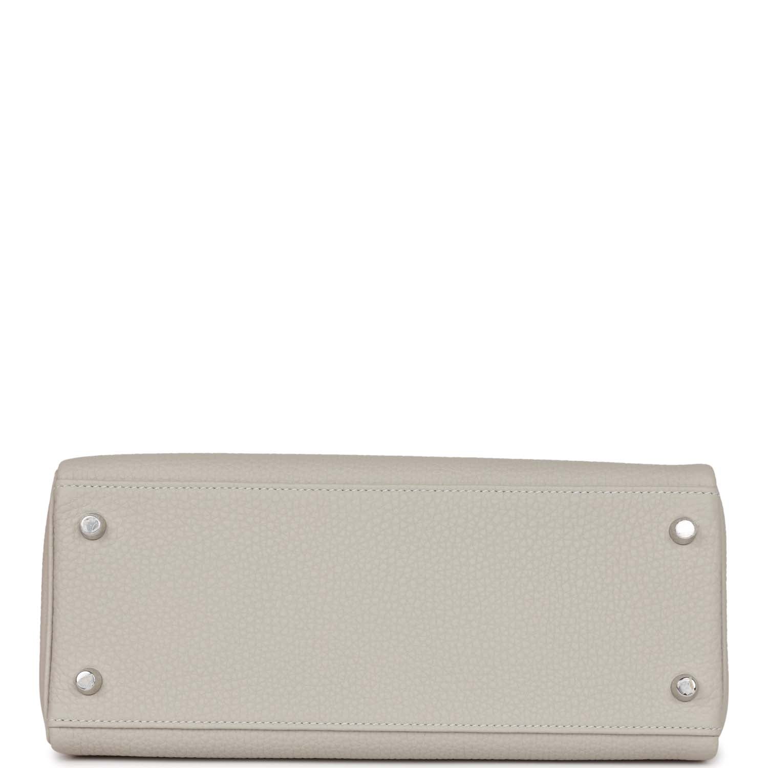 This Kelly, in the Retourne style, is in Gris Perle togo leather with palladium hardware and has tonal stitching, front flap, two straps with center toggle closure, clochette with lock and two keys, single rolled handle and removable shoulder strap.
