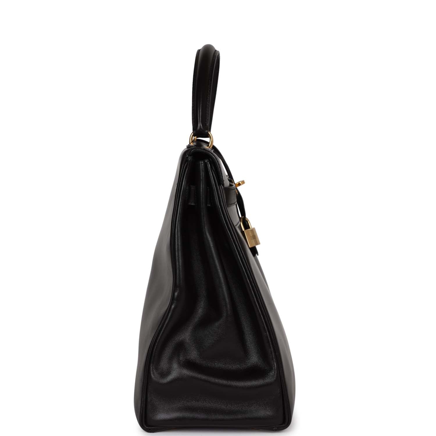 This Vintage Kelly 35 is in Black Box Calfskin with gold hardware, tonal stitching, front toggle closure, clochette with lock and two keys, single rolled handle and removable strap.