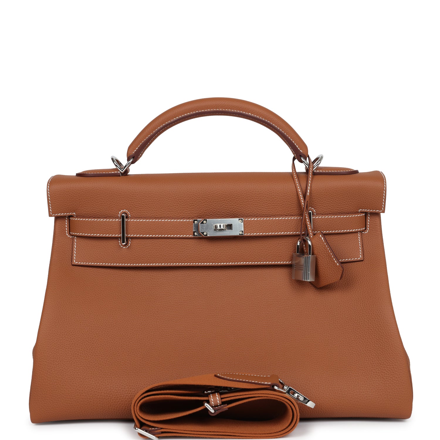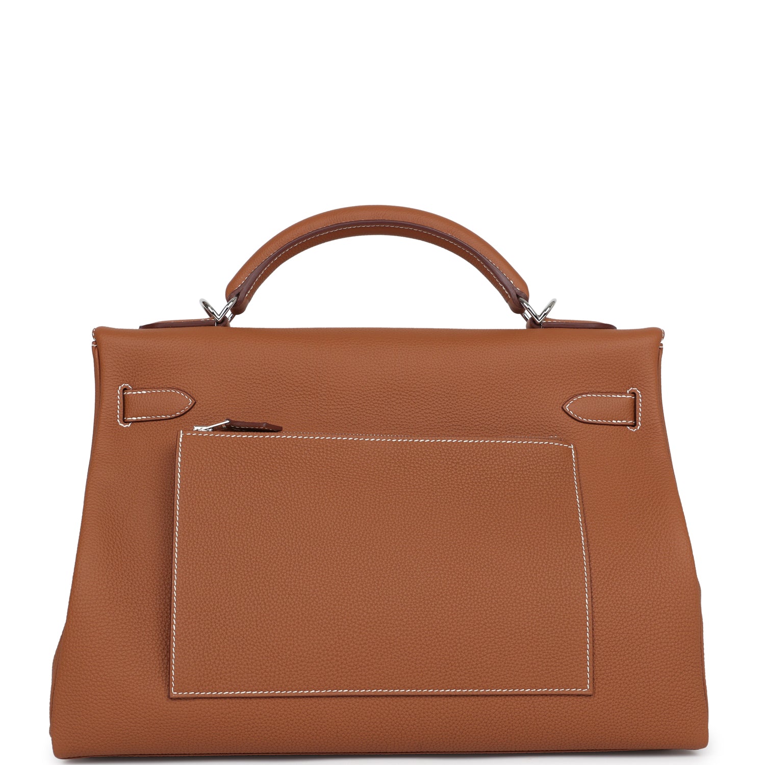 This Hermes Kelly 42 Maxi, in the Retourne style, is of Gold togo leather with palladium hardware and features contrast stitching, front flap with two straps, front toggle closure, clochette with lock and two keys, a single rolled handle and a detachable canvas Gold shoulder strap.
