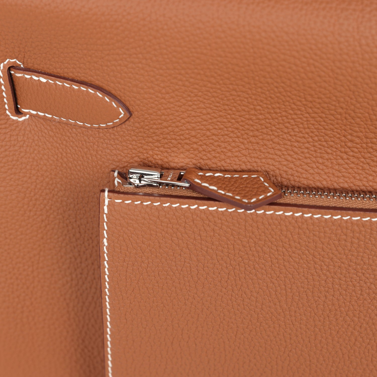 The interior is lined in Gold swift leather and has one zip pocket with Hermes engraved pull and one open pocket on rear wall. There's also one zip pocket on the back exterior of the bag with an Hermes engraved pull.