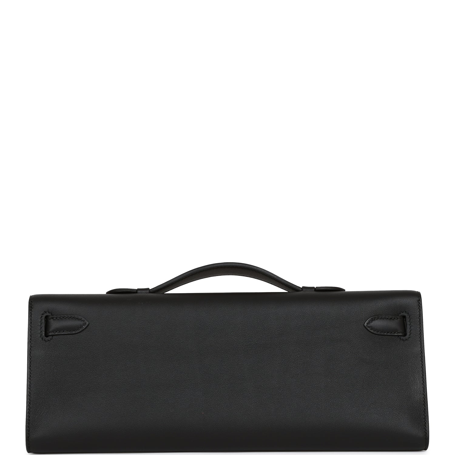 This Kelly Cut is in Black swift leather with gold hardware and has tonal stitching, two straps with front toggle closure and a top flat handle.