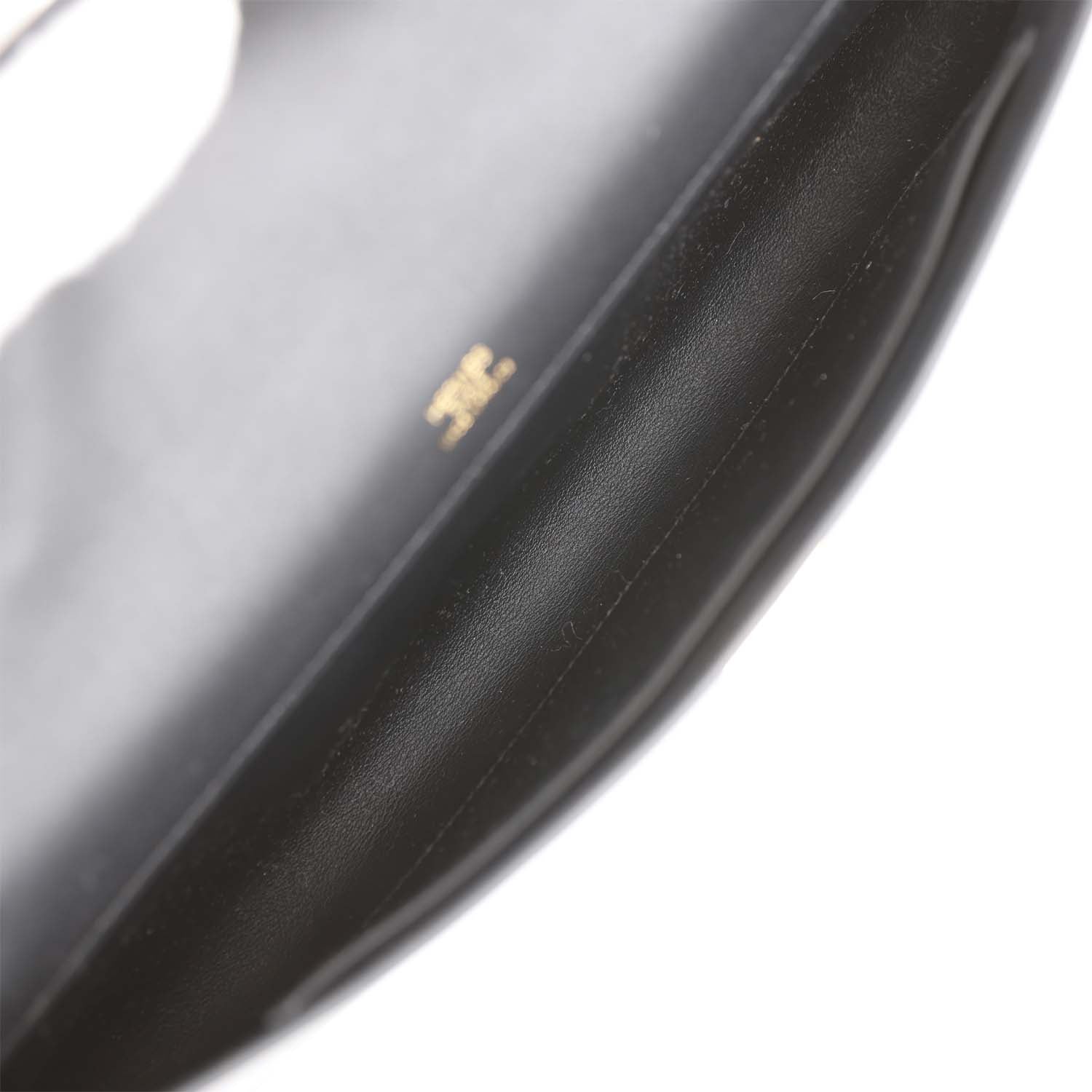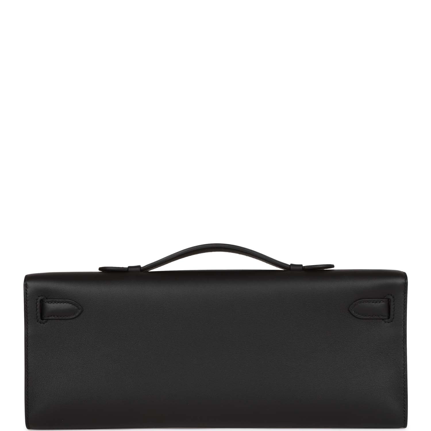 This Kelly Cut is in Black swift leather with gold hardware and has tonal stitching, two straps with front toggle closure and a top flat handle.
