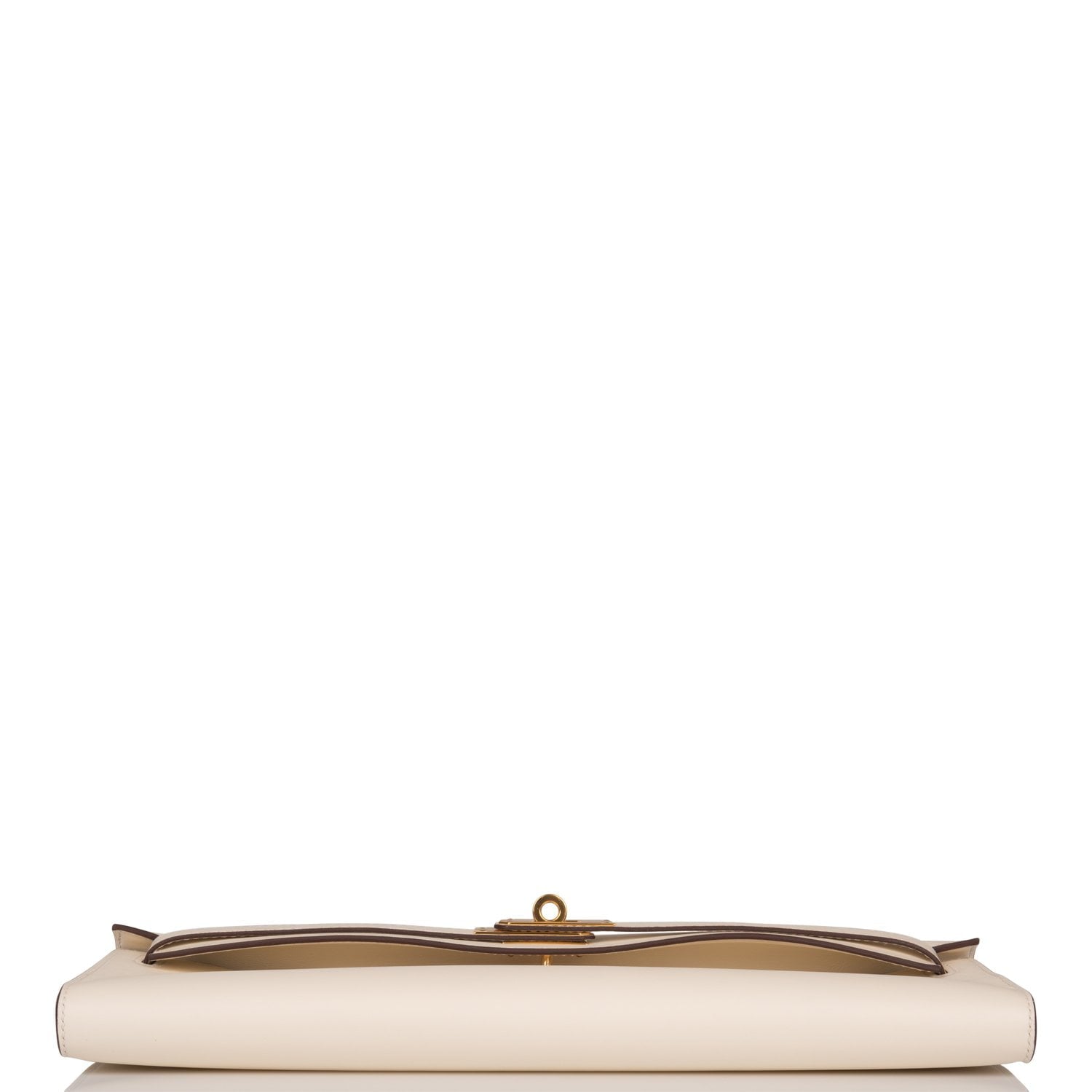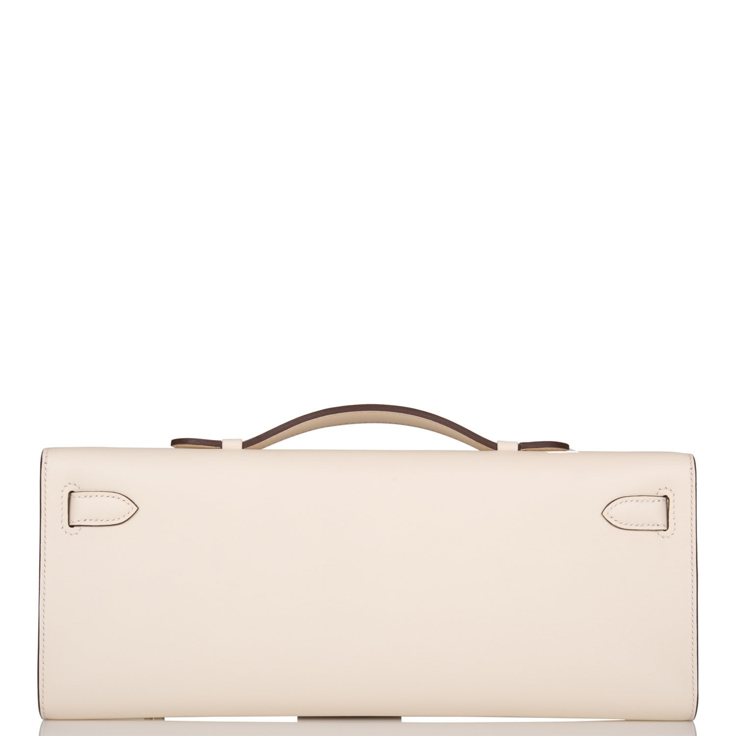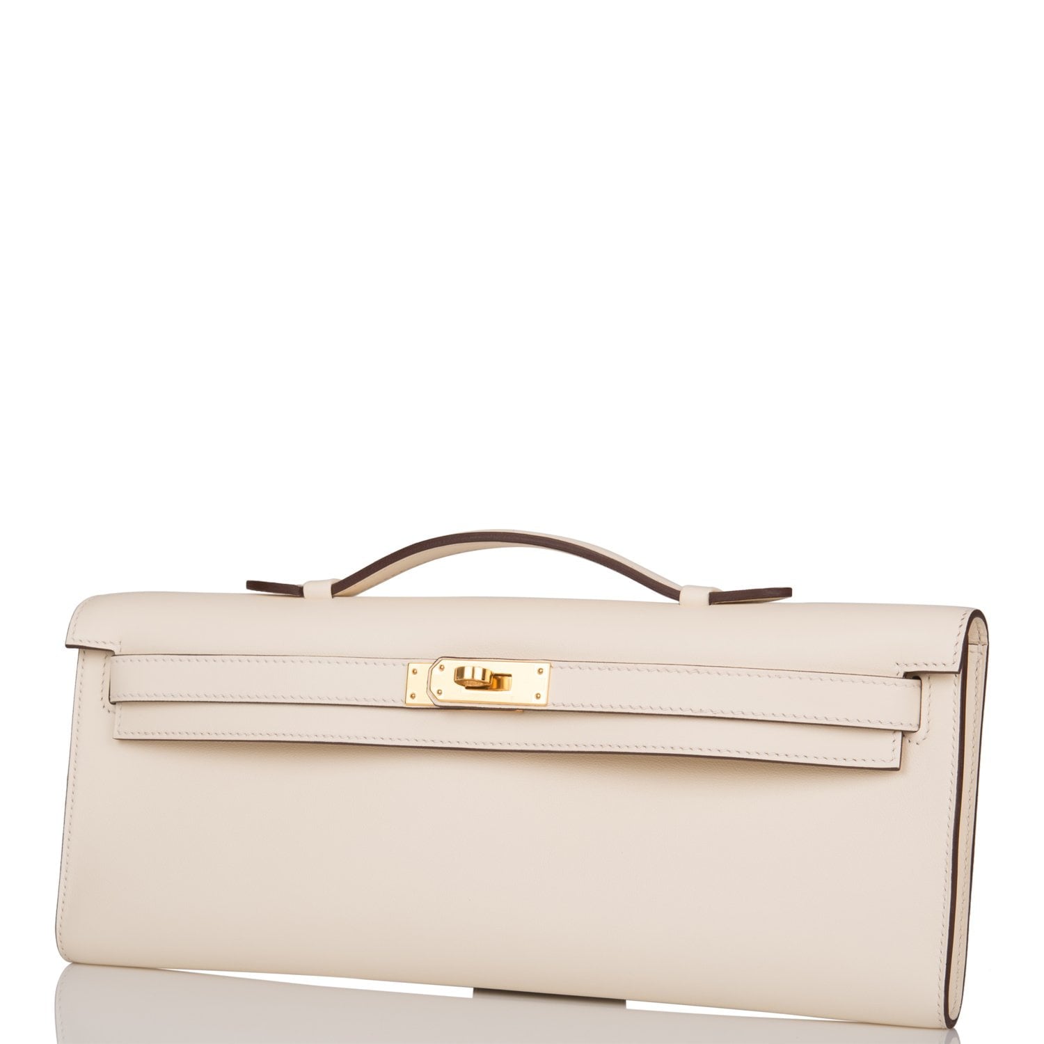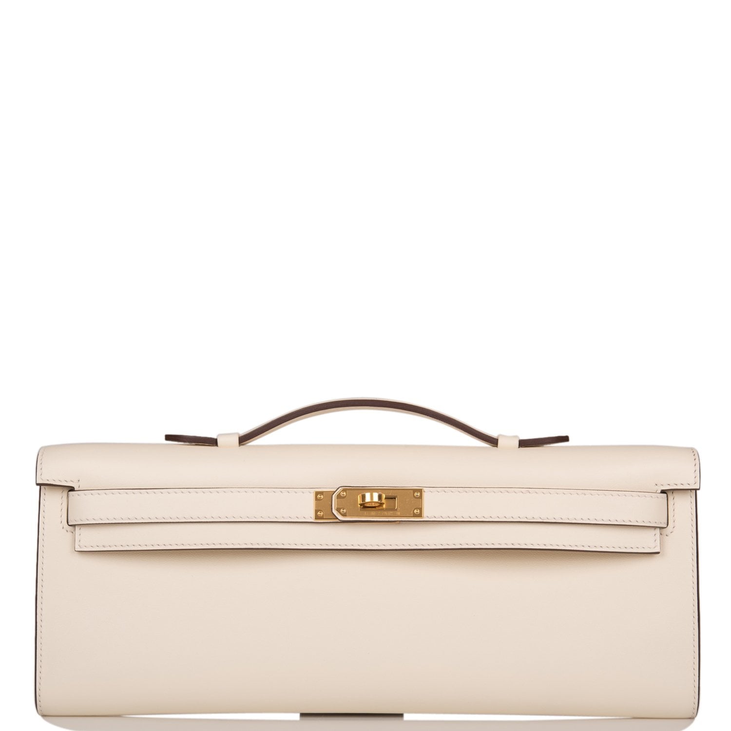 This Kelly Cut is in Nata swift leather with gold hardware and has tonal stitching, two straps with front toggle closure and a top flat handle.