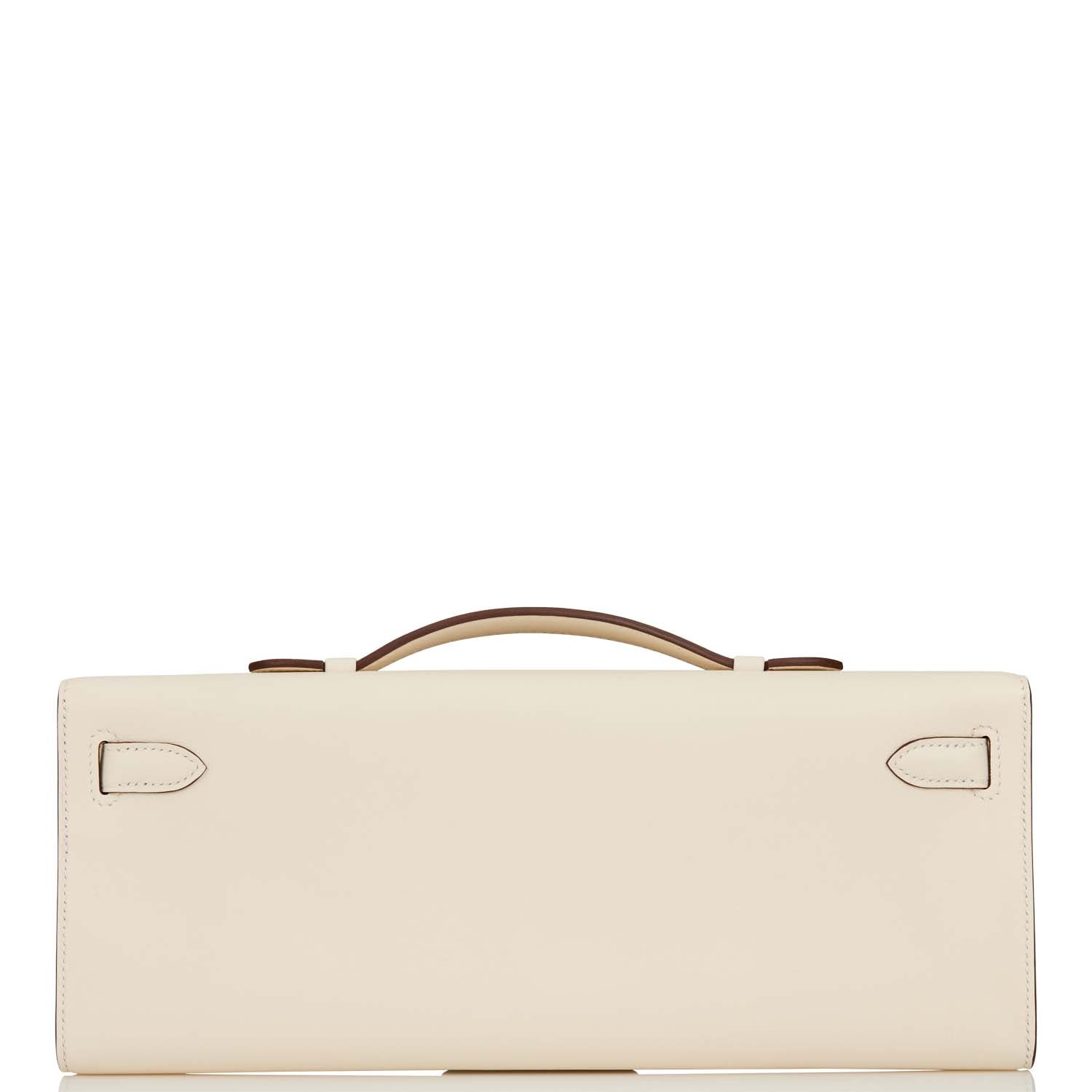 This Kelly Cut is in Nata swift leather with gold hardware and has tonal stitching, two straps with front toggle closure and a top flat handle.
