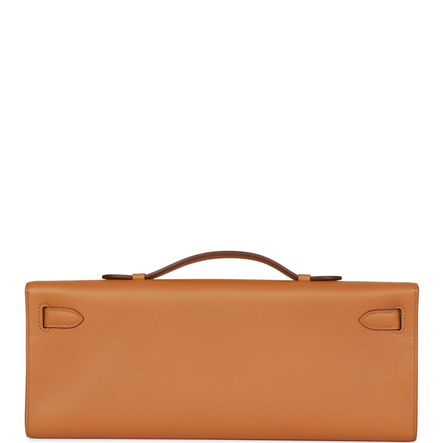 This Kelly Cut is in Sesame swift leather with gold hardware and has tonal stitching, two straps with front toggle closure and a top flat handle.
