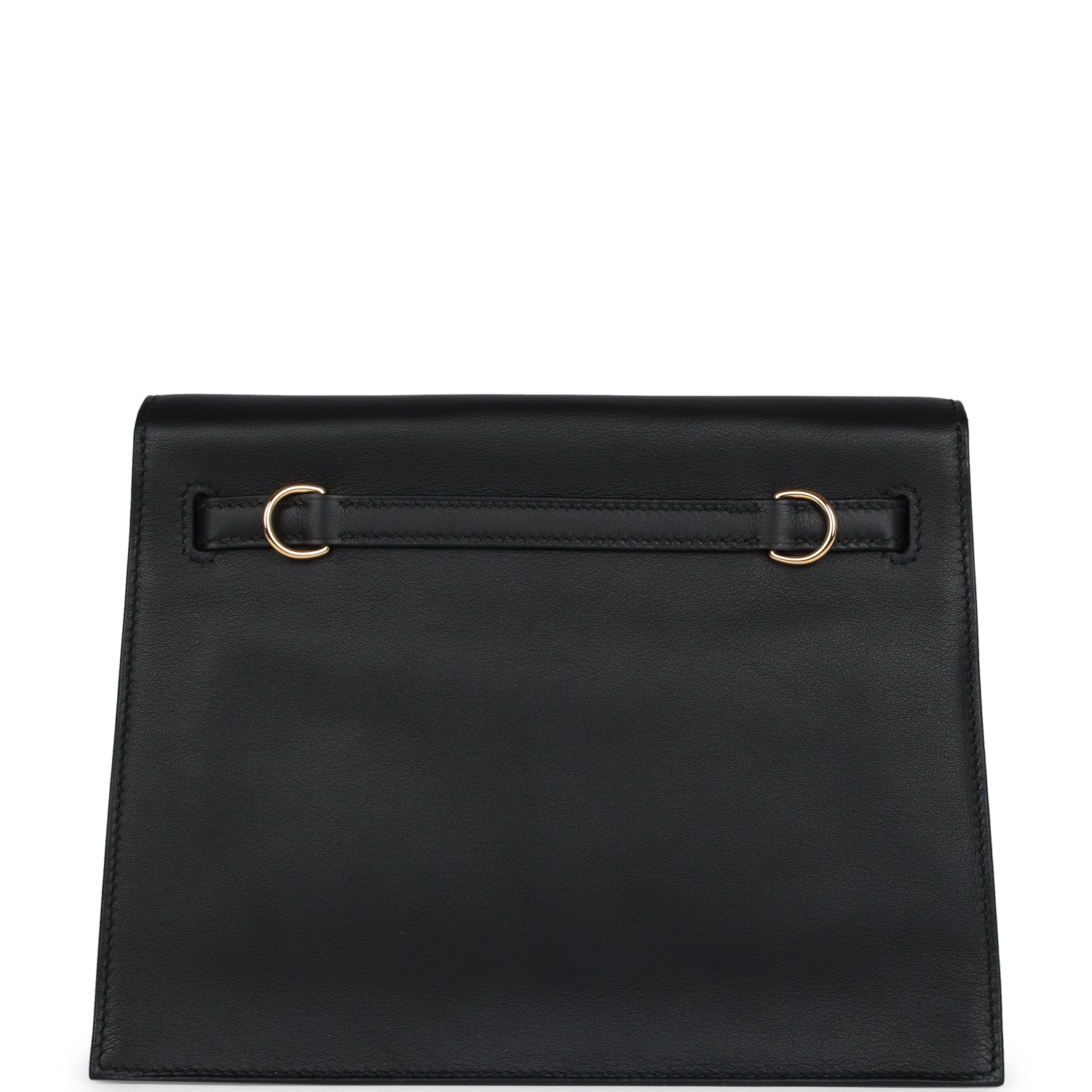 This Kelly Danse II is in Black swift leather with gold hardware and has tonal stitching, two straps with front flap closure and an adjustable flat shoulder strap for multistyle wear.