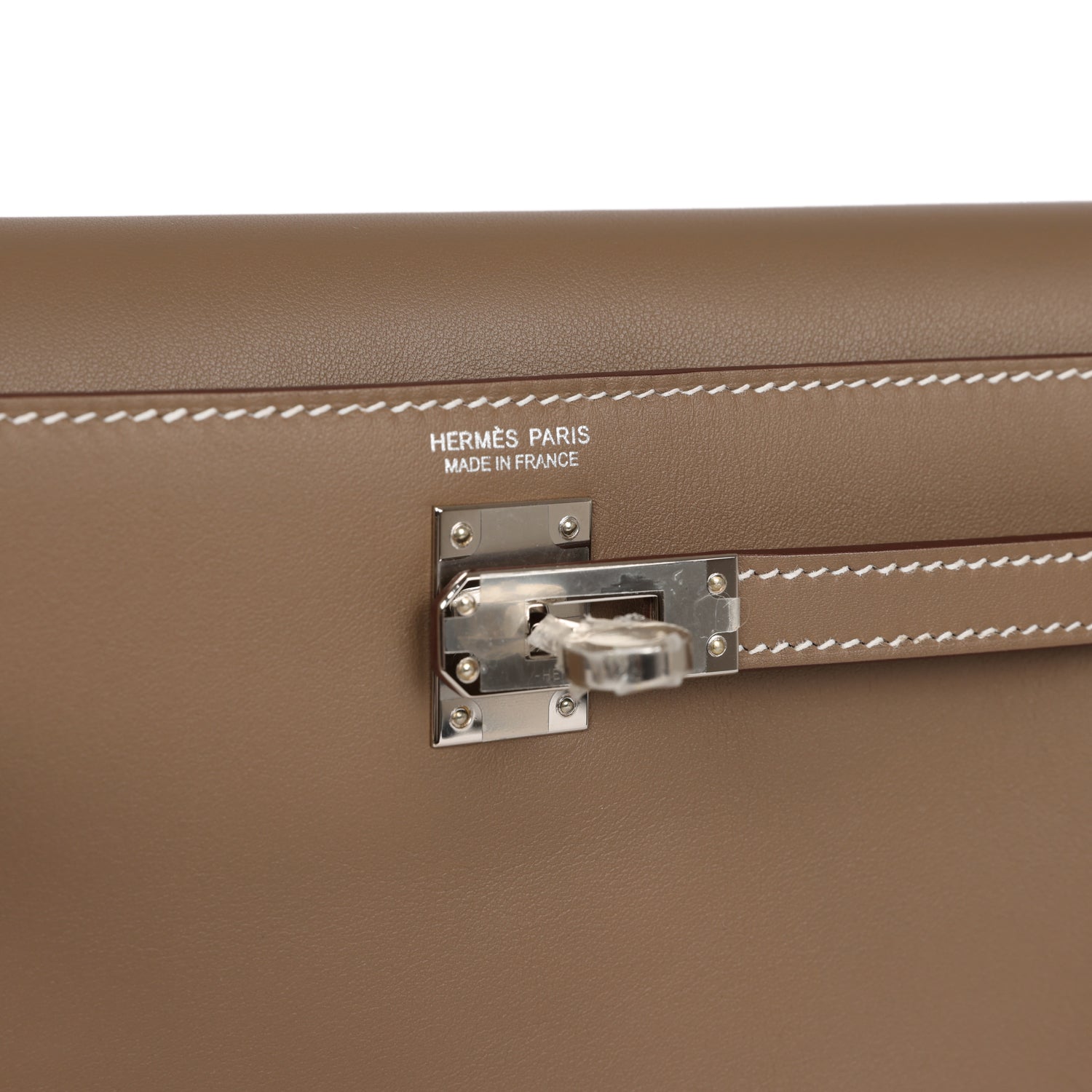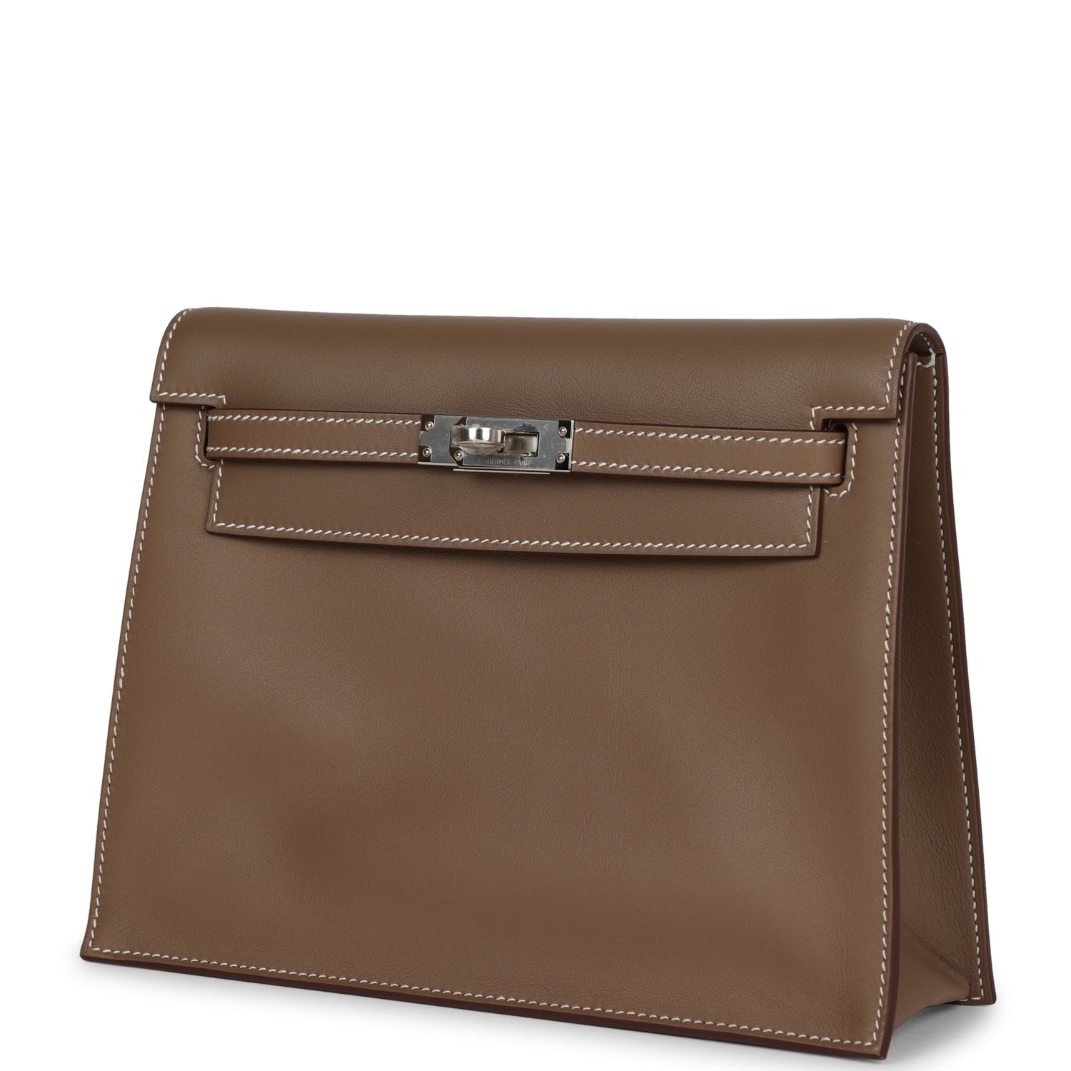 This Kelly Danse II is in Etoupe Swift leather with palladium hardware and has contrast stitching, two straps with front flap closure and an adjustable flat shoulder strap for multi-style wear.