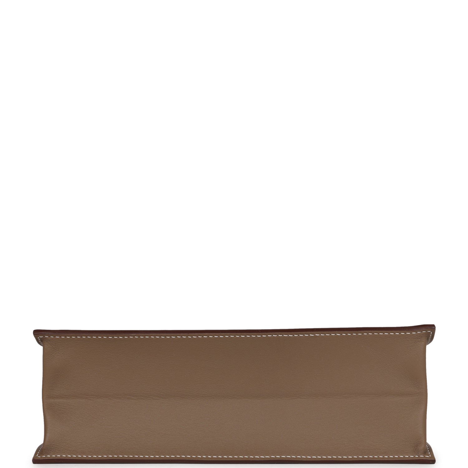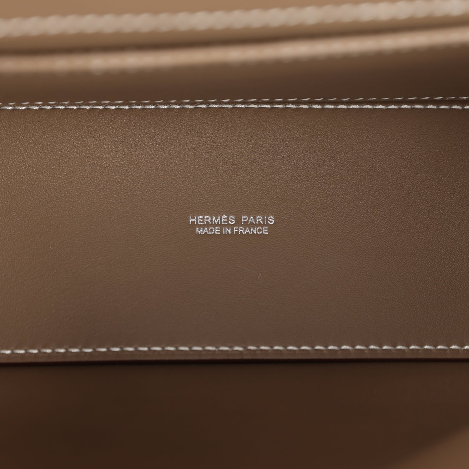 The interior is lined with Etoupe lambskin and has a removable Hermes stamped base and an open wall pocket.