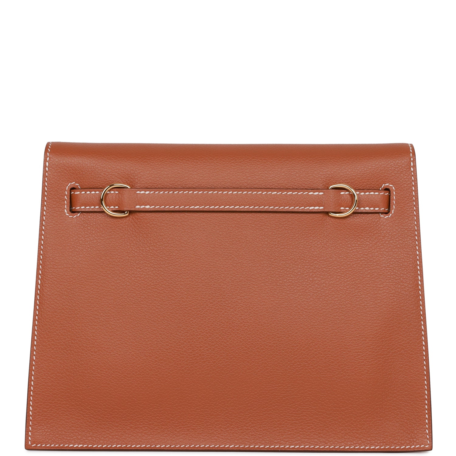 This Kelly Danse II is in Gold evercolor leather with gold hardware and has contrast stitching, two straps with front flap closure and an adjustable flat crossbody/backpack/belt strap.