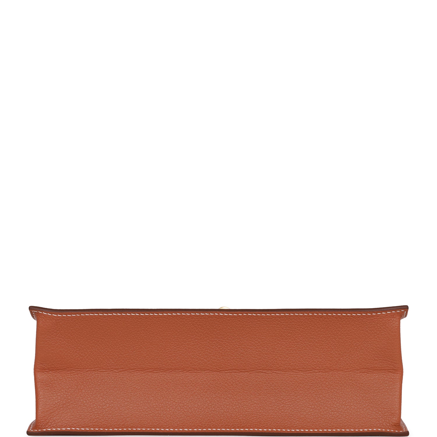 The interior is lined with Gold lambskin and has a removable Hermes stamped base and an open wall pocket.