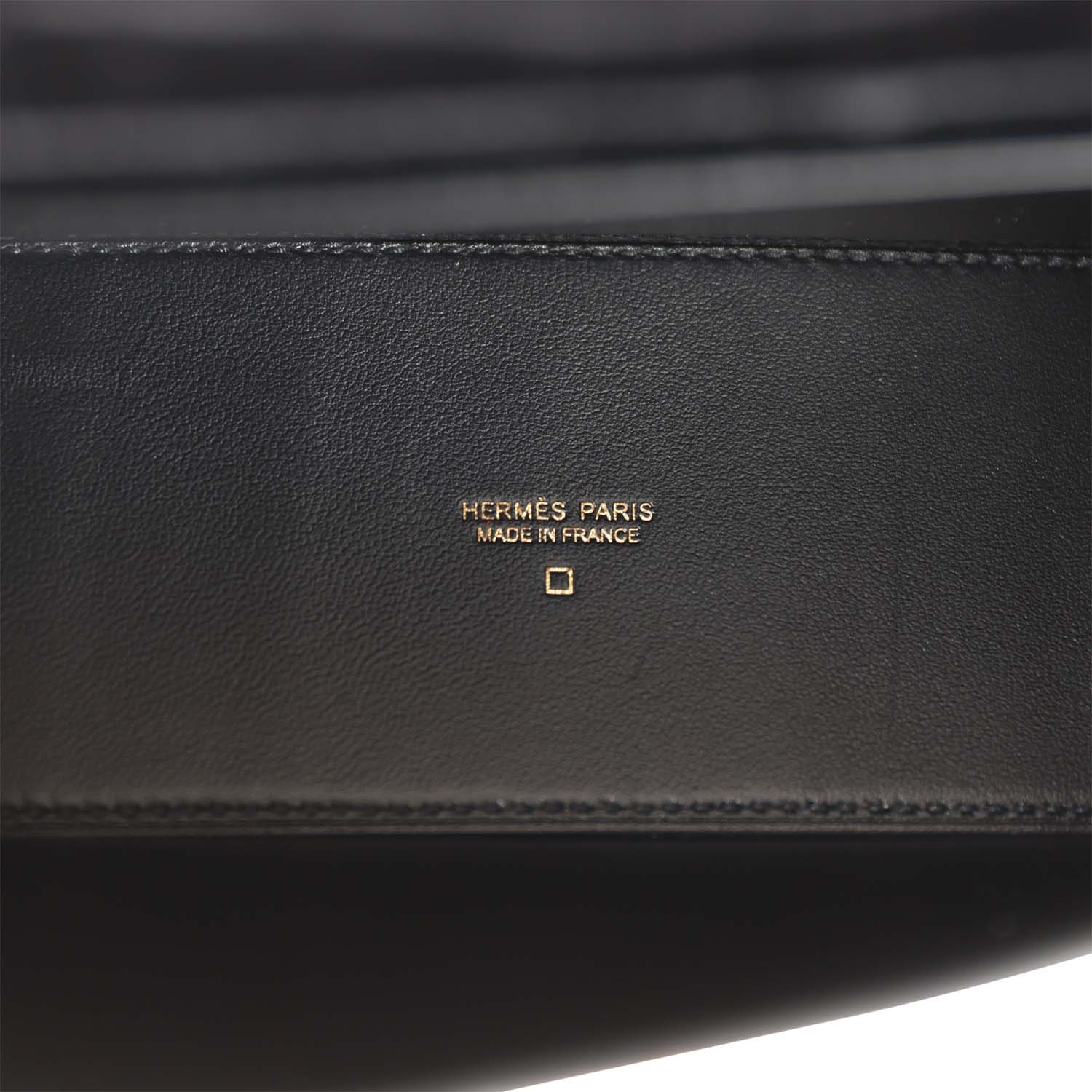 The interior is lined with black lambskin and has a removable Hermes stamped base and an open wall pocket.