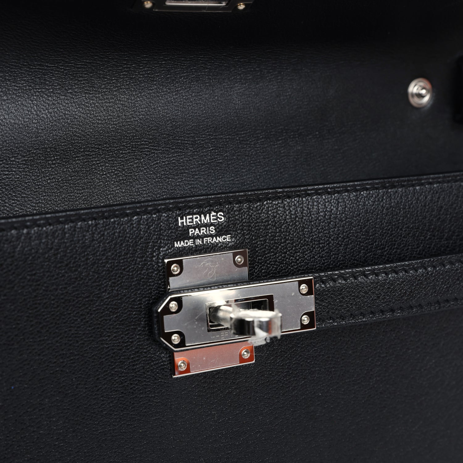This Kelly Elan is in Black Chevre Chamkila leather with palladium hardware, two pull straps that attach to a toggle, and an interior that has snaps for shoulder strap, and a removable shoulder strap.