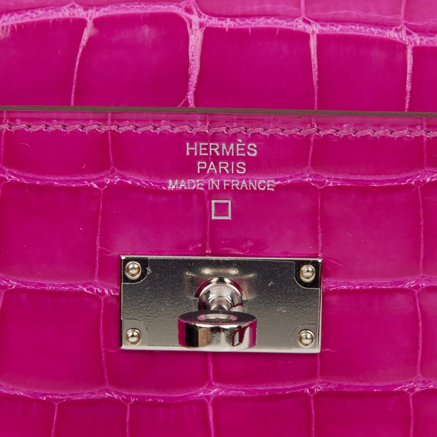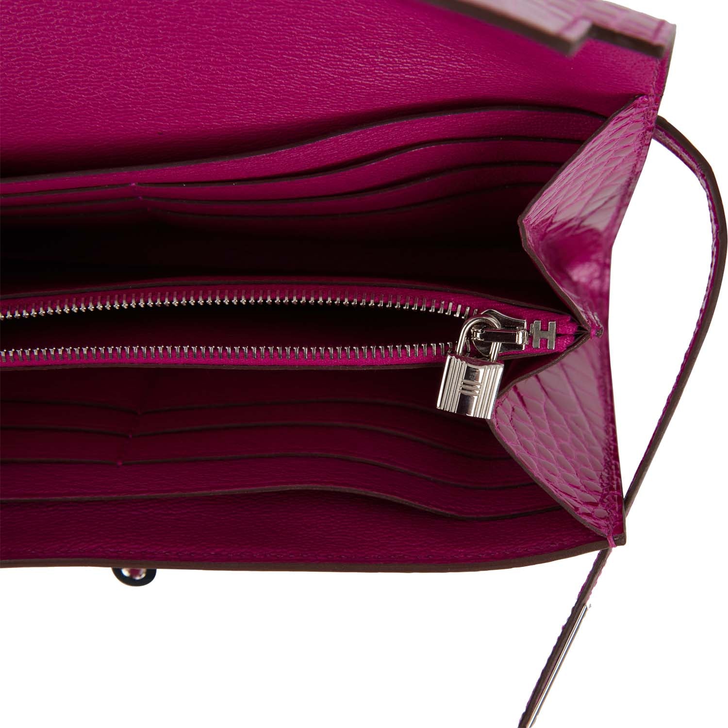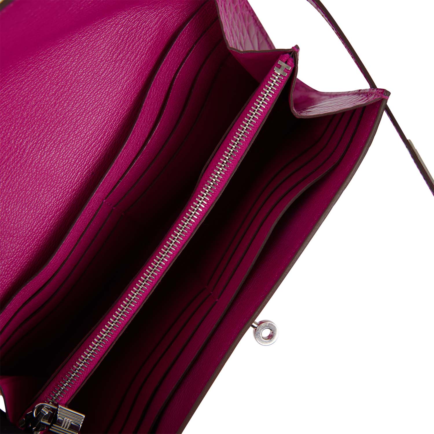 This Kelly Long Wallet is in Rose Scheherazade shiny alligator with palladium hardware. This exotic wallet, which can be used as a clutch, has tonal stitching and a front toggle closure.