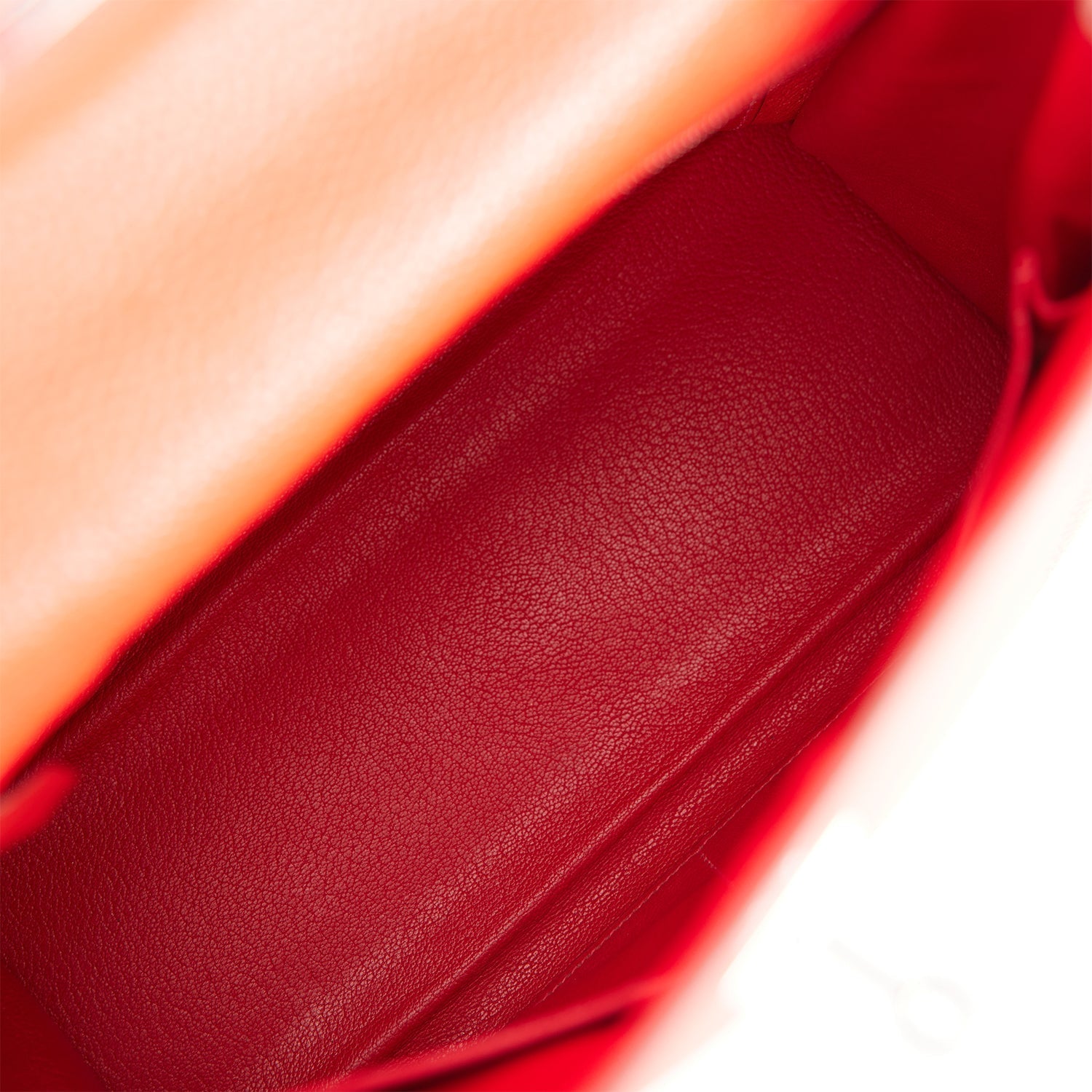 The interior is lined with Vermillion chevre and features one zip pocket with an Hermes engraved pull and two open pockets on the opposite side.