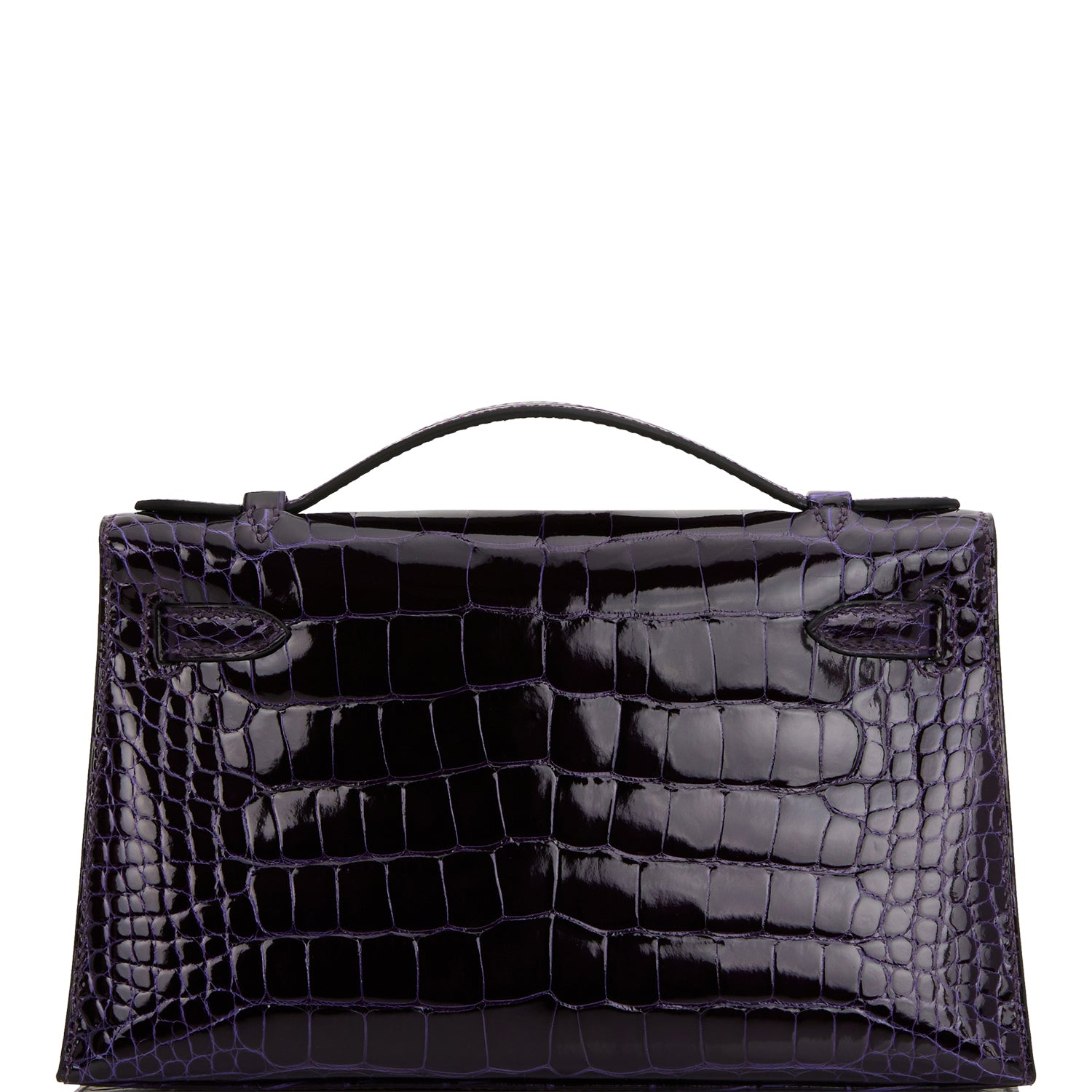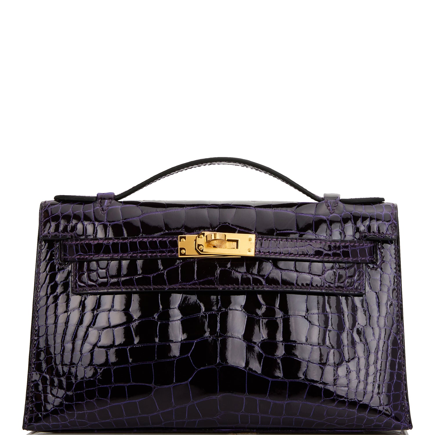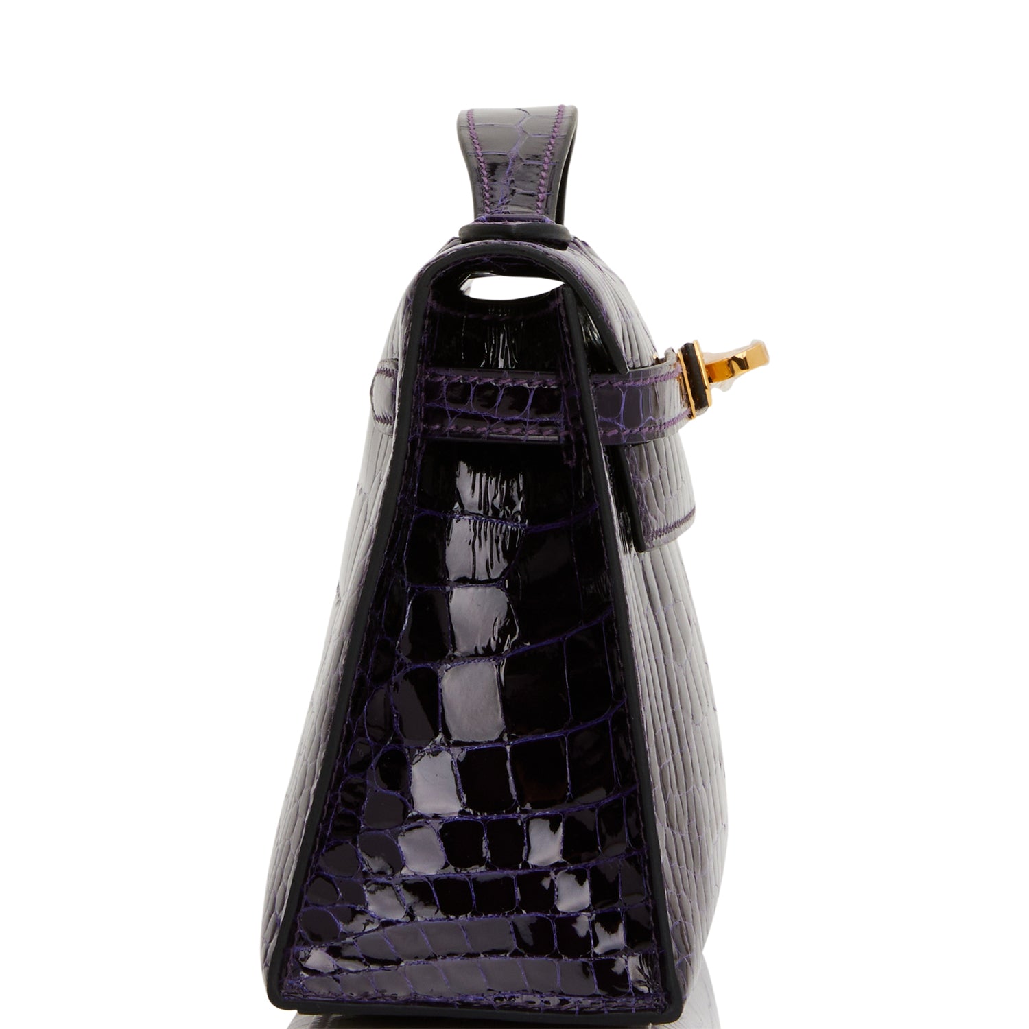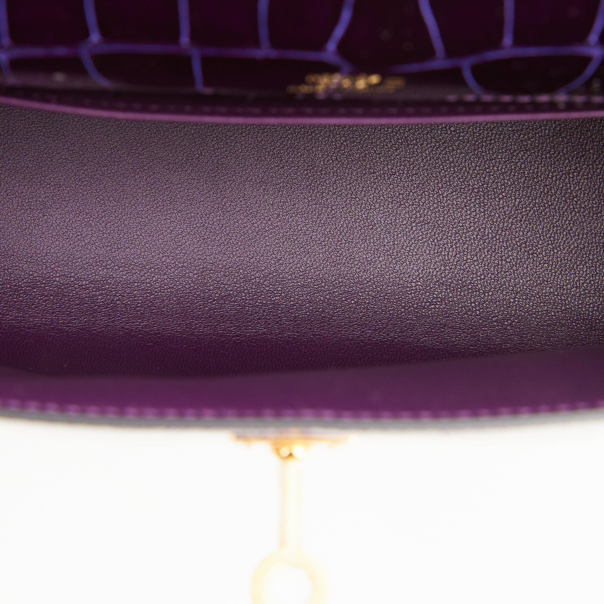 This Mini Kelly Pochette is in Amethyst shiny Mississippiensis alligator with gold hardware and has tonal stitching, front flap, two straps with center toggle closure and a top flat handle.