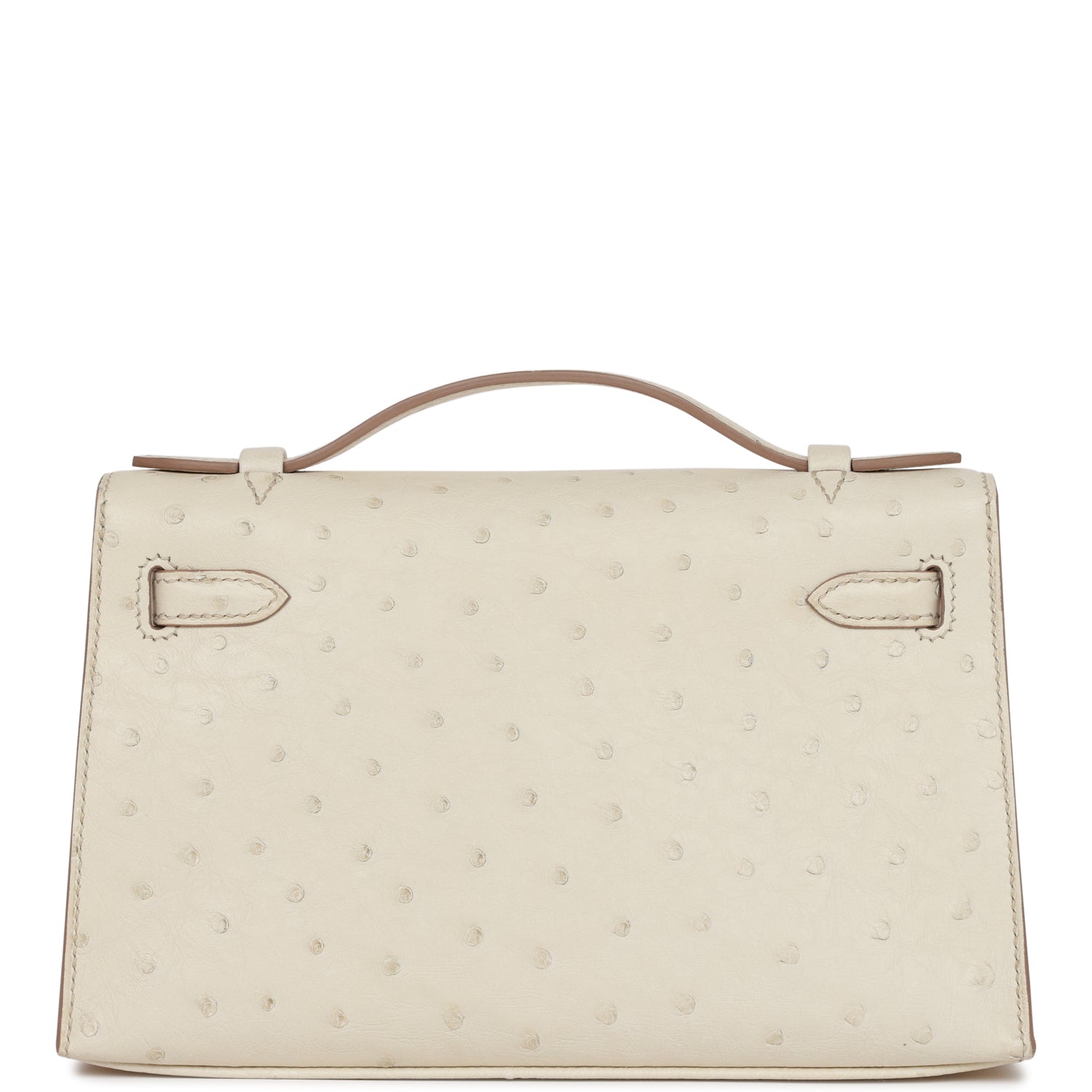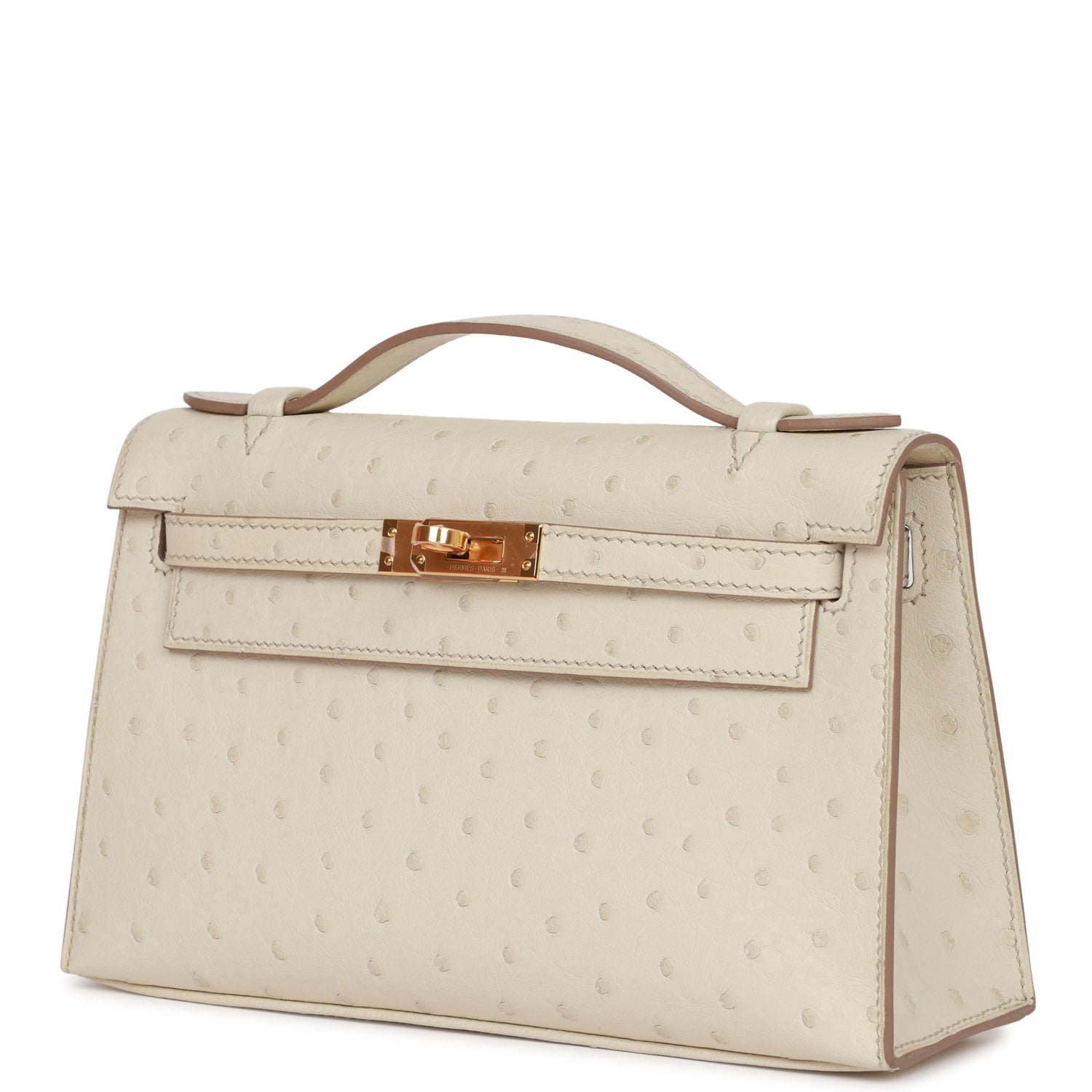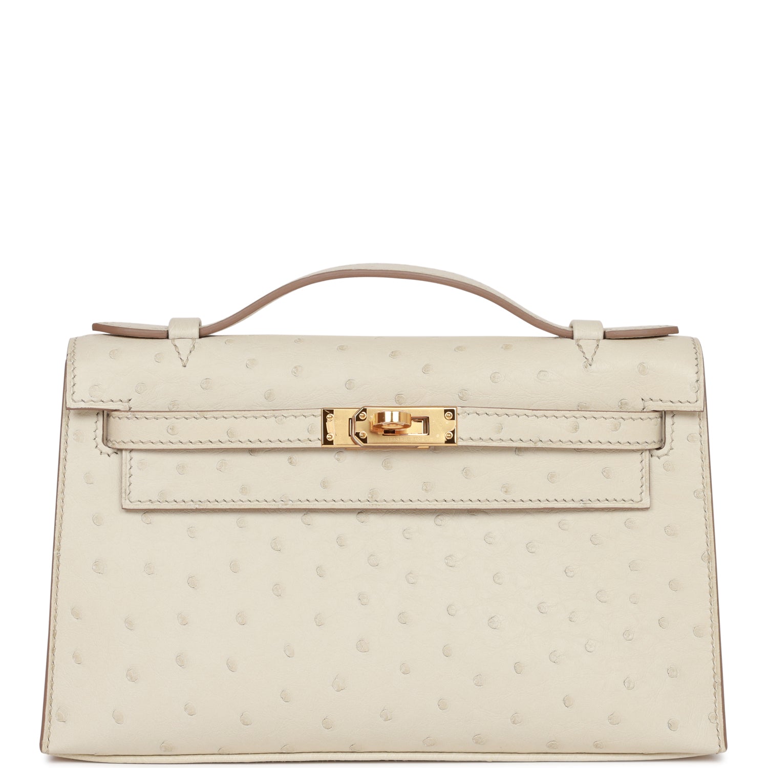 This Mini Kelly Pochette is in Beton ostrich with gold hardware and has tonal stitching, front flap, two straps with center toggle closure and a top flat handle.