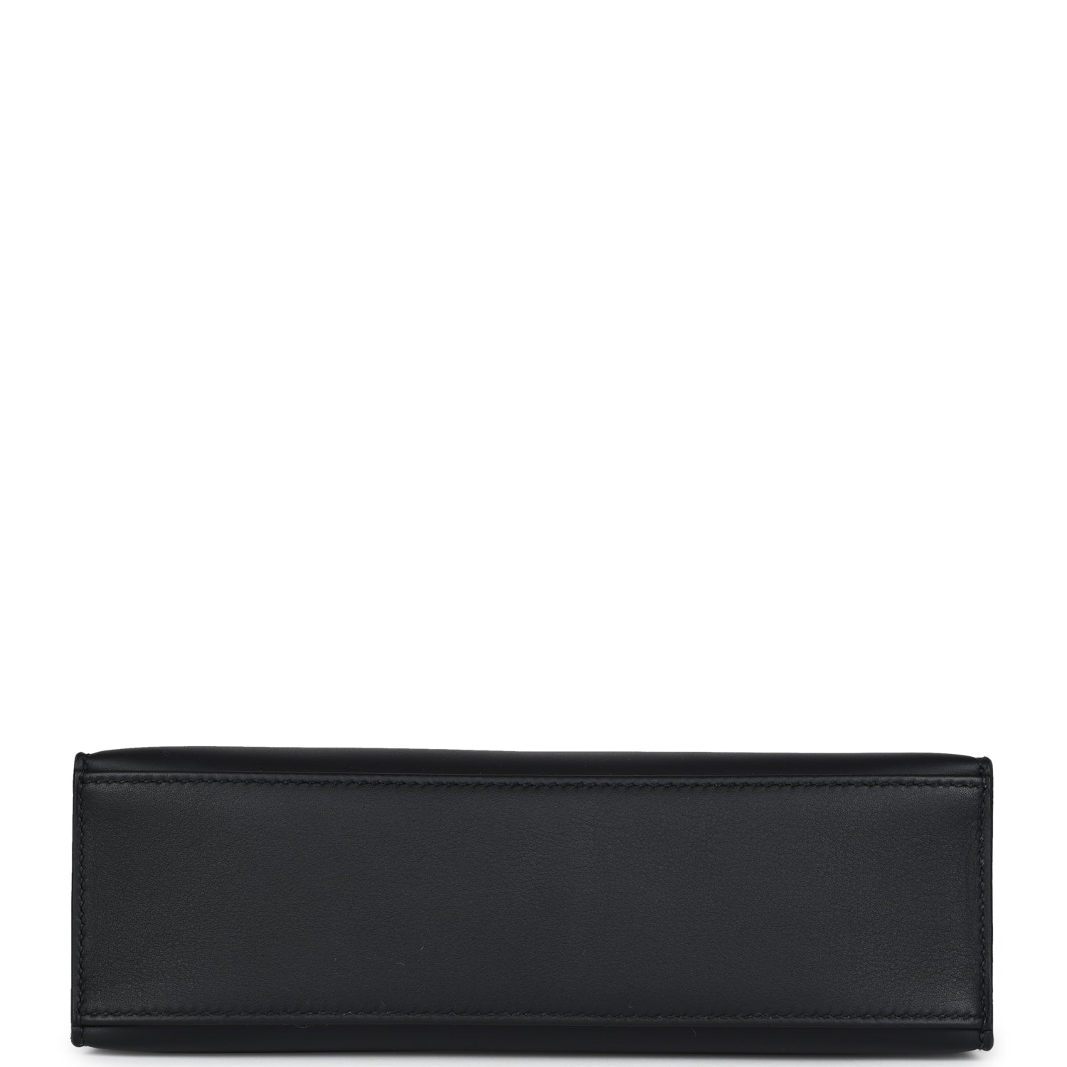 This Kelly Pochette is in Black swift leather with gold hardware and has tonal stitching, front flap, two straps with center toggle closure and a top flat handle.