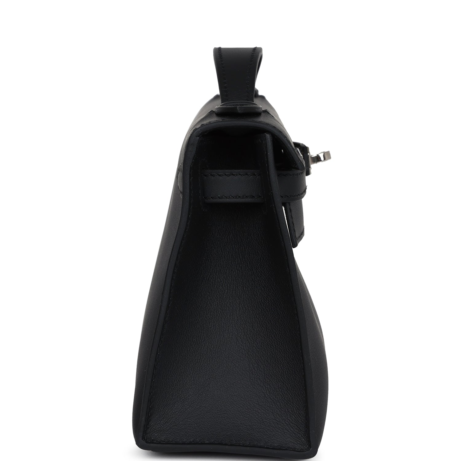 This Kelly Pochette is in Black swift leather with palladium hardware and has tonal stitching, front flap, two straps with center toggle closure and a top flat handle.