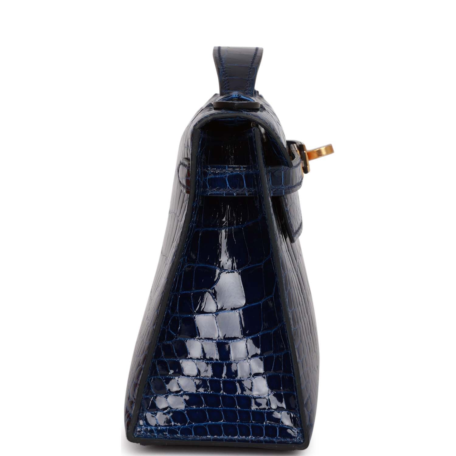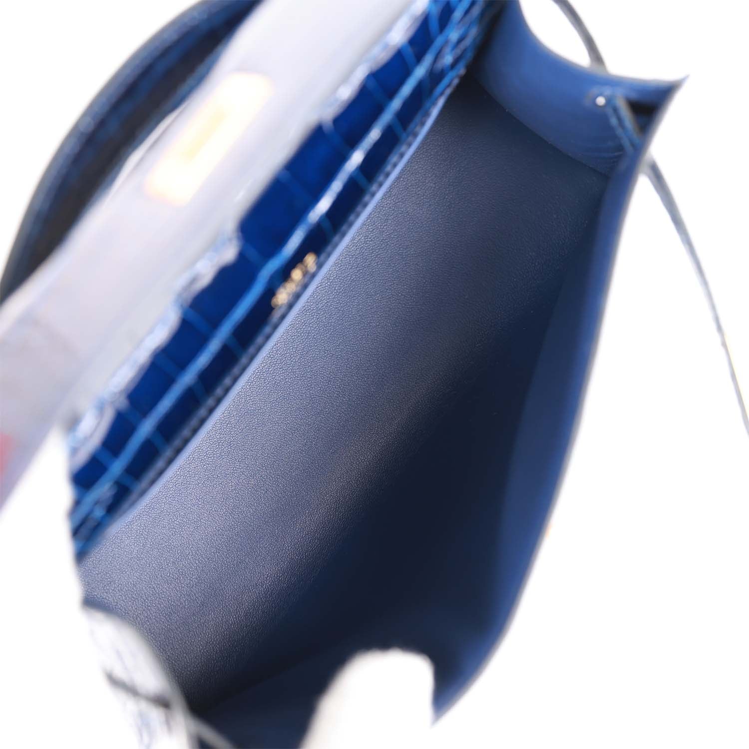 This Mini Kelly Pochette is in Bleu Saphir shiny Mississippiensis alligator with gold hardware and has tonal stitching, front flap, two straps with center toggle closure and a top flat handle.