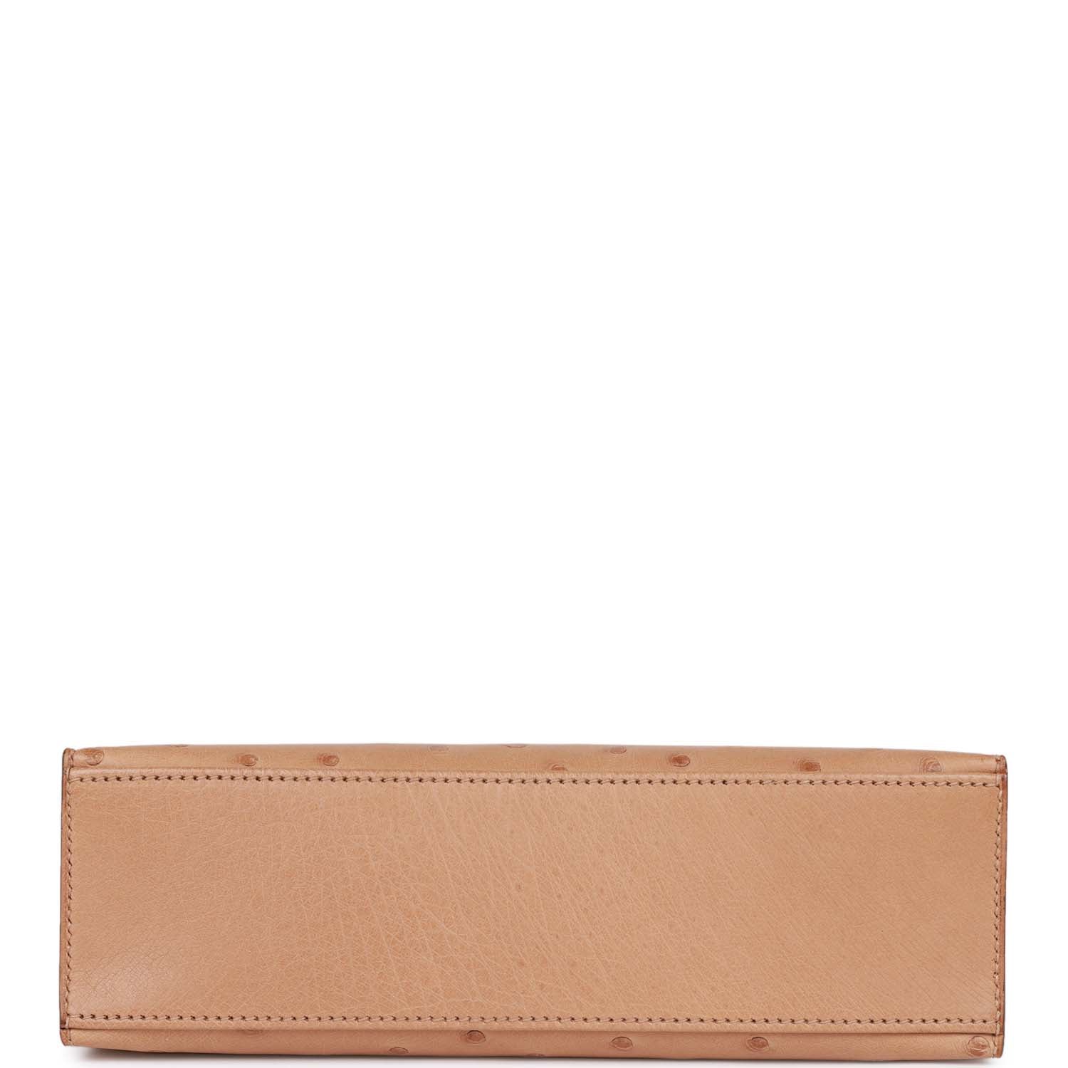 This Mini Kelly Pochette is in Chai ostrich with gold hardware and has tonal stitching, front flap, two straps with center toggle closure and a top flat handle.