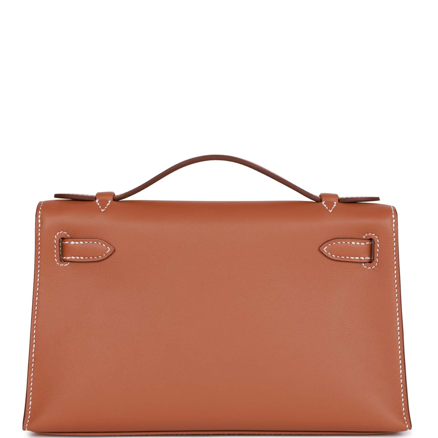 This Mini Kelly Pochette is in Gold swift leather with gold hardware and has contrast stitching, front flap, two straps with center toggle closure and a top flat handle.