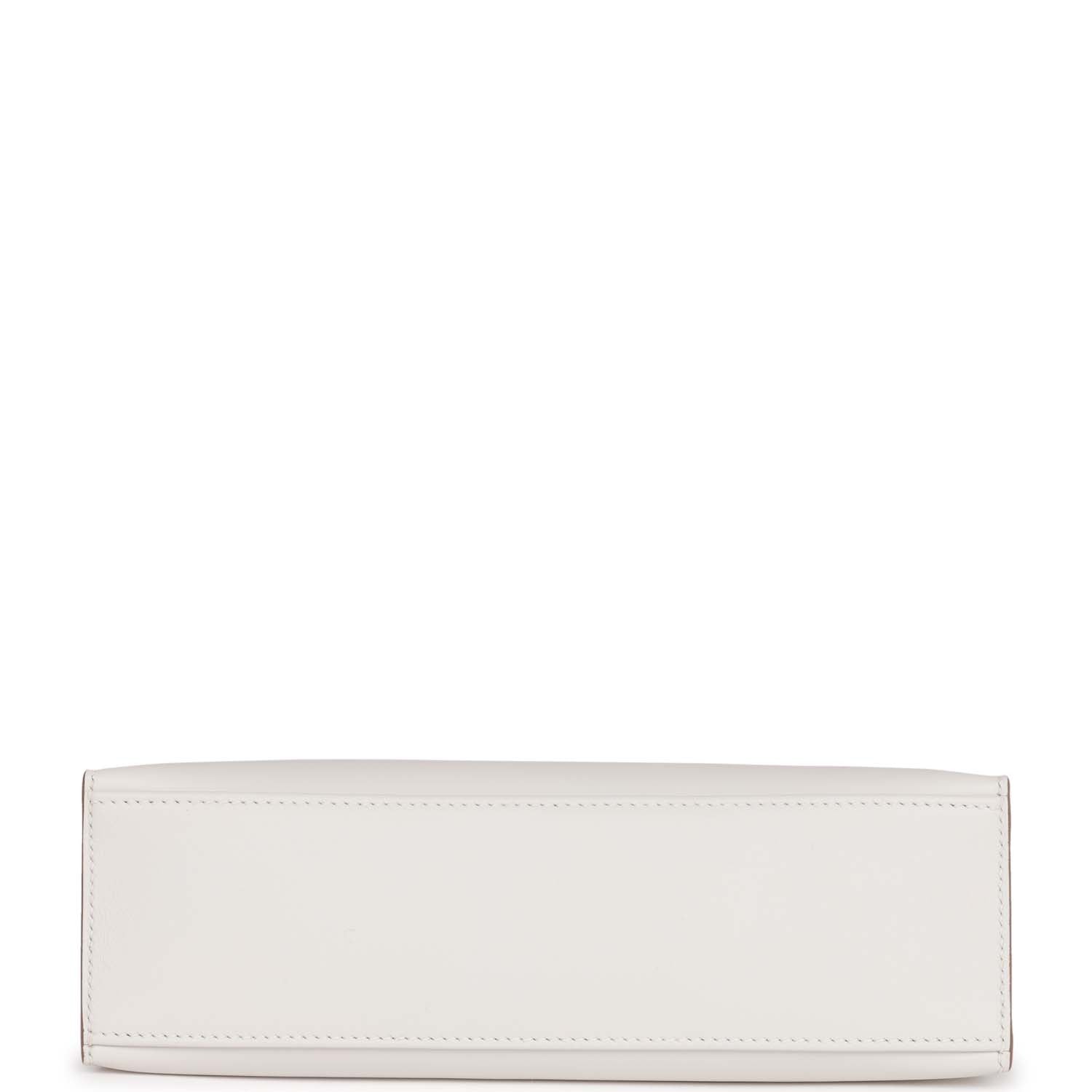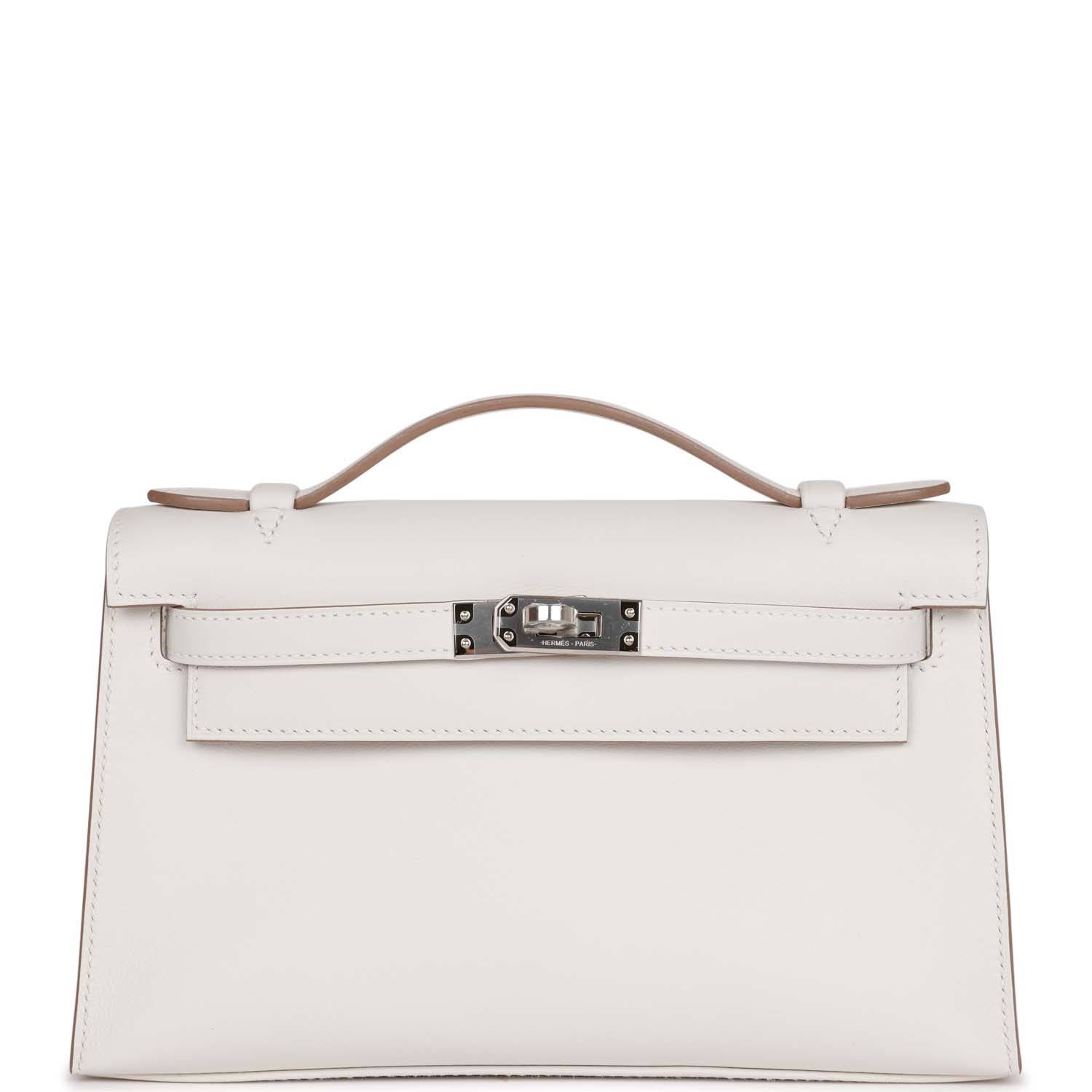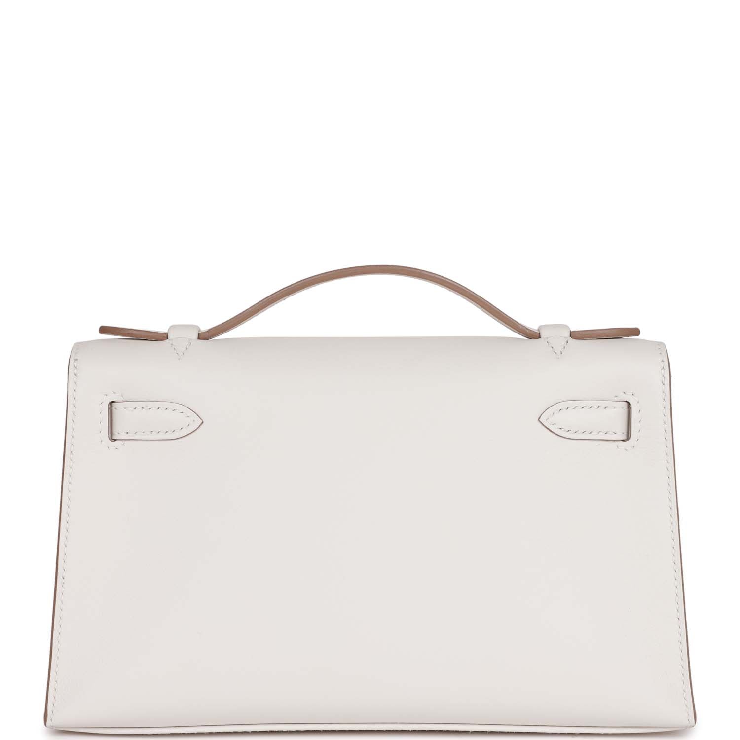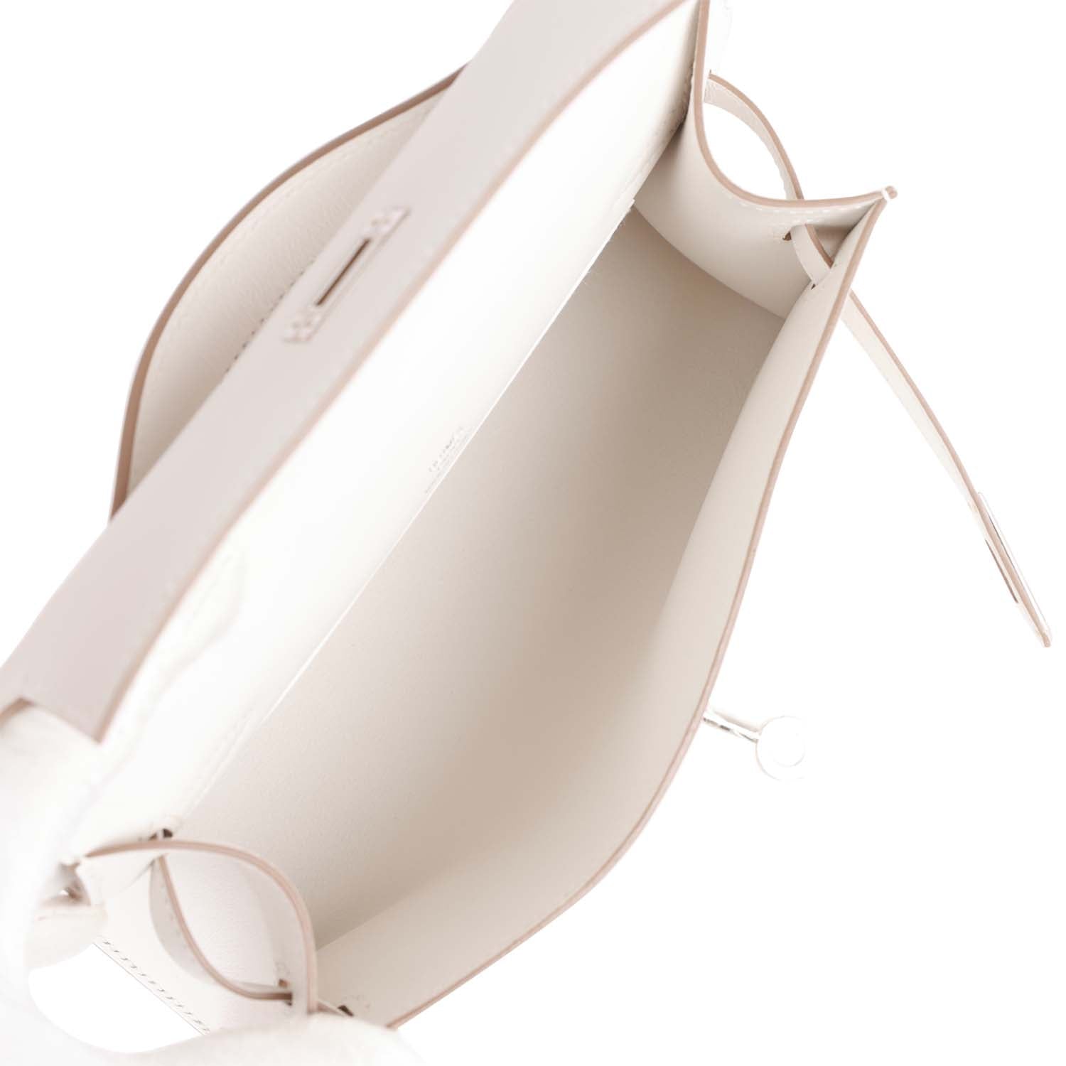 This Kelly Pochette is in Gris Pale swift leather with palladium hardware and has tonal stitching, front flap, two straps with center toggle closure and a top flat handle.