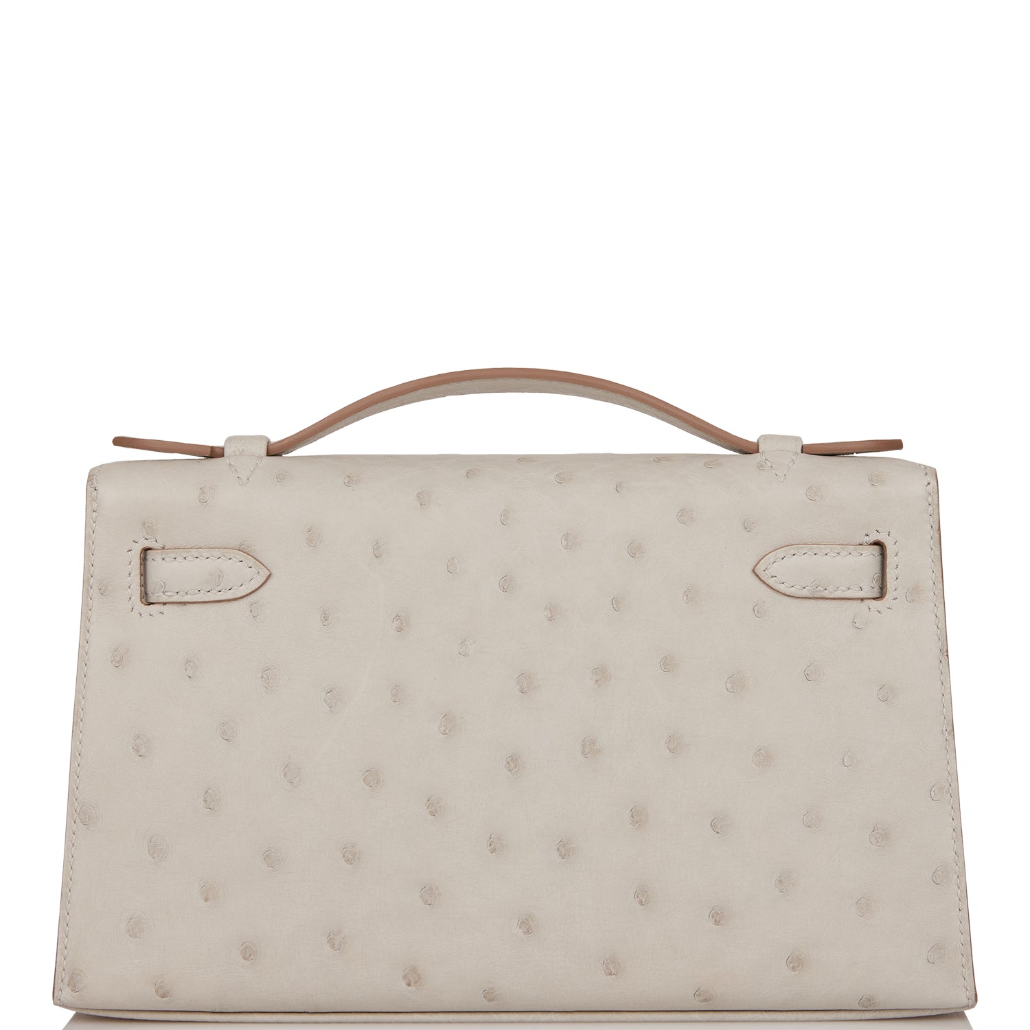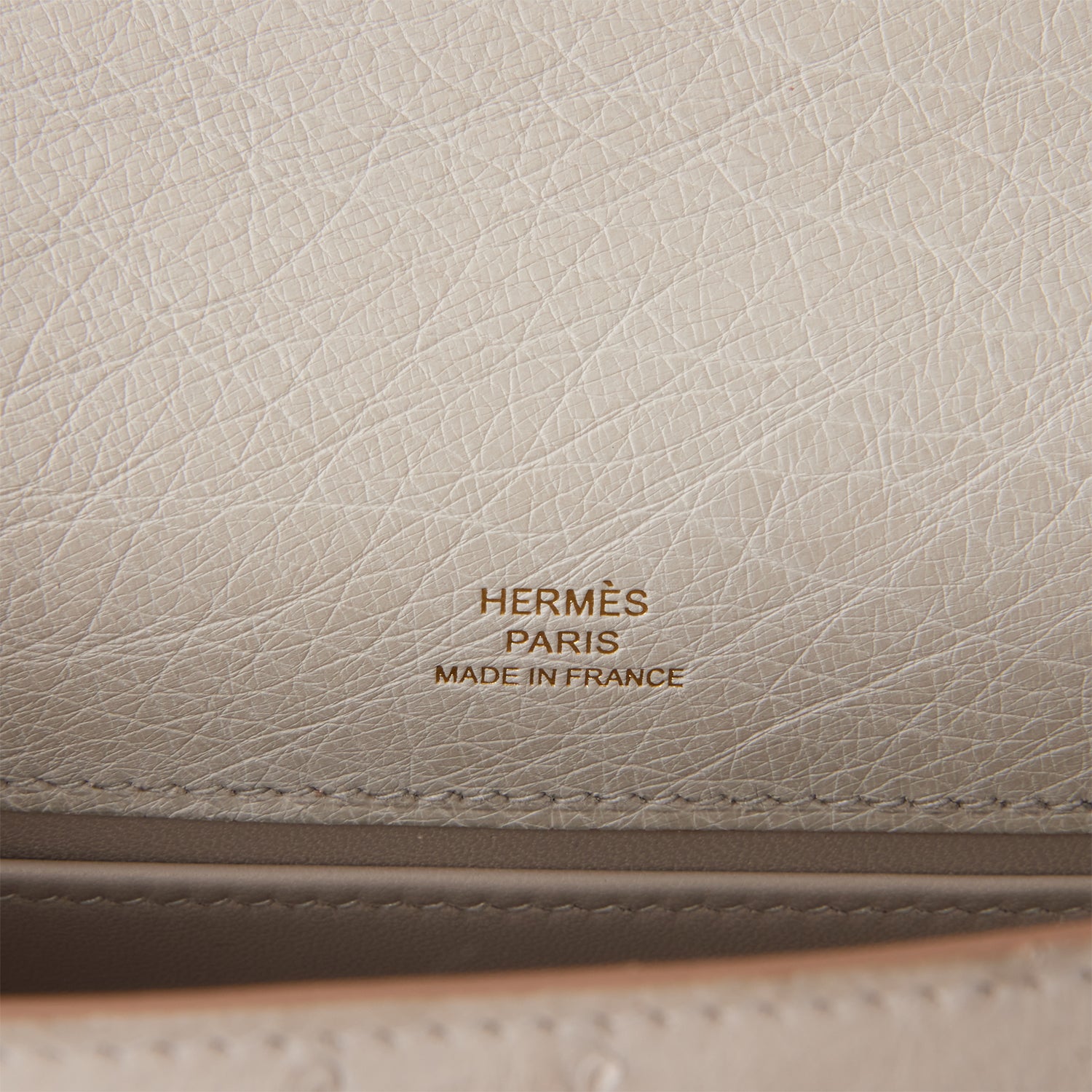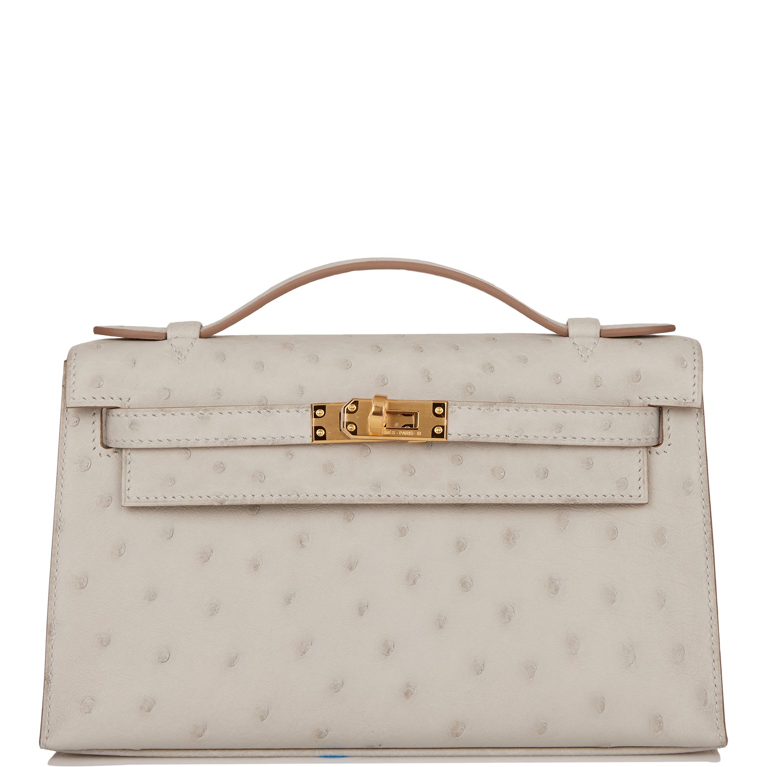 This Mini Kelly Pochette is in Gris Perle ostrich with gold hardware and has tonal stitching, front flap, two straps with center toggle closure and a top flat handle.
