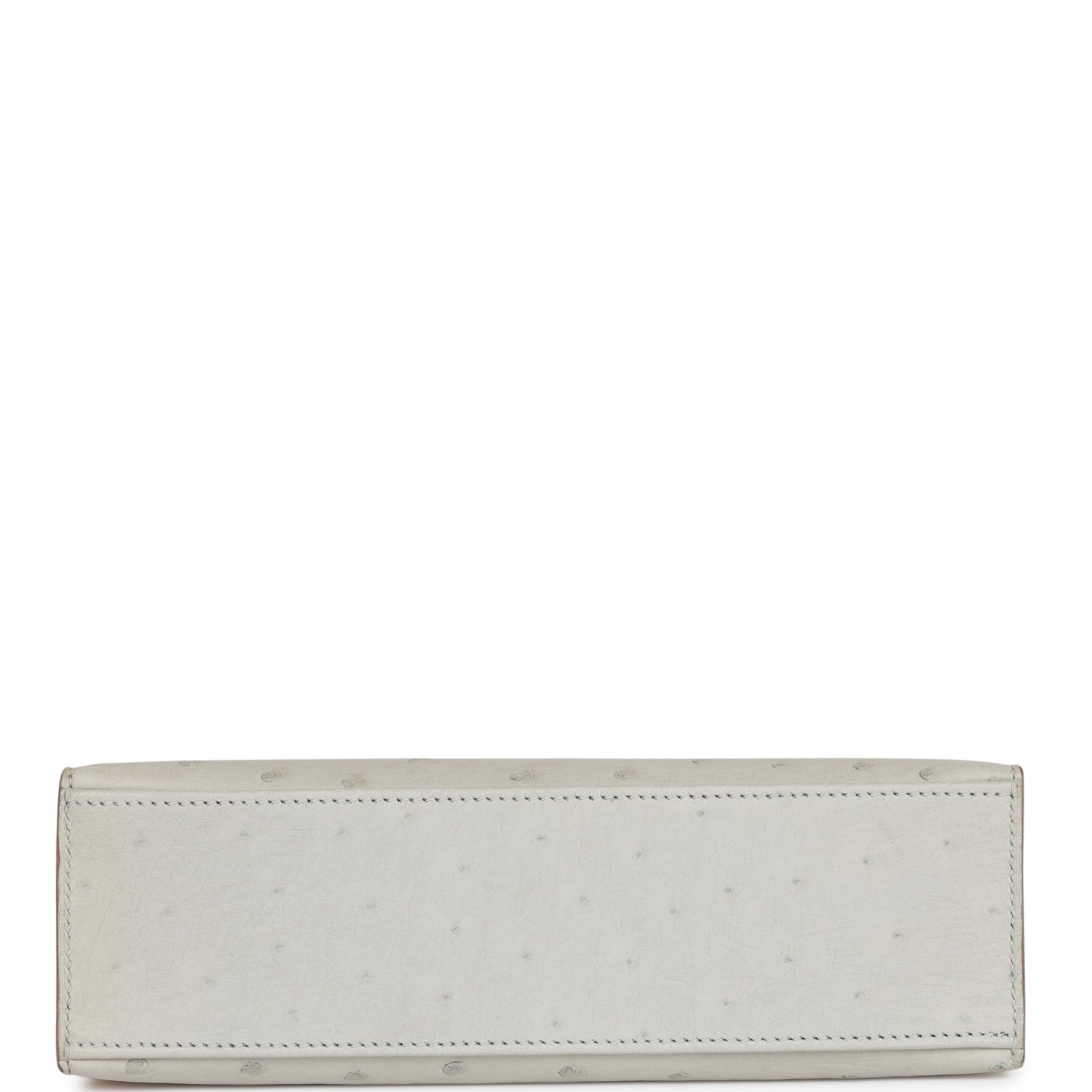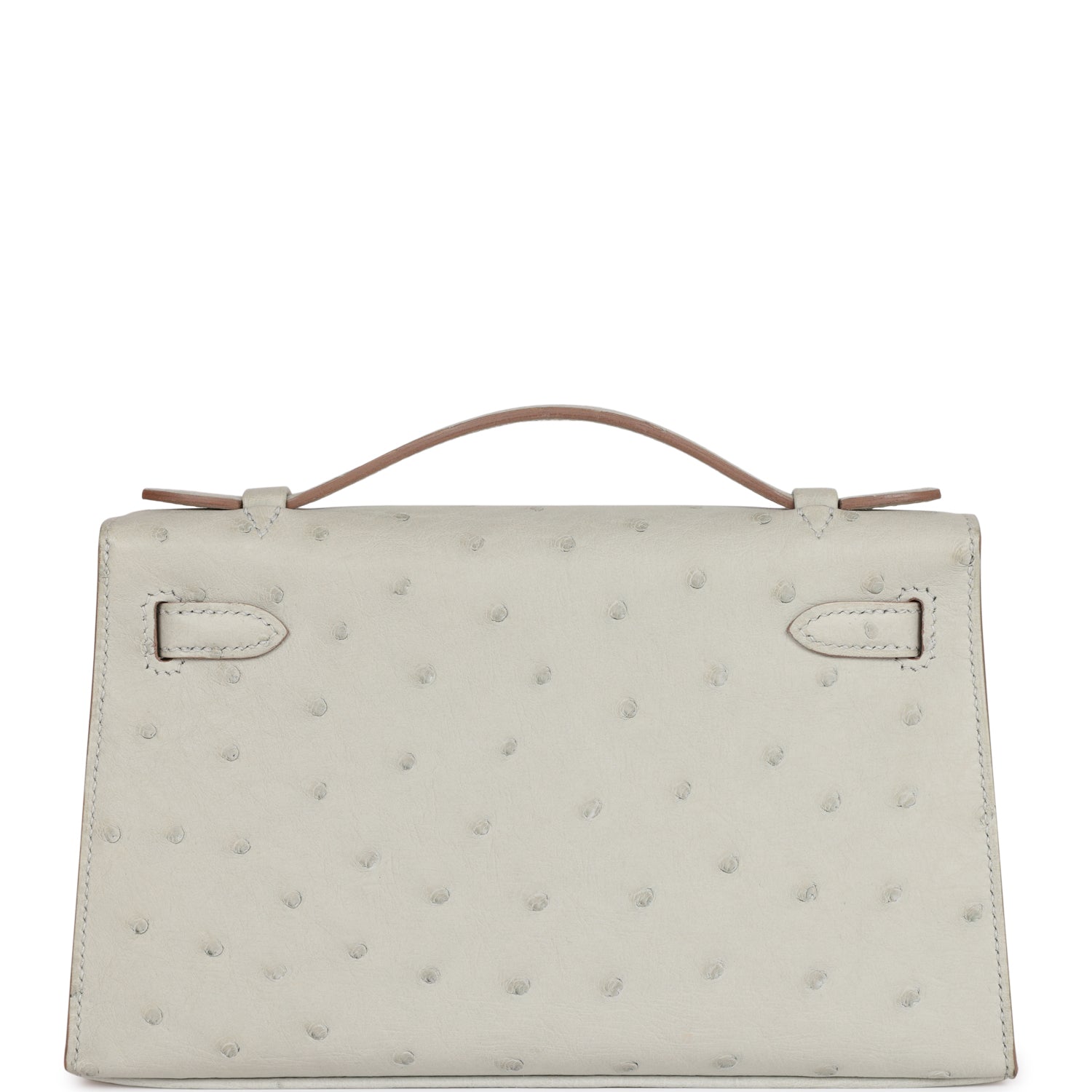 This Mini Kelly Pochette is in Gris Perle ostrich with palladium hardware and has tonal stitching, front flap, two straps with center toggle closure and a top flat handle.