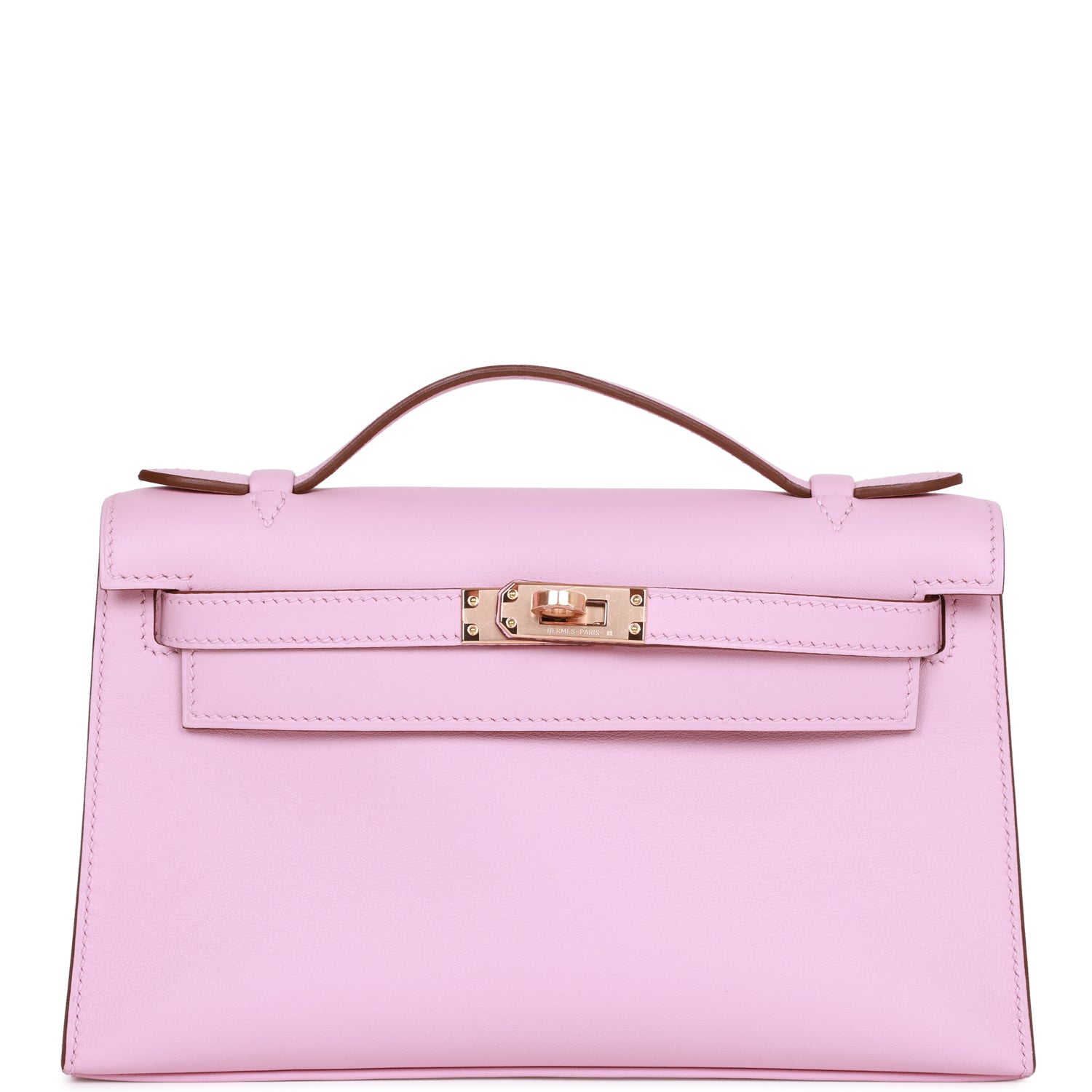 This Mini Kelly Pochette is in Mauve Sylvestre swift leather with rose gold hardware and has tonal stitching, front flap, two straps with center toggle closure and a top flat handle.