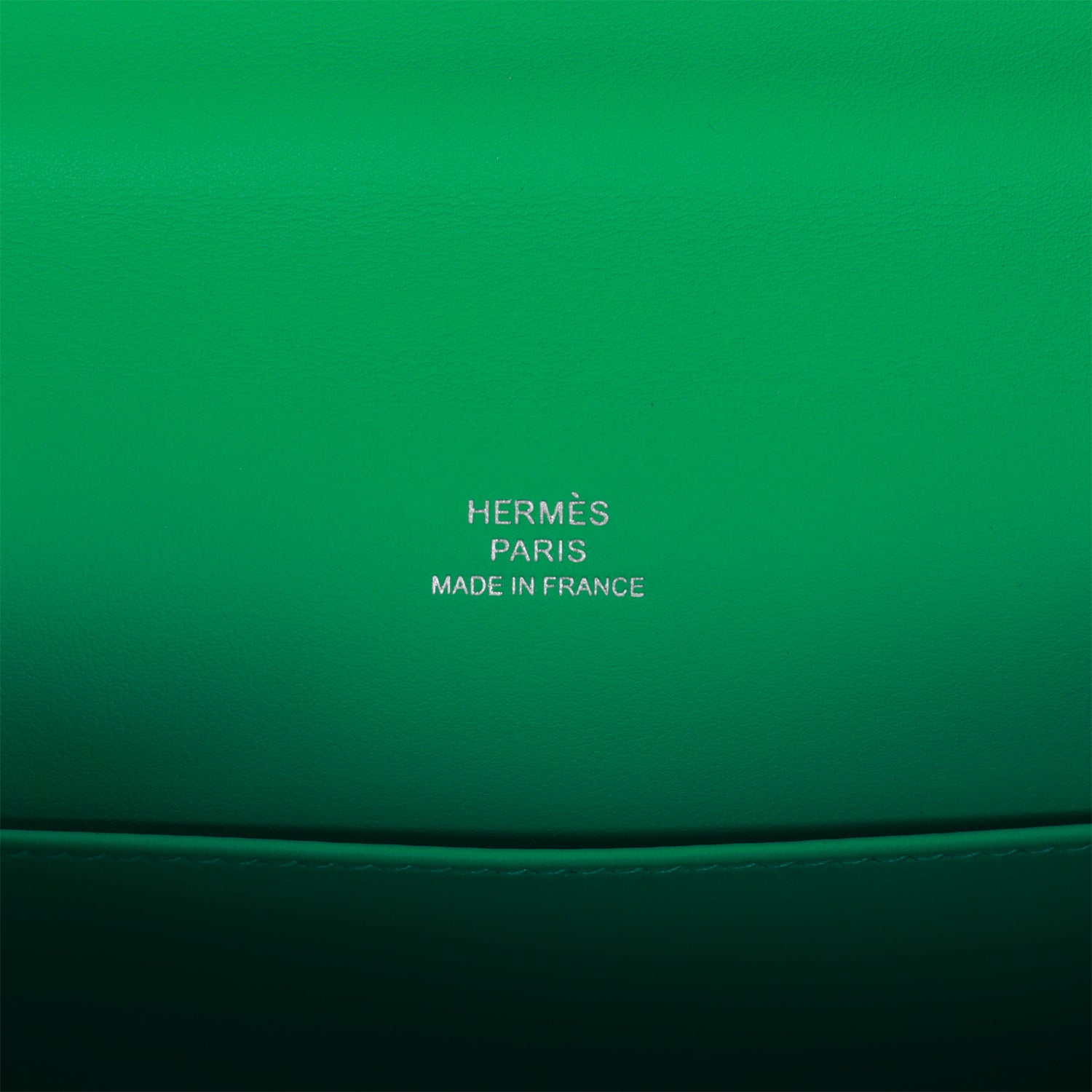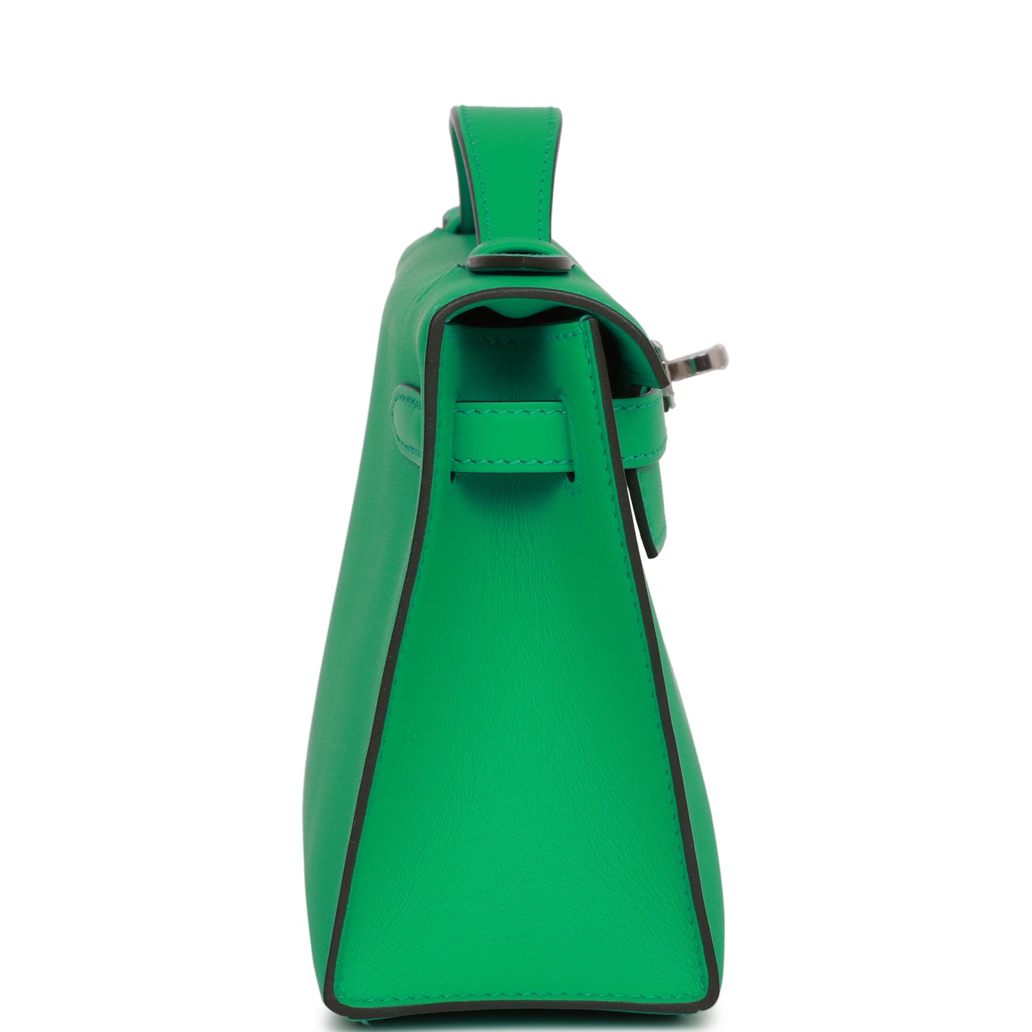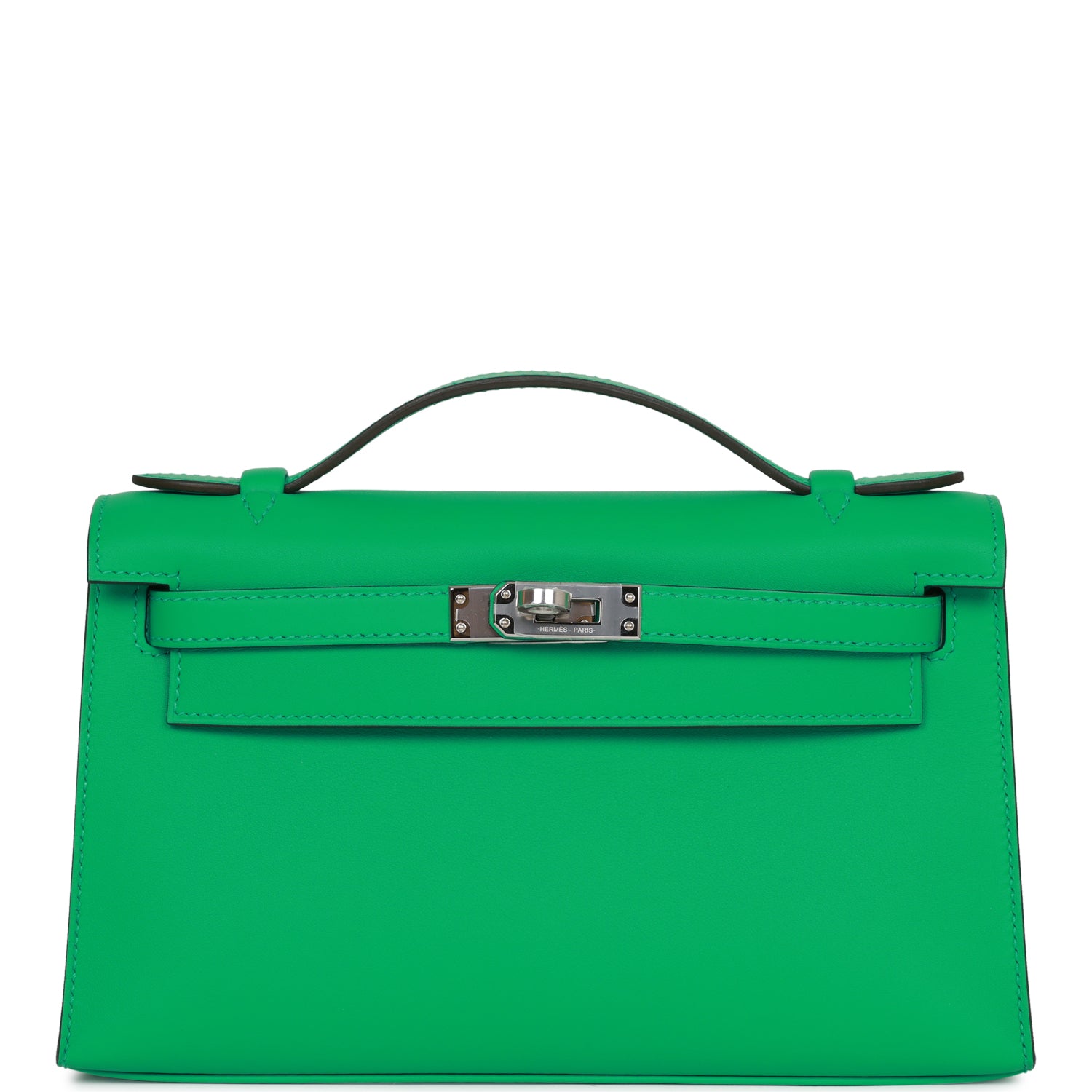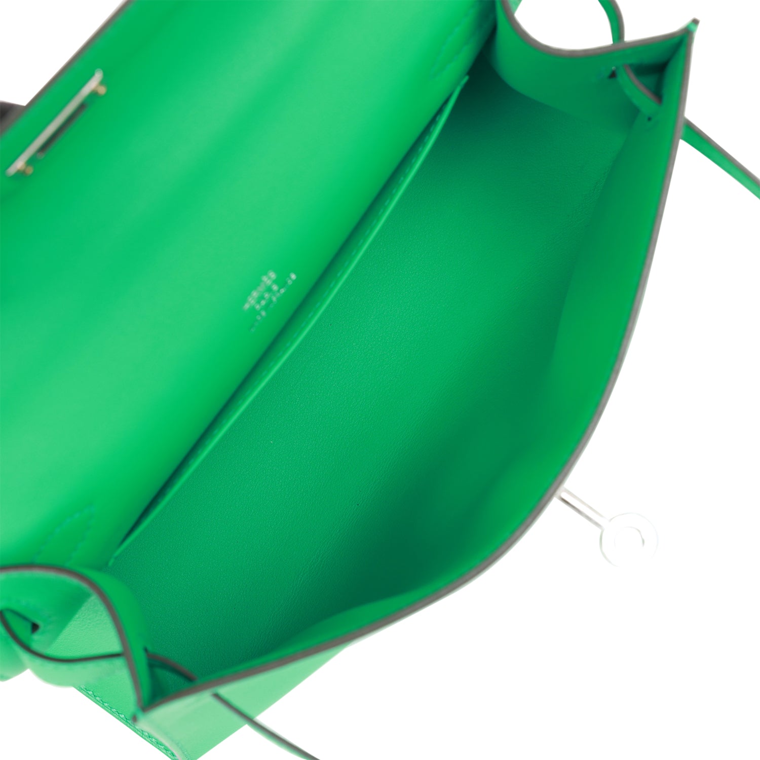This Mini Kelly Pochette is in Menthe swift leather with palladium hardware and has tonal stitching, front flap, two straps with center toggle closure and a top flat handle.