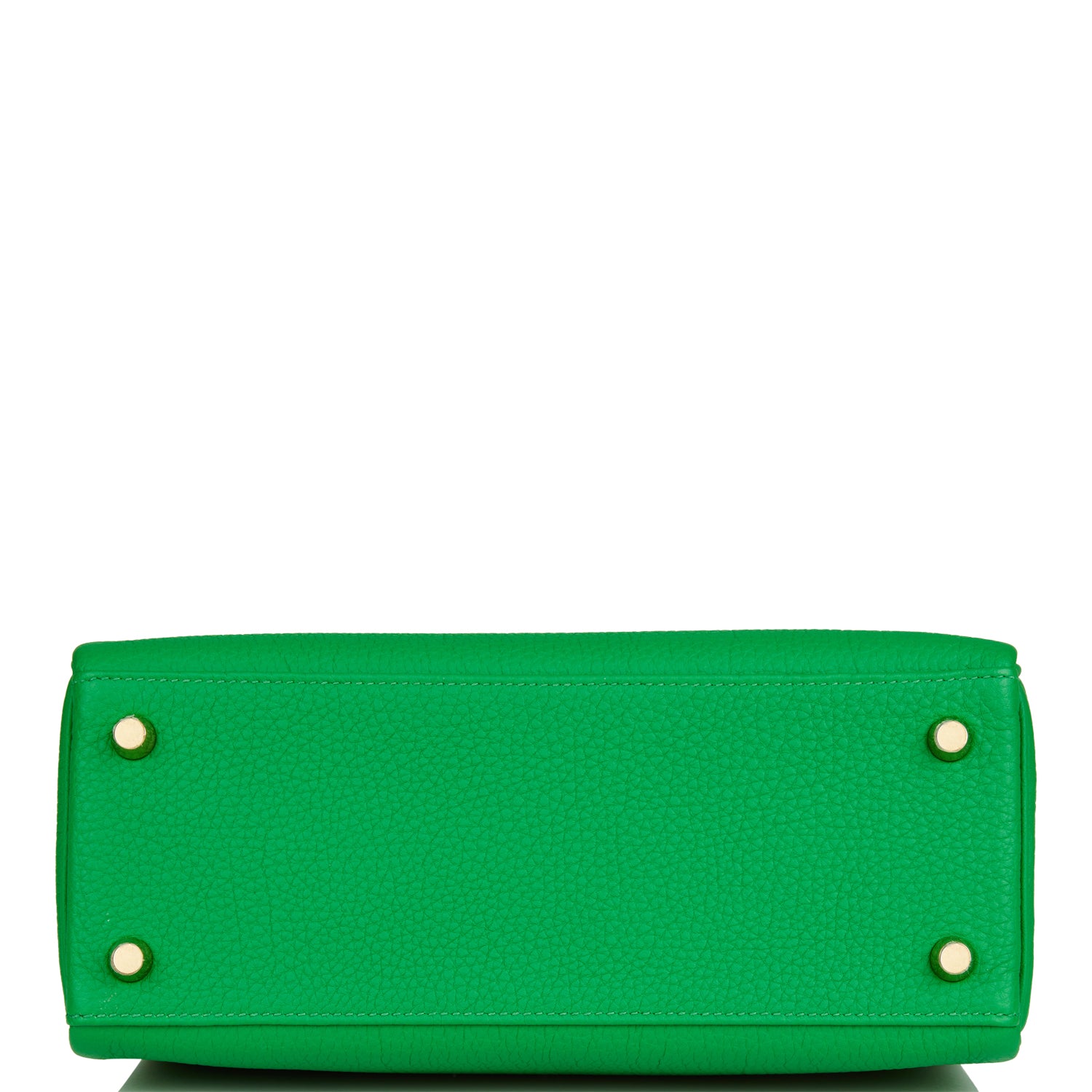 This Retourne Kelly is of Bambou togo leather with gold hardware and has tonal stitching, front flap, two straps with center toggle closure, clochette with lock and two keys, single rolled handle and an optional shoulder strap.