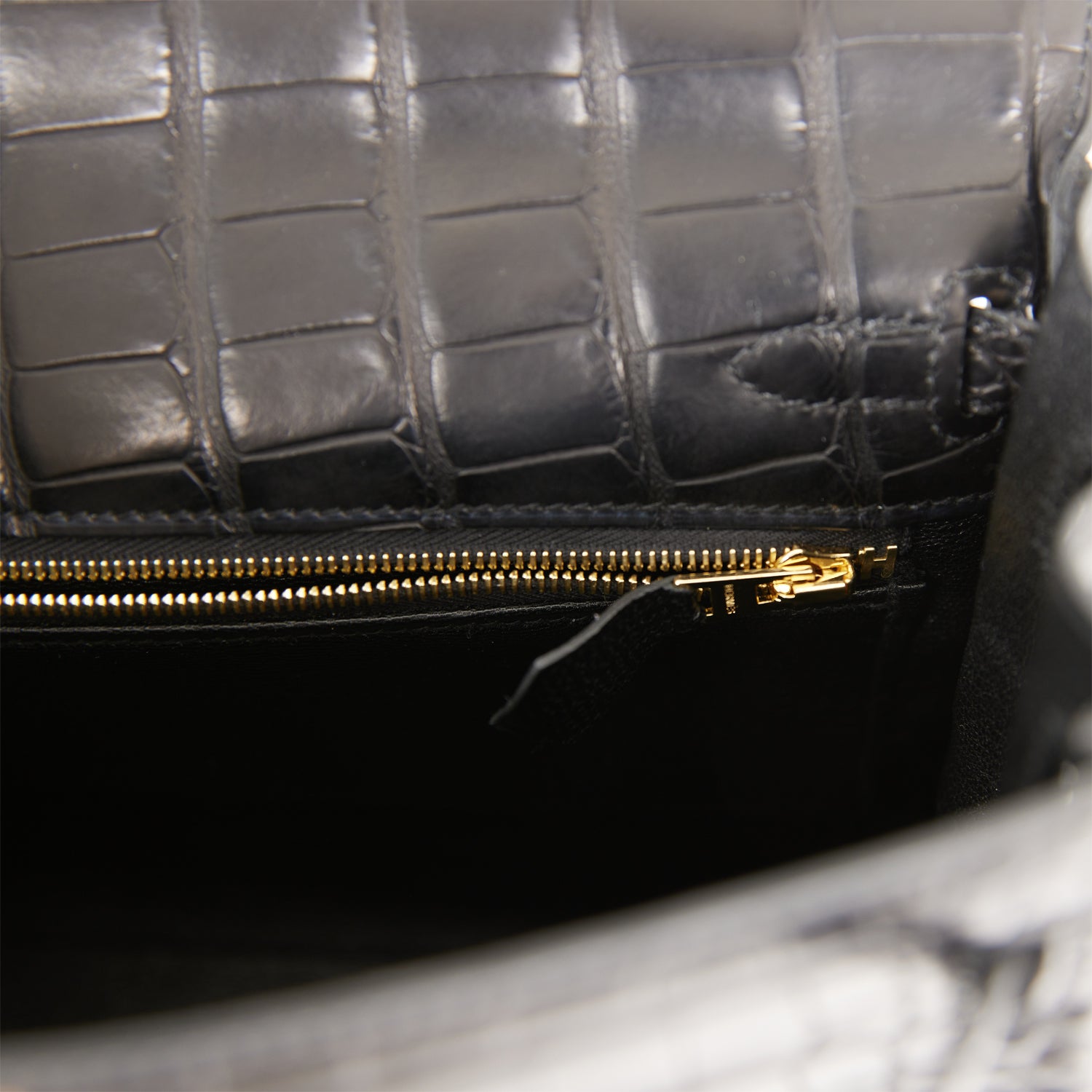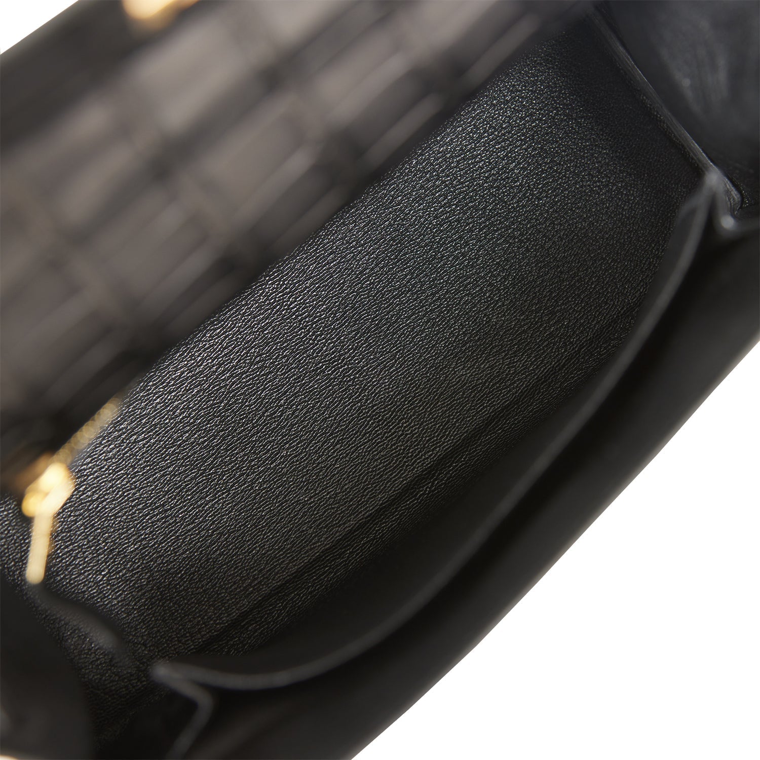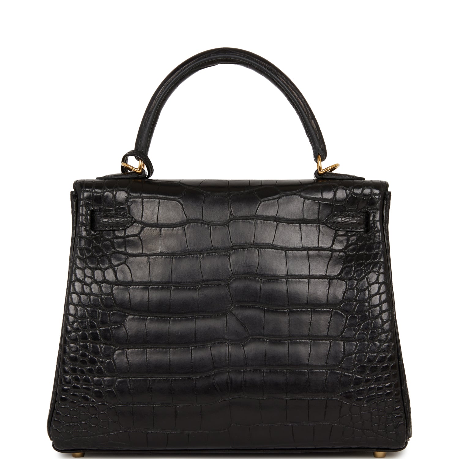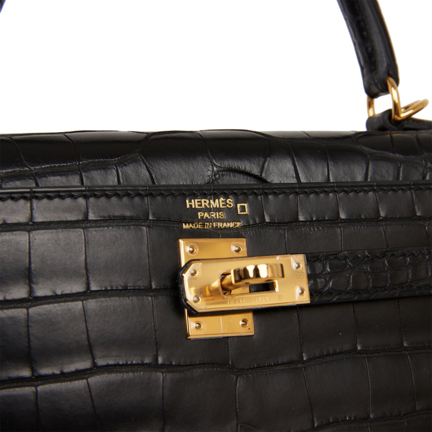 This Retourne Kelly is in Black matte Mississippiensis alligator with gold hardware and has tonal stitching, front flap, two straps with center toggle closure, clochette with lock and two keys, single rolled handle and removable strap.