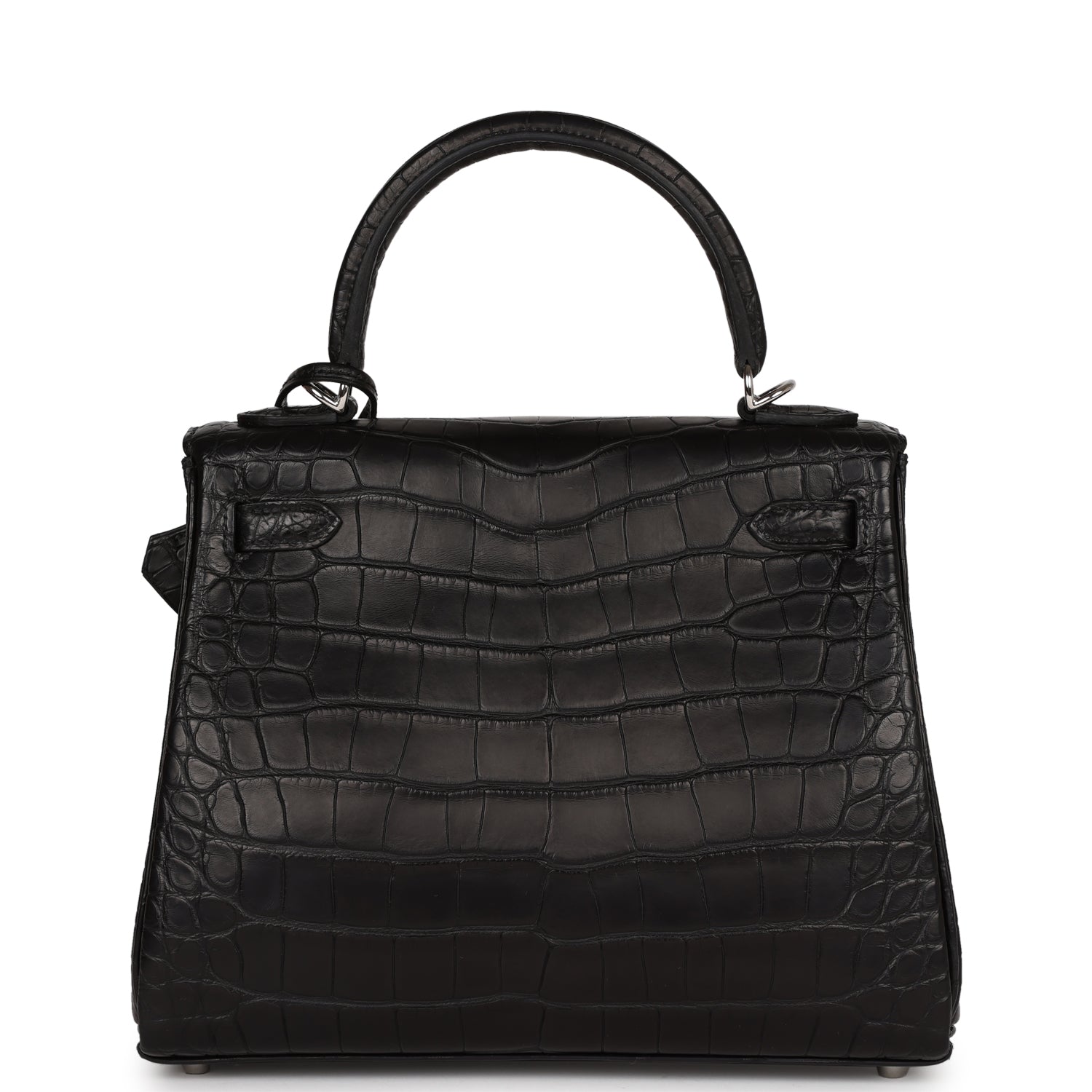 This Retourne Kelly is in Black matte Mississippiensis alligator with palladium hardware and has tonal stitching, front flap, two straps with center toggle closure, clochette with lock and two keys, single rolled handle and removable strap.