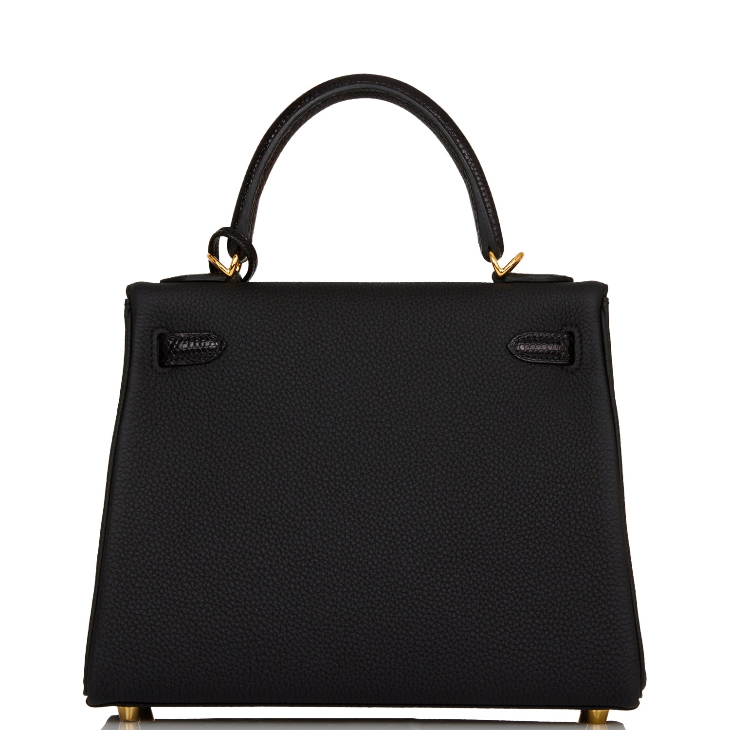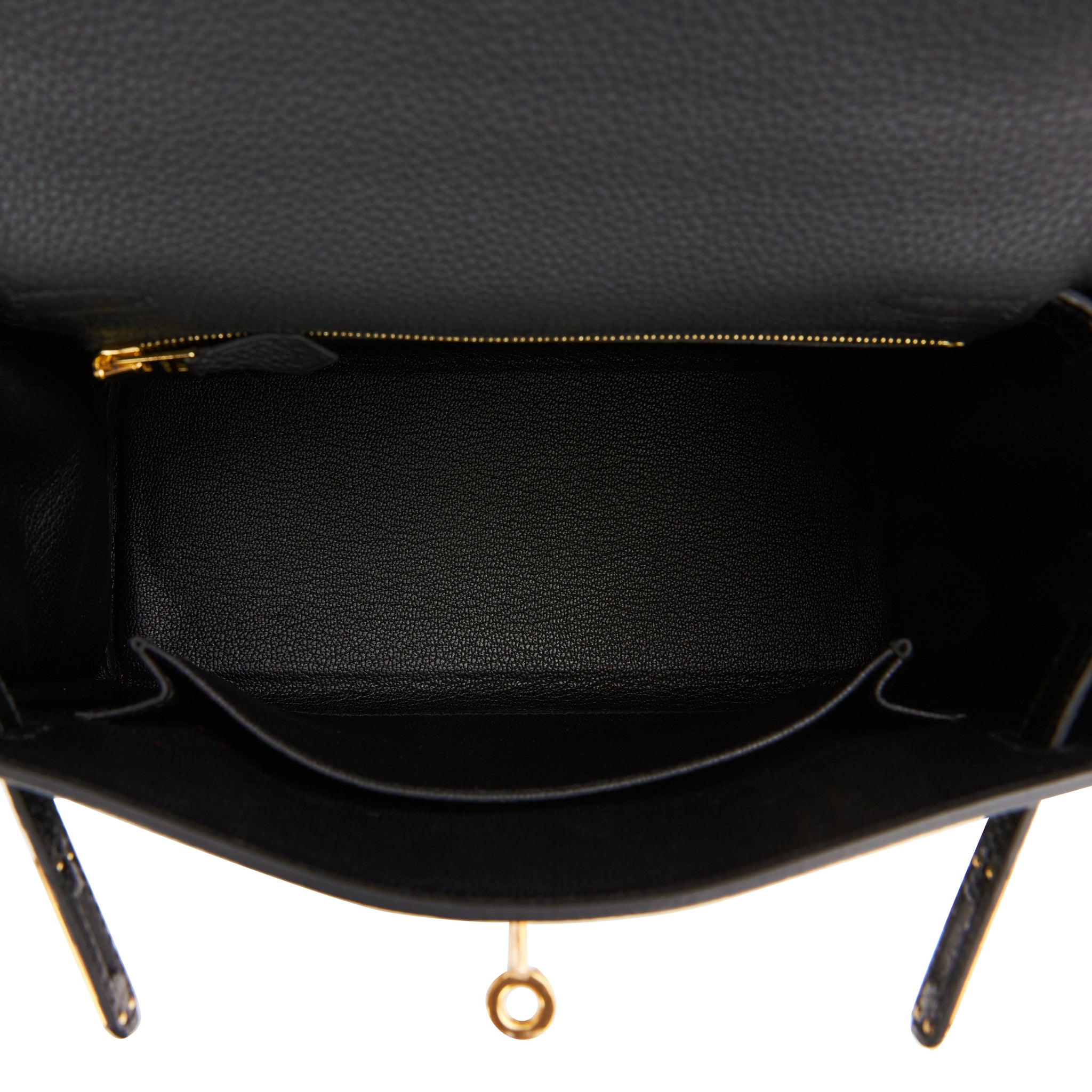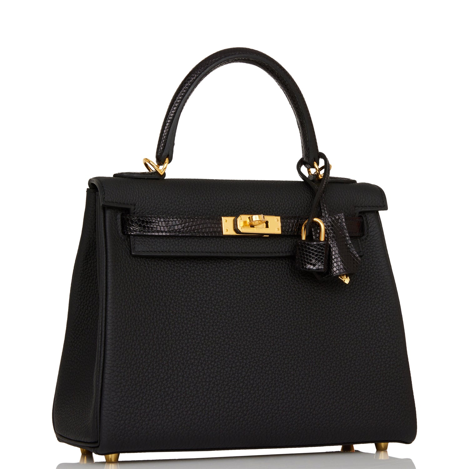 This Kelly, in the Retourne style, is in Black togo leather and Lizard with gold hardware and has tonal stitching,front flap, two straps with center toggle closure, clochette with lock and two keys, single rolled black lizard top handle and removable shoulder strap.
