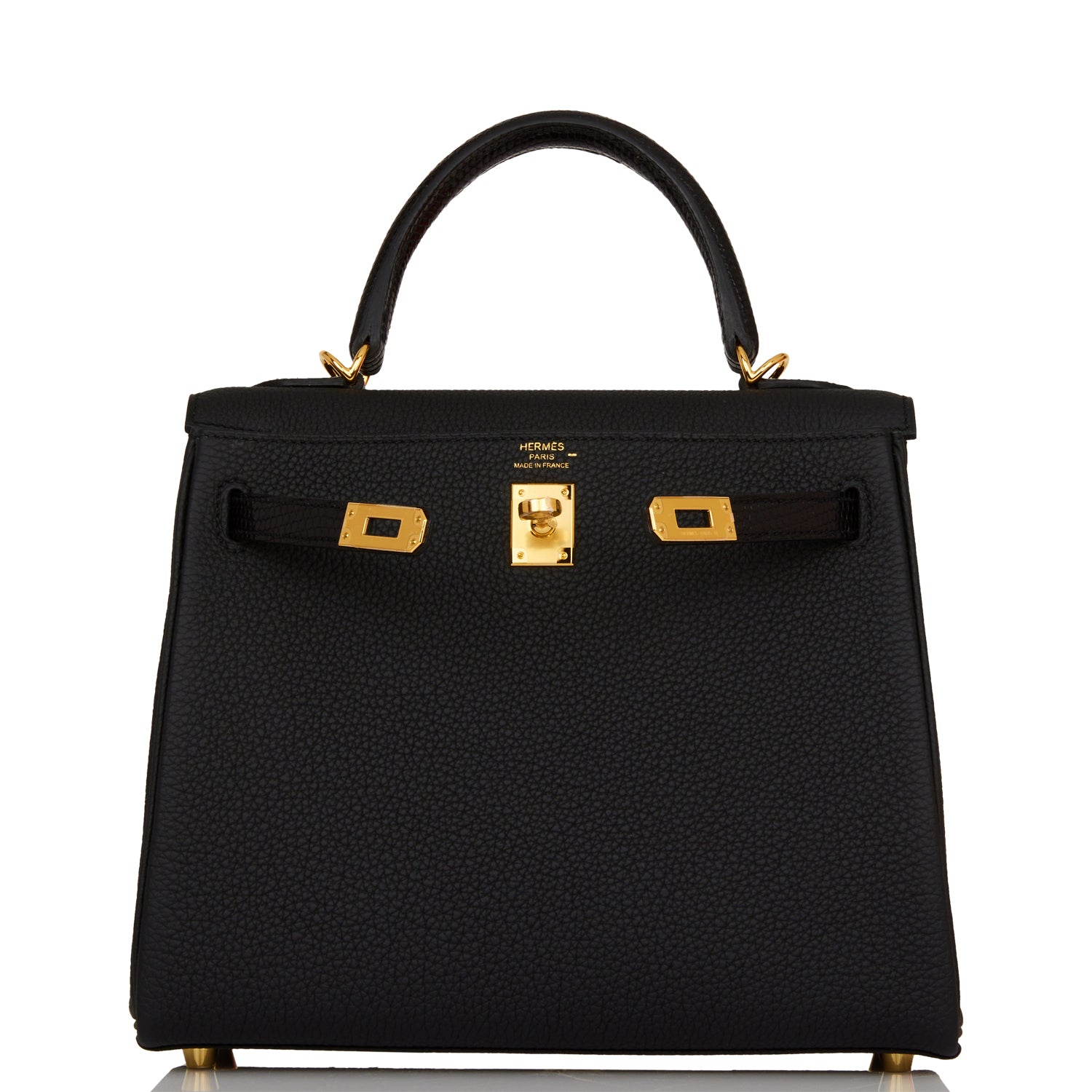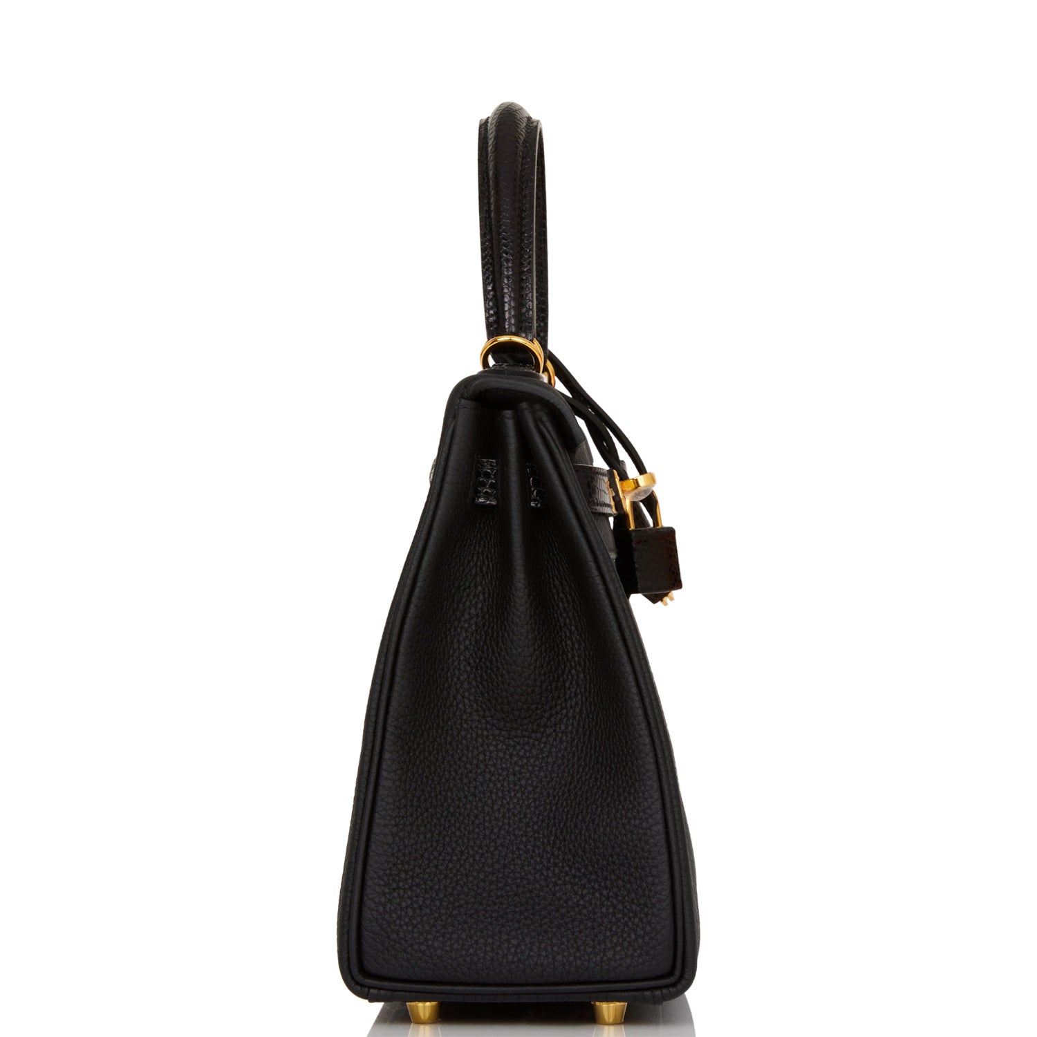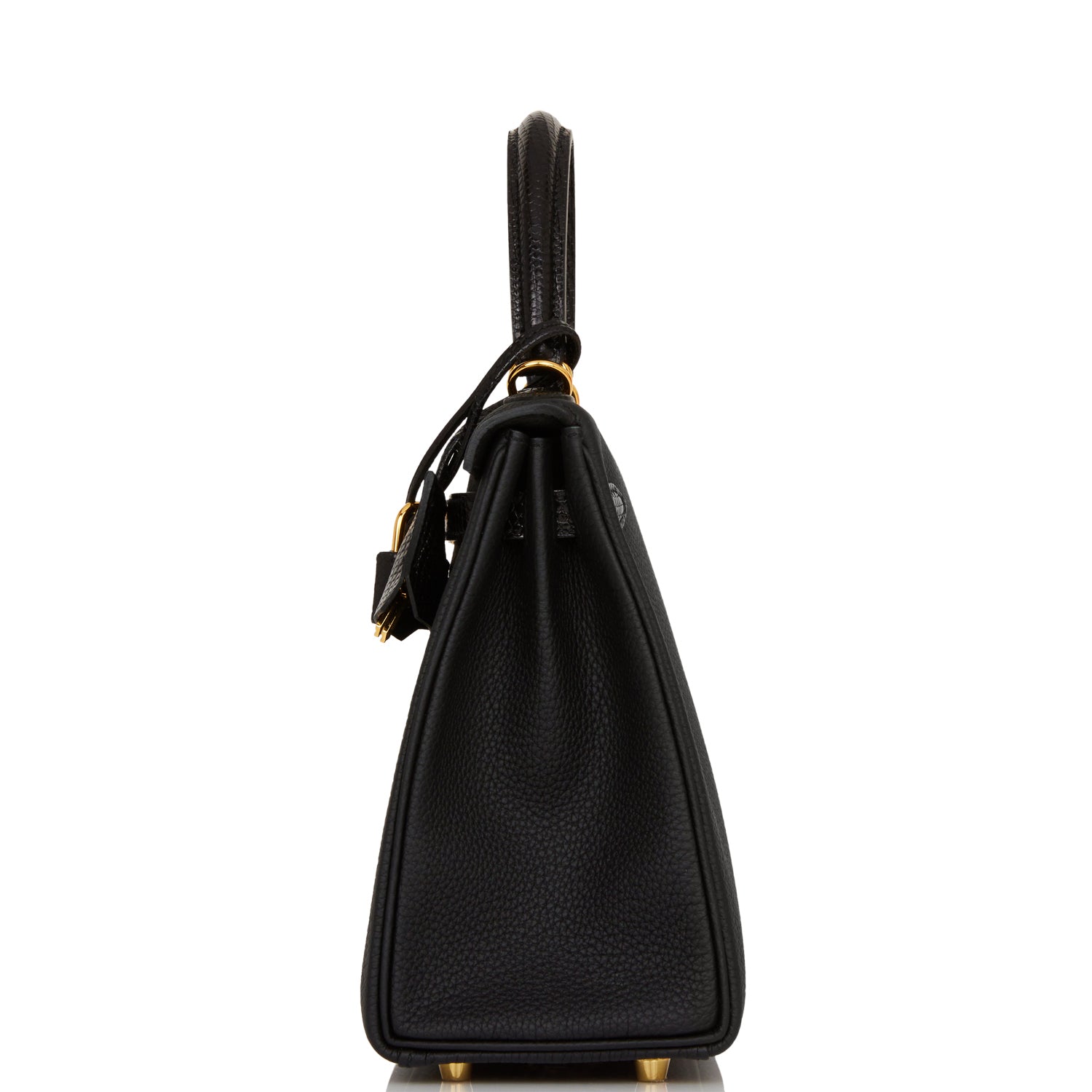 This Kelly, in the Retourne style, is in Black togo leather and Lizard with gold hardware and has tonal stitching,front flap, two straps with center toggle closure, clochette with lock and two keys, single rolled black lizard top handle and removable shoulder strap.
