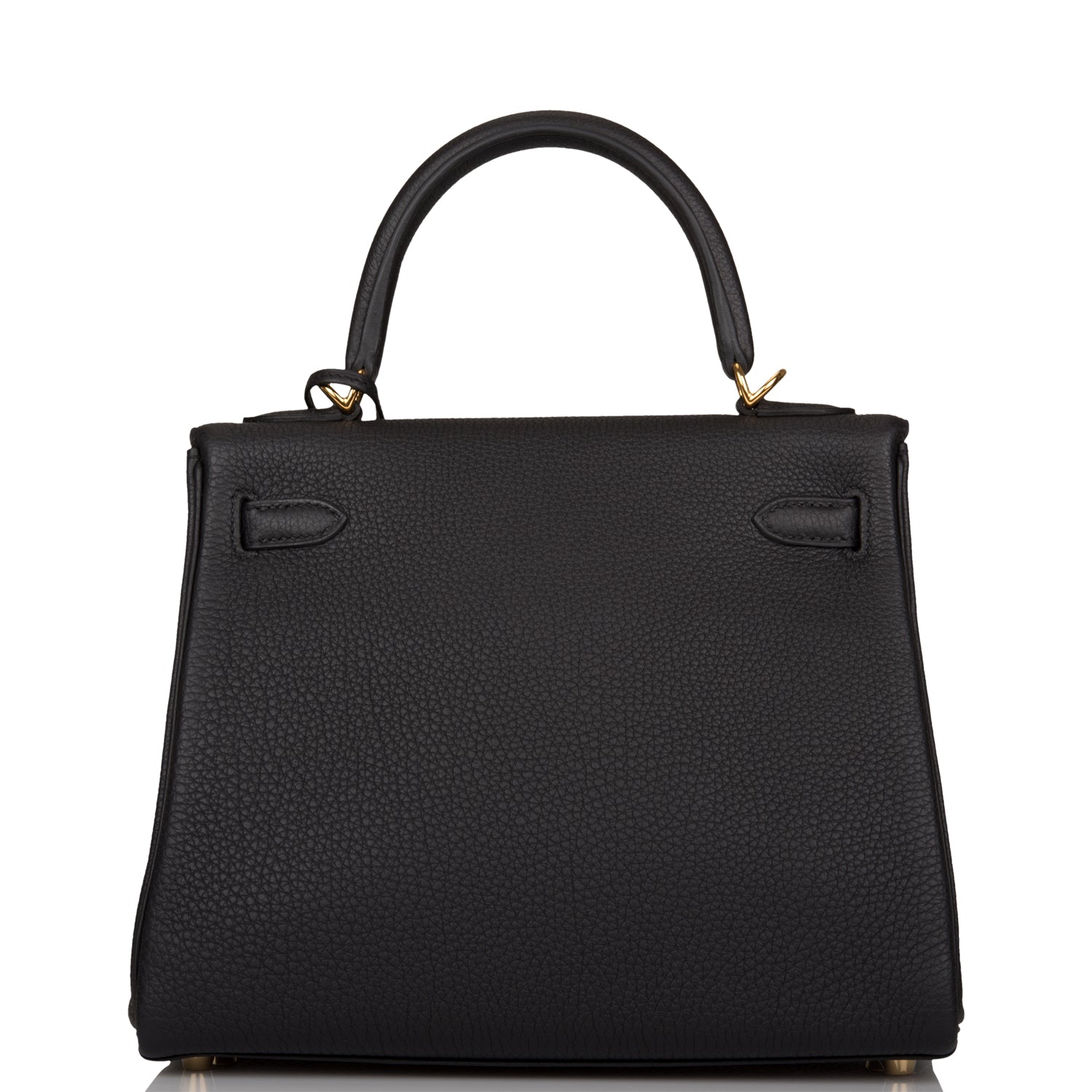 This Retourne Kelly is of black togo leather with gold hardware and has tonal stitching, front flap, two straps with center toggle closure, clochette with lock and two keys, single rolled handle and an optional shoulder strap.