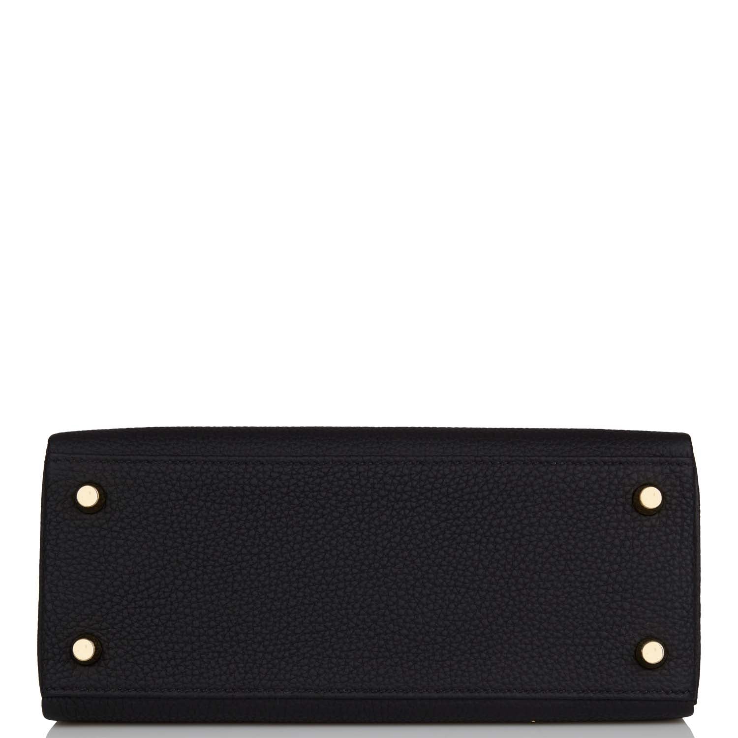 This Retourne Kelly is of black togo leather with gold hardware and has tonal stitching, front flap, two straps with center toggle closure, clochette with lock and two keys, single rolled handle and an optional shoulder strap.