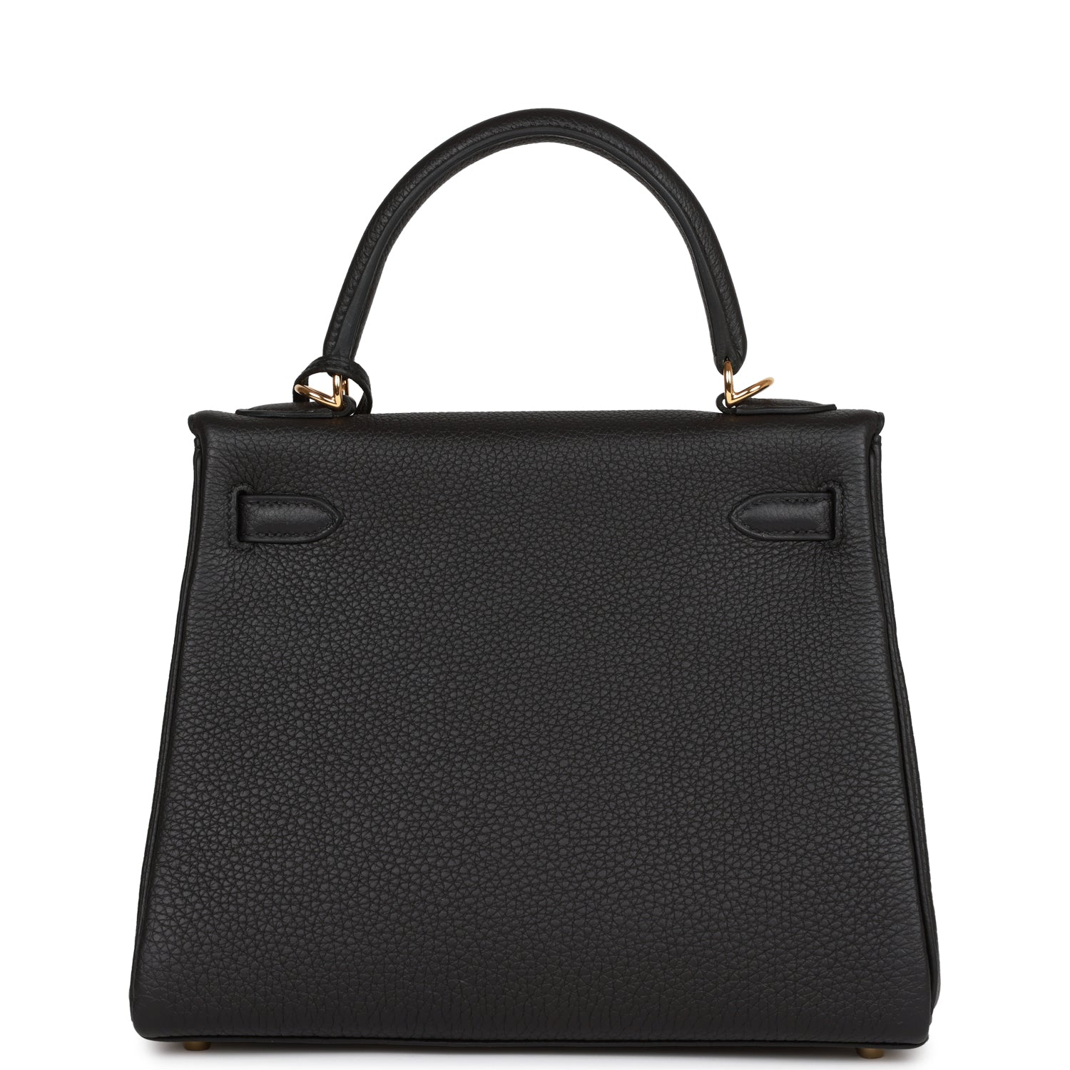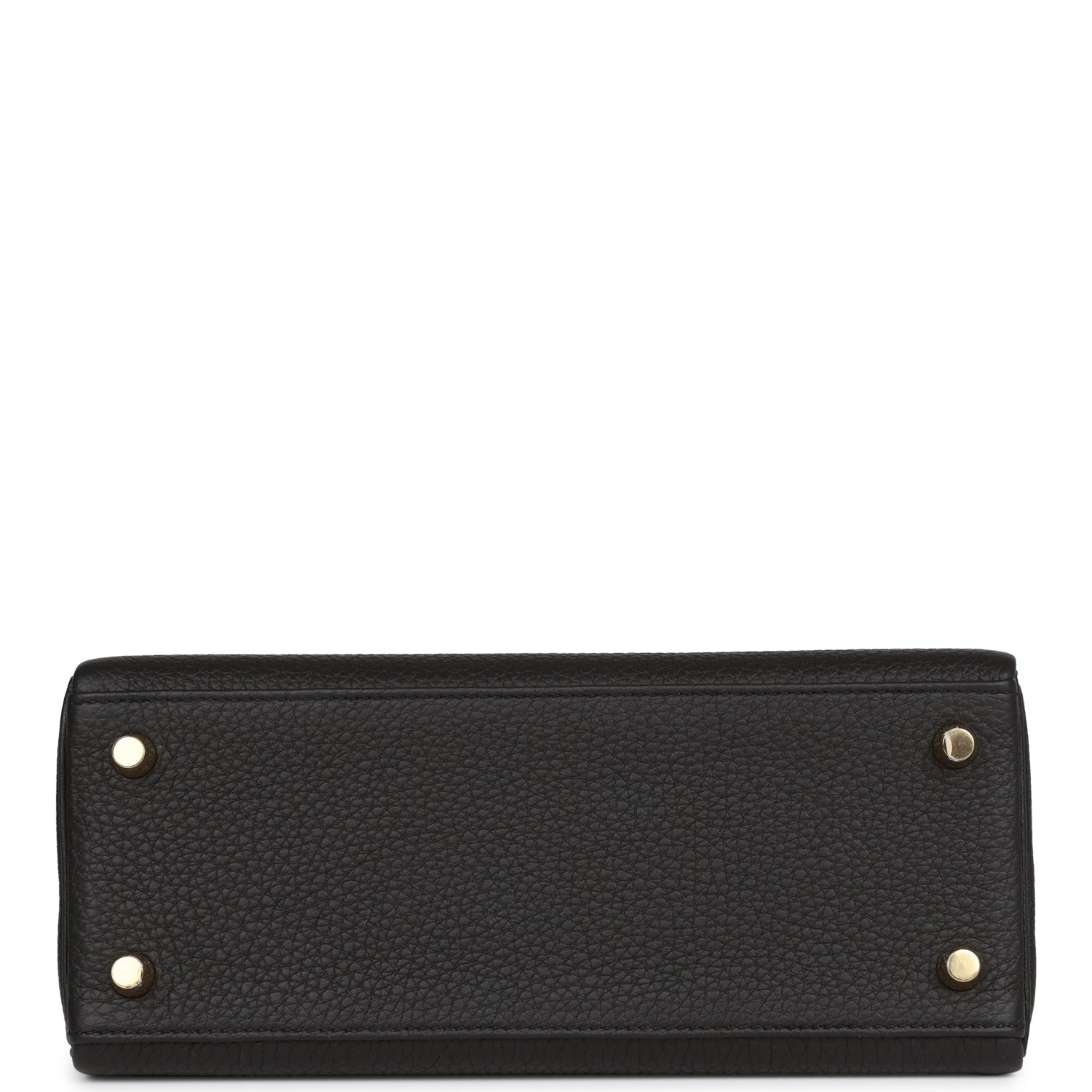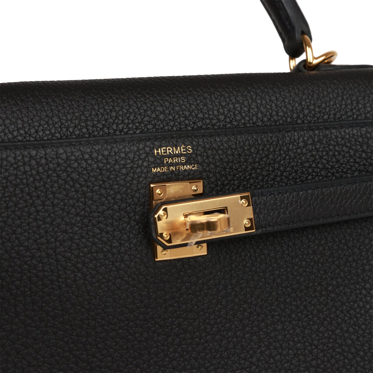 This Retourne Kelly is of black togo leather with gold hardware and has tonal stitching, front flap, two straps with center toggle closure, clochette with lock and two keys, single rolled handle and an optional shoulder strap.