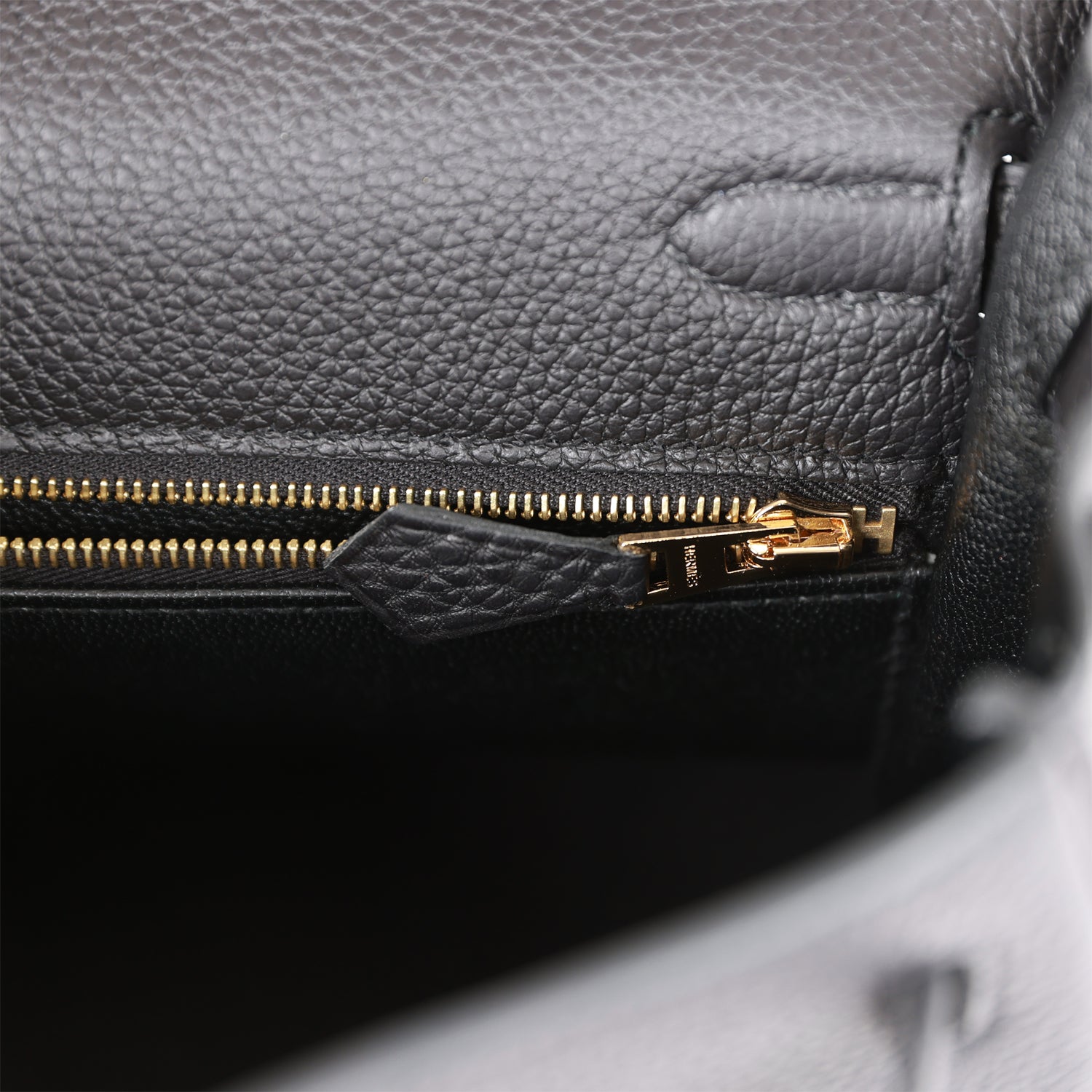 The interior is lined with black chevre leather and has one zip pocket with an Hermes engraved pull and one open pocket on the opposite side.