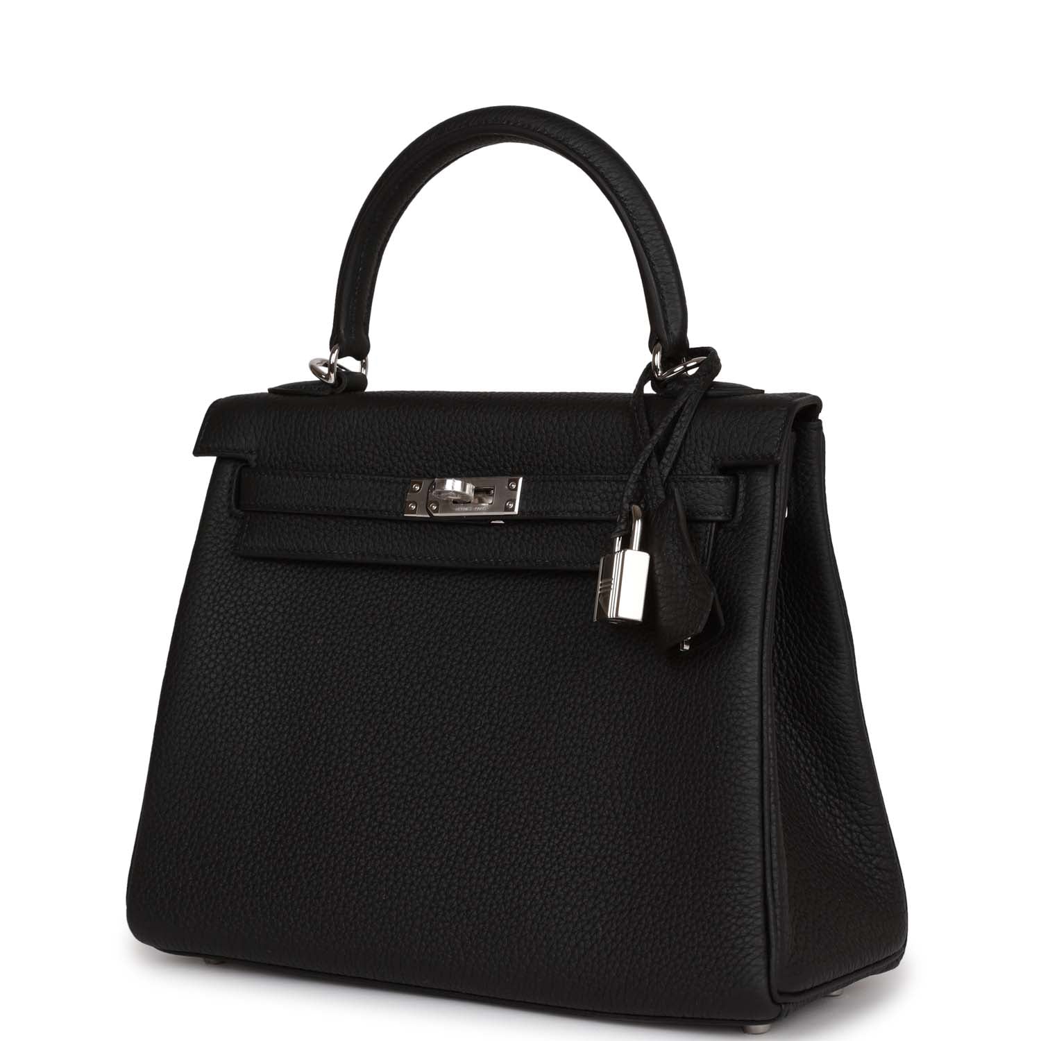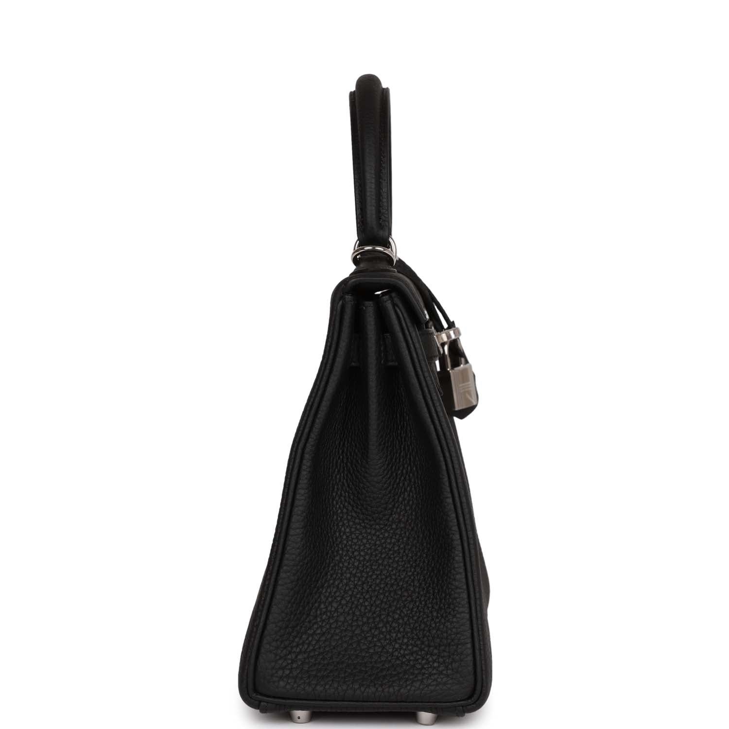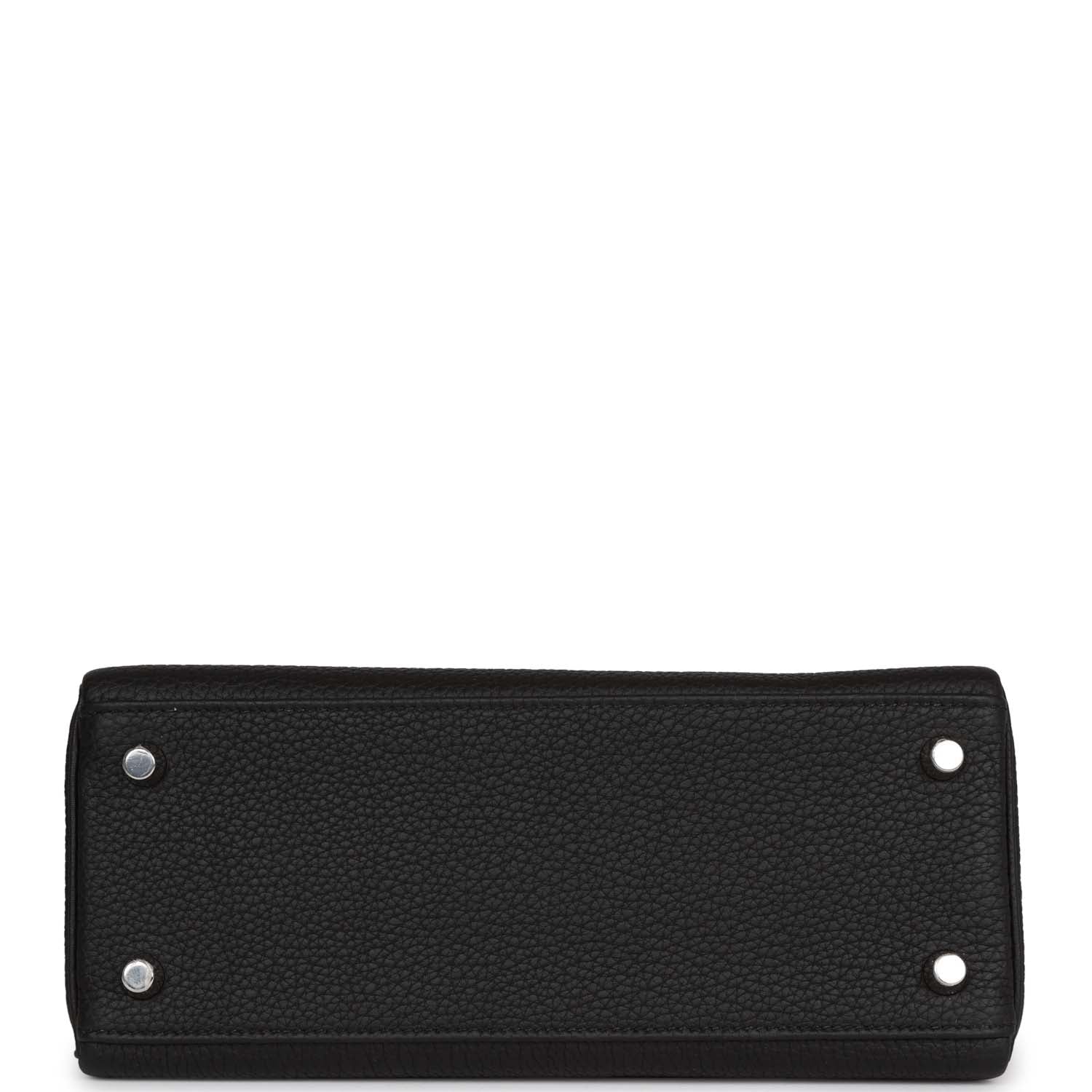 This Retourne Kelly is in Black togo leather with palladium hardware and has tonal stitching, front flap, two straps with center toggle closure, clochette with lock and two keys, single rolled handle and an optional shoulder strap.