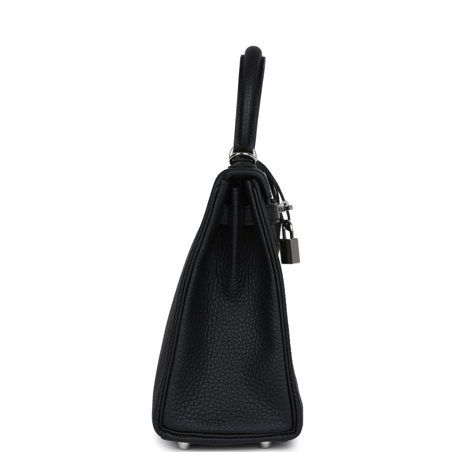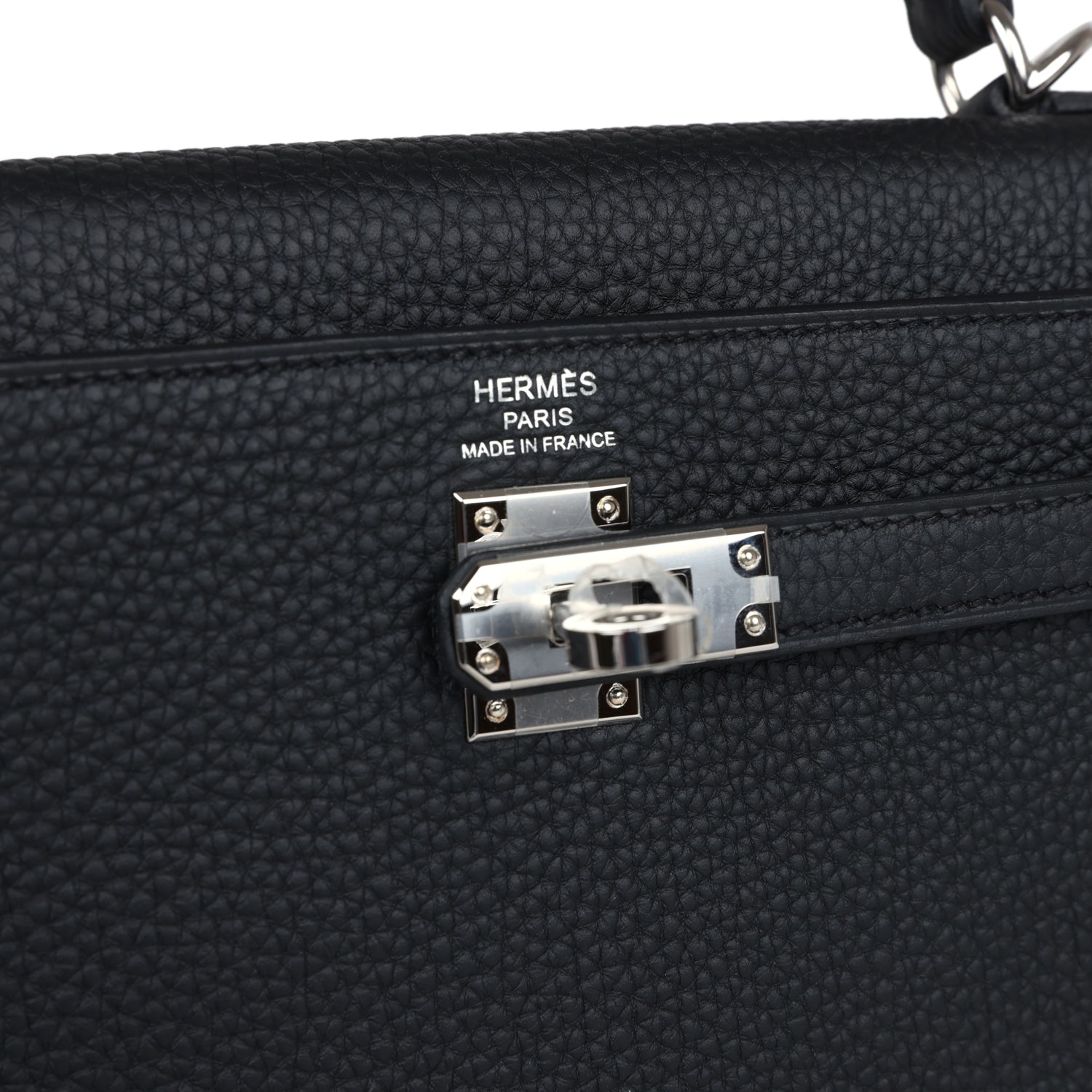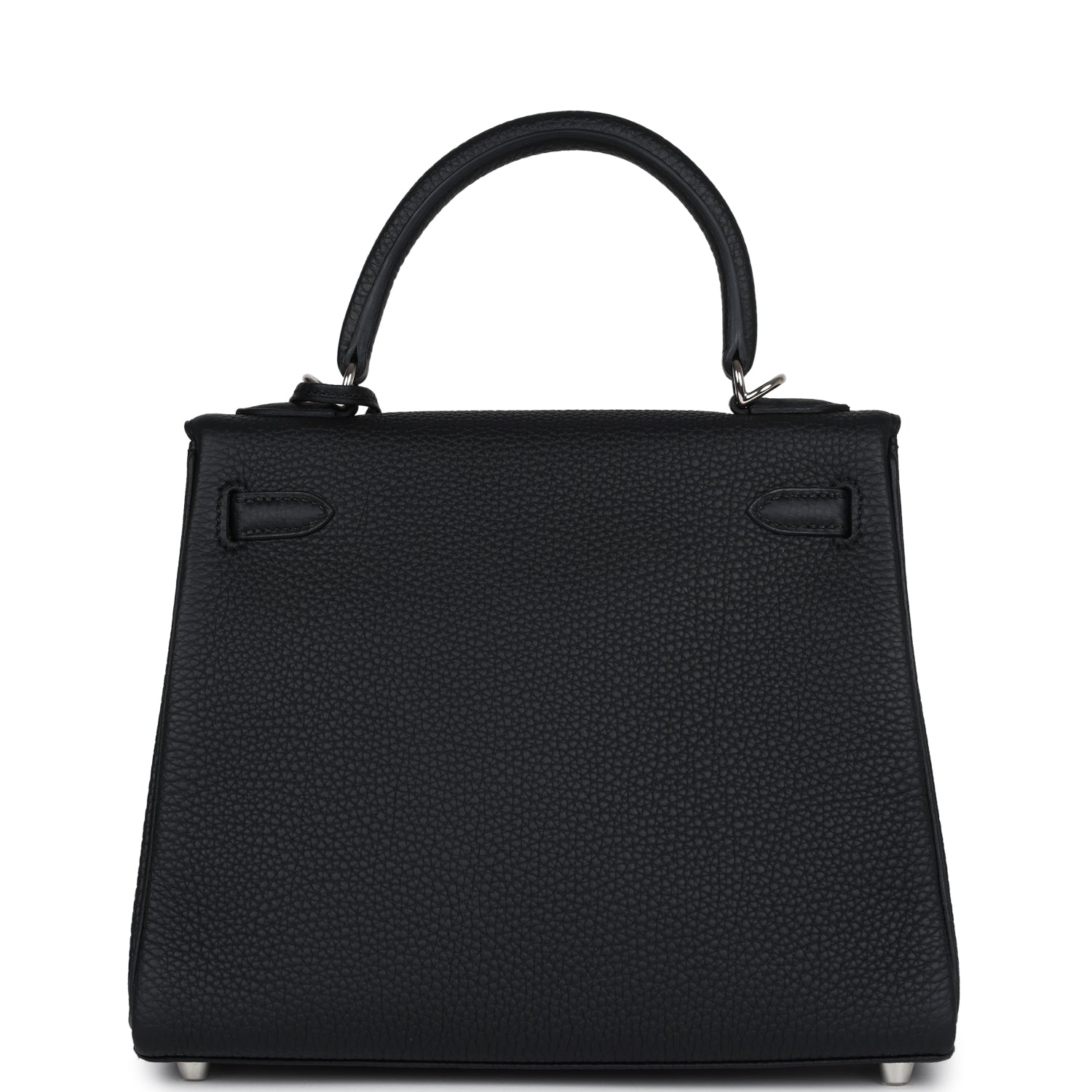This Retourne Kelly is in Black togo leather with palladium hardware and has tonal stitching, front flap, two straps with center toggle closure, clochette with lock and two keys, single rolled handle and an optional shoulder strap.