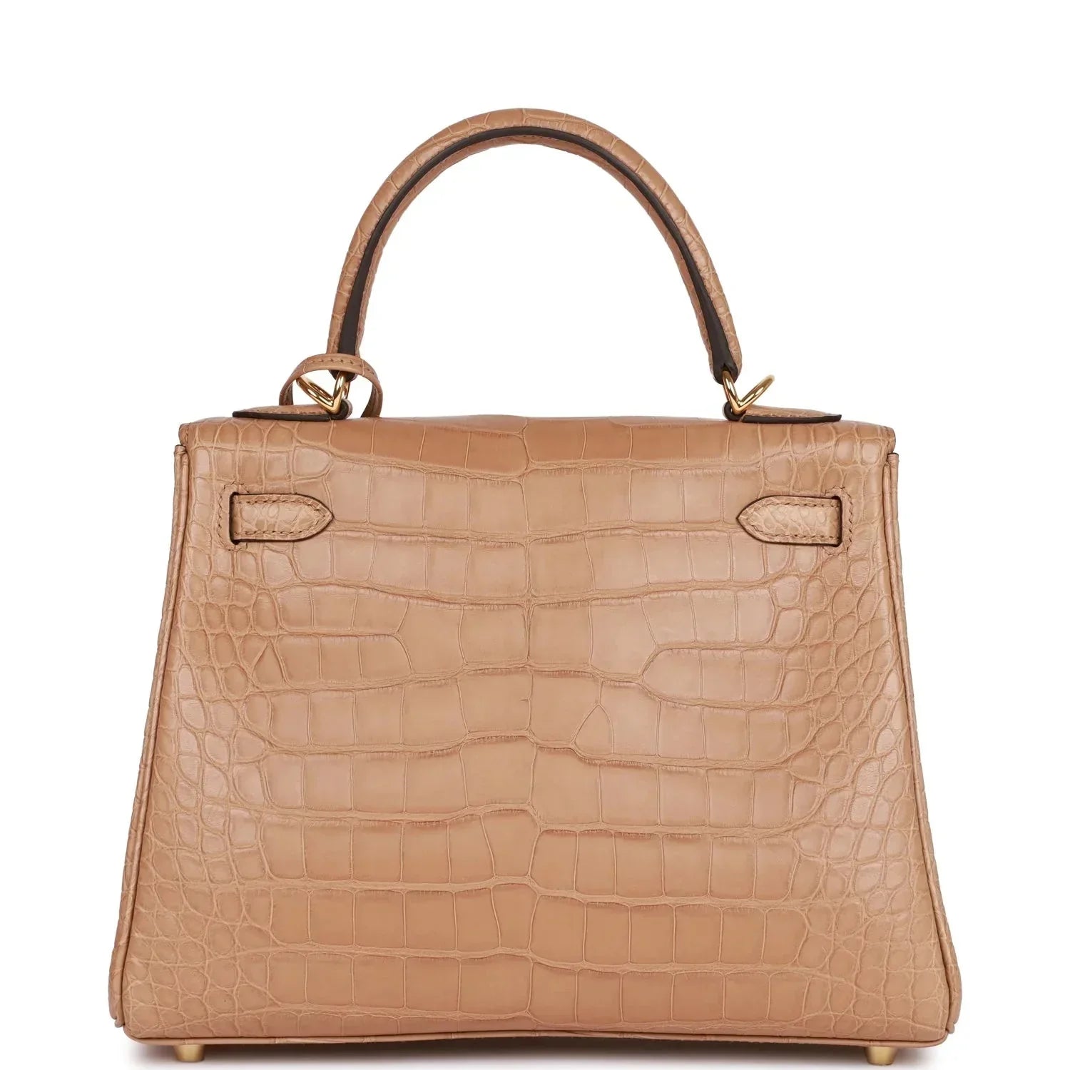 This Retourne Kelly is in Chai matte Mississippiensis alligator with gold hardware and has tonal stitching, front flap, two straps with center toggle closure, clochette with lock and two keys, single rolled handle and removable strap.