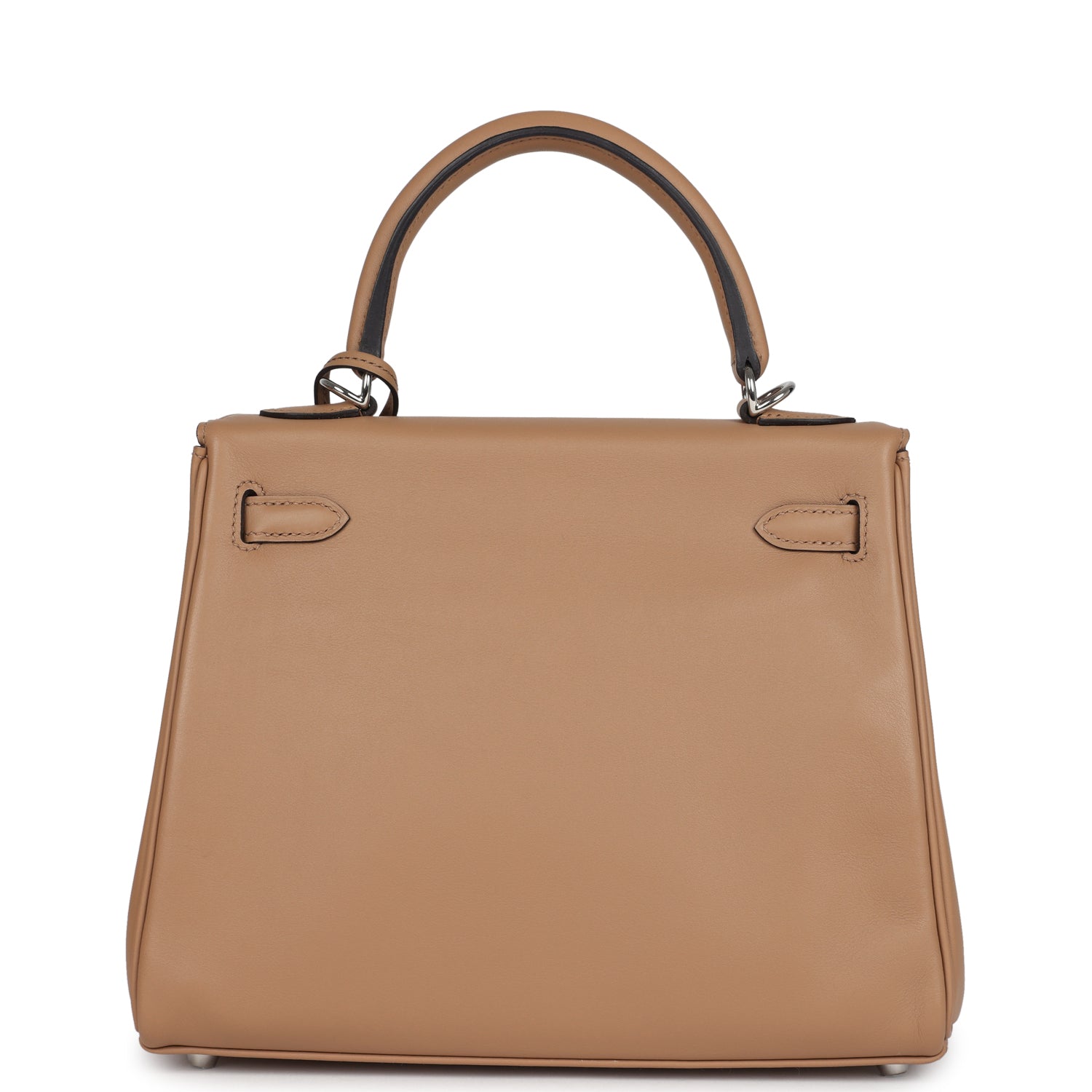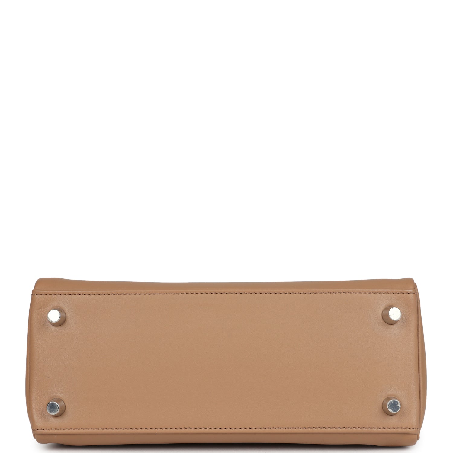 This Kelly, in the Retourne style, is in Chai swift leather with palladium hardware and has tonal stitching, front flap, two straps with center toggle closure, clochette with lock and two keys, single rolled handle and an optional shoulder strap.