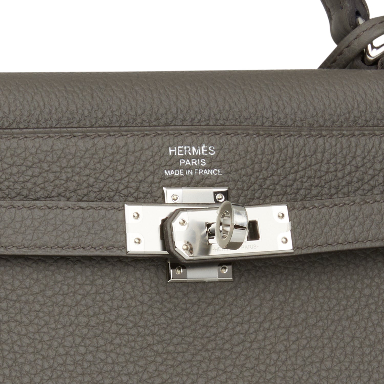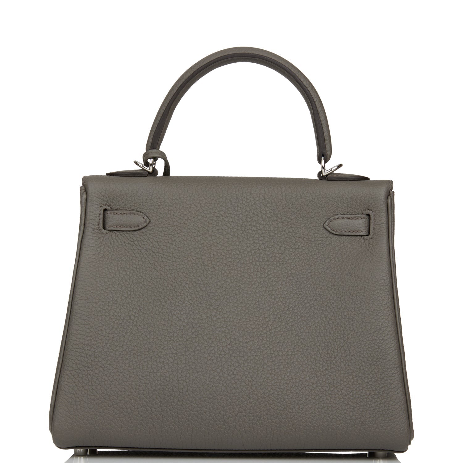 This Kelly, in the Retourne style, is in Etain togo leather with palladium hardware and has tonal stitching, front flap, two straps with center toggle closure, clochette with lock and two keys, single rolled handle and removable shoulder strap.